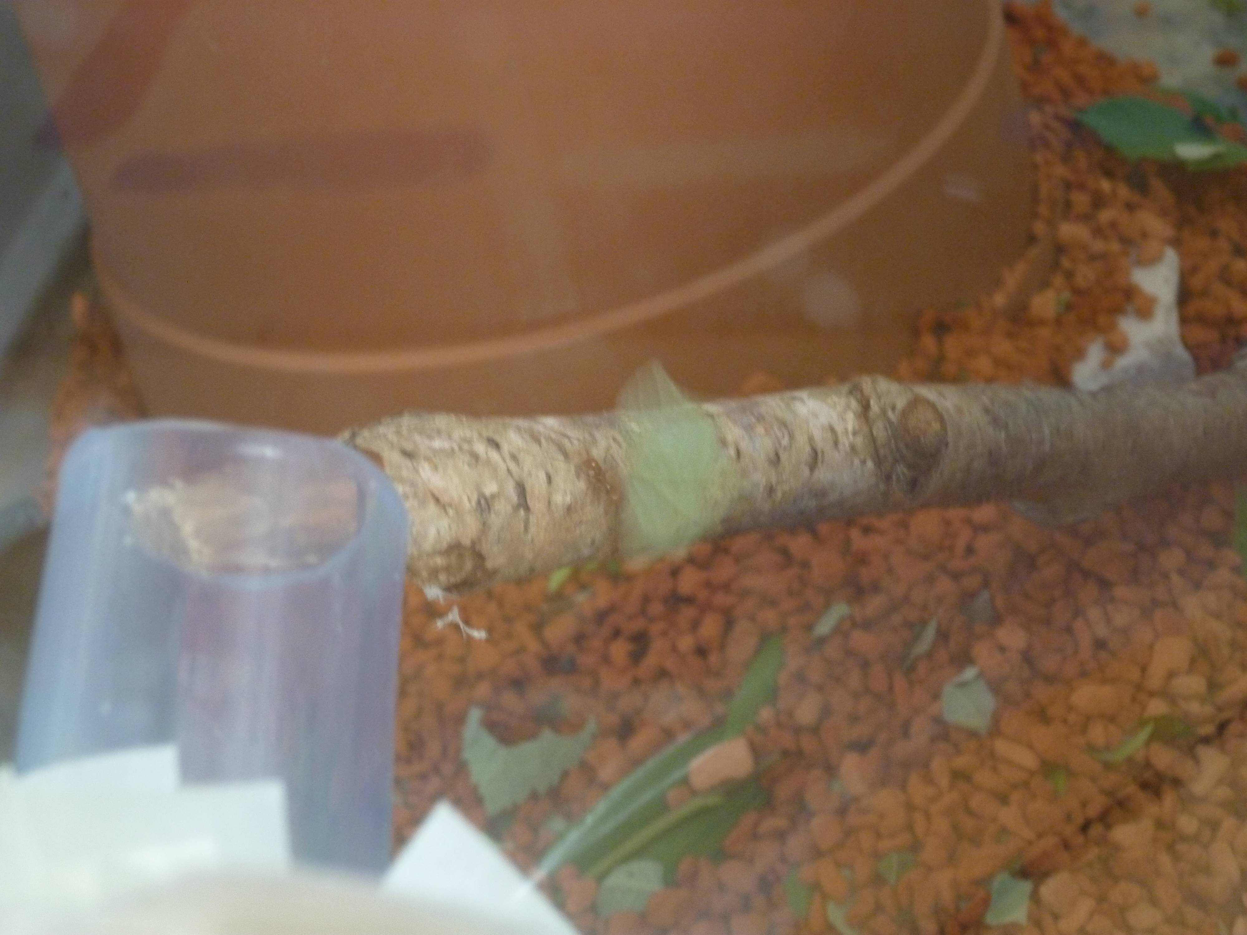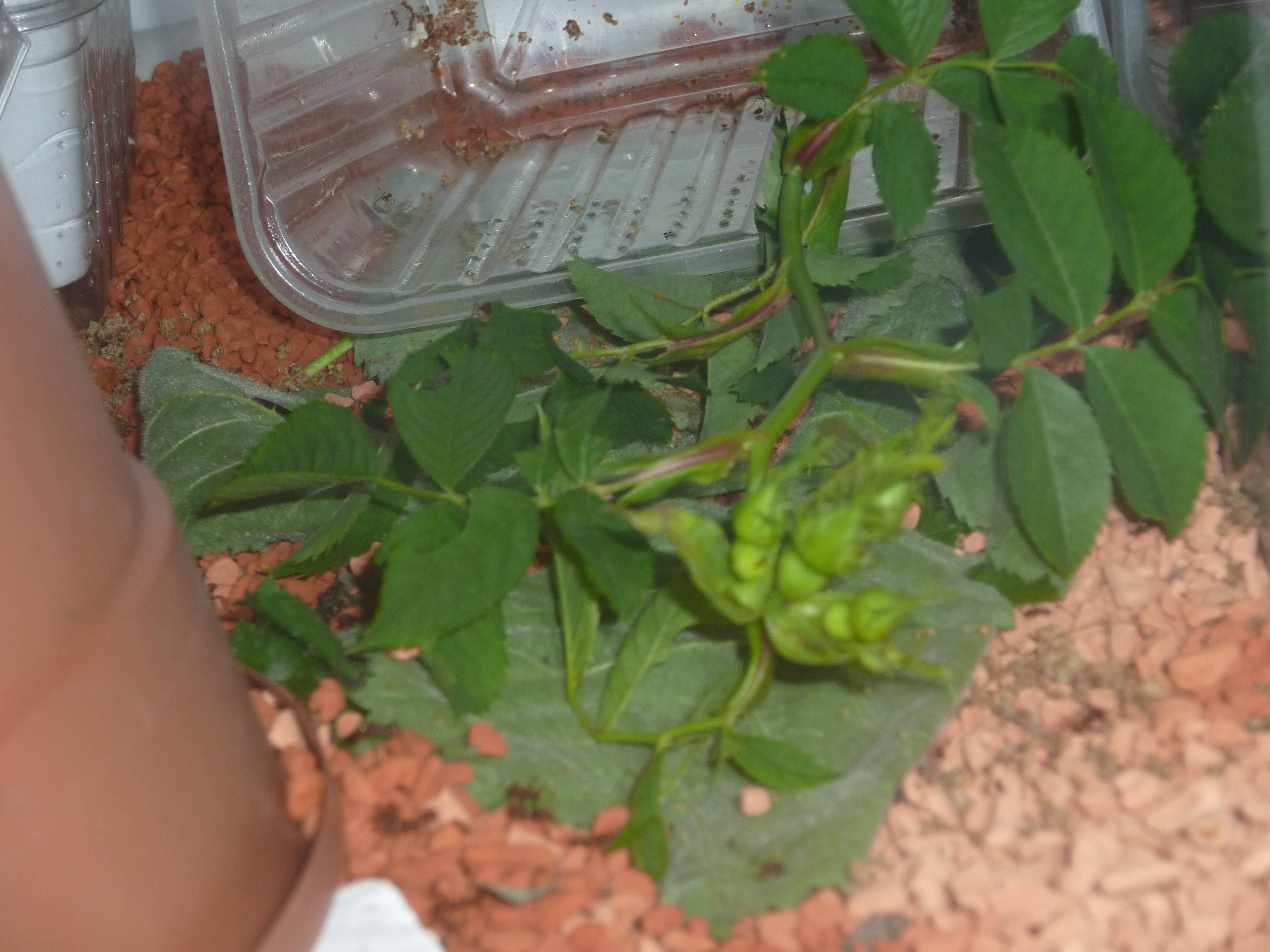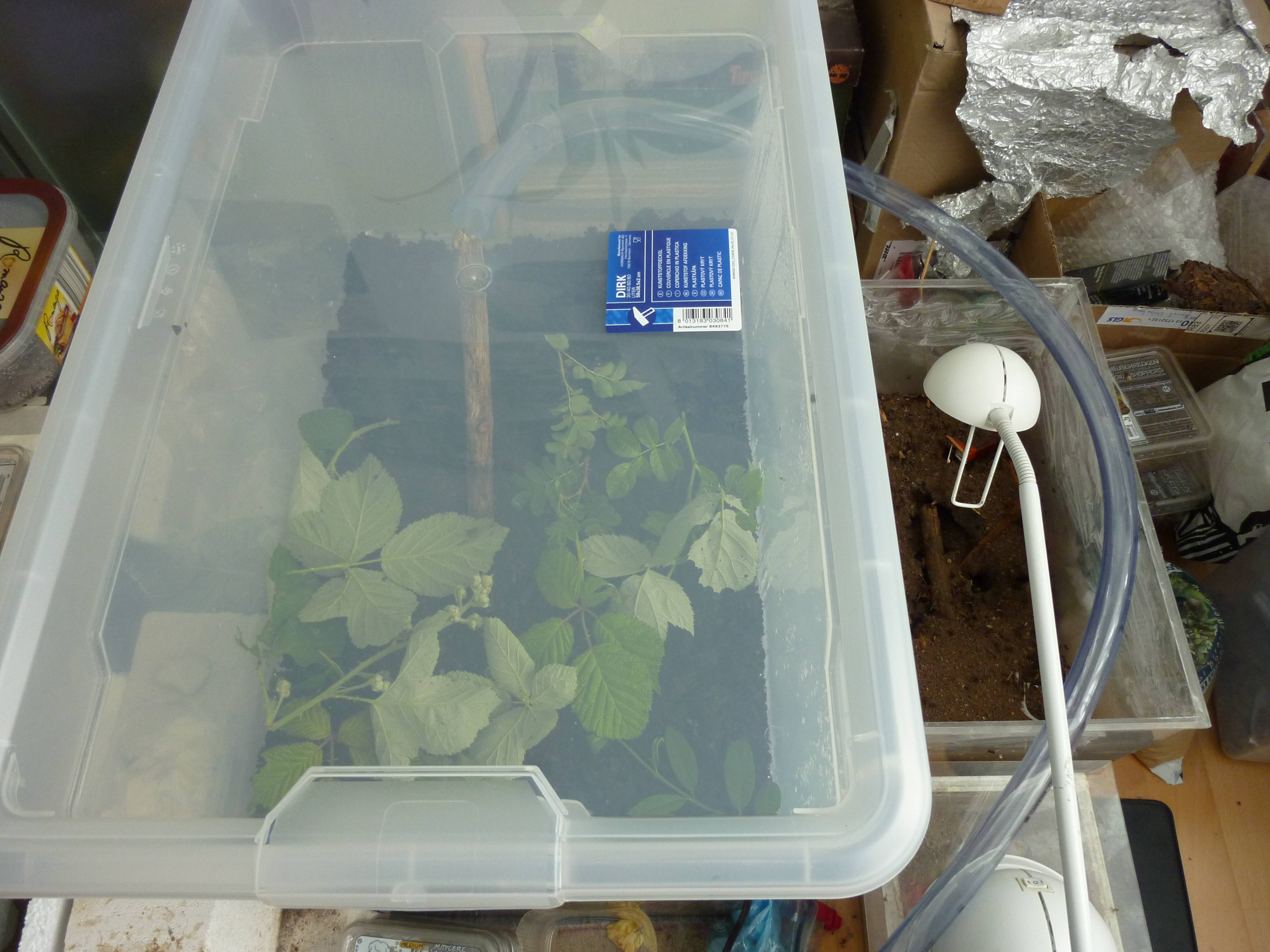 Hier mal ein Bild vom Futterbecken und den Blättern die ich anbiete, meistens gibt es Brombeerblätter, Liguster, Rosenblätter(manchmal auch Blüten)