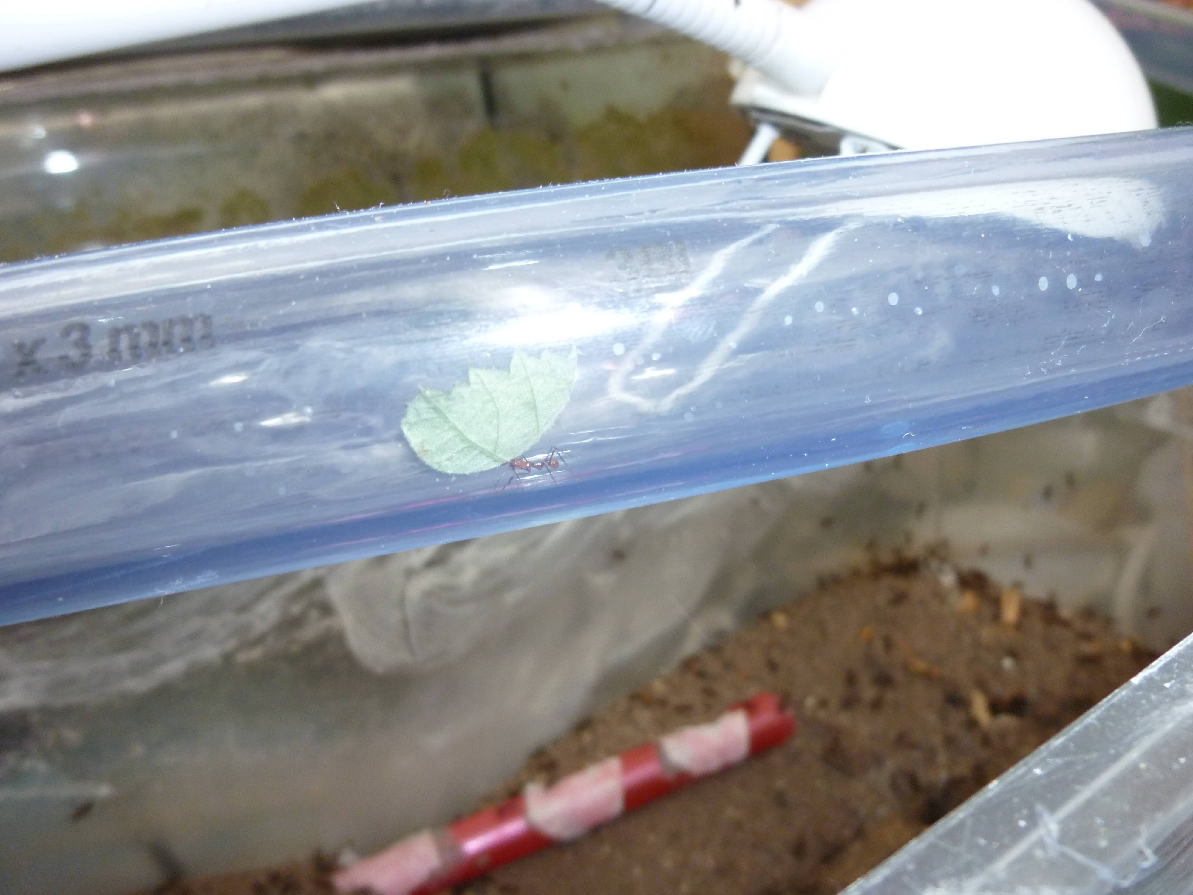 Vorgestern in der Nacht verband ich das Nestbecken meiner Atta Kolonie mit einem weiteren Becken, erst wurde der Schlauch gemieden und ich dachte es wird überhaupt nichts werden. Meine Kolonie ist jetzt mal so geschätzt 150-200 Arbeiterinnen groß geworden und bei solch einer Koloniegröße in einem 60x30 Becken hielt ich es für unwahrscheinlich, dass sie ein weiteres nutzen würden vor allem wenn der Schlauch 2 Meter in etwa lang ist. Doch ich lag total falsch, denn gestern Nacht erlebte ich mein Wunder ich sah ca. 30 Arbeiterinnen, wie sie das neue Becken betraten und Blätter schnitten und etwa 12-14 Stücke zum Nest trugen.
