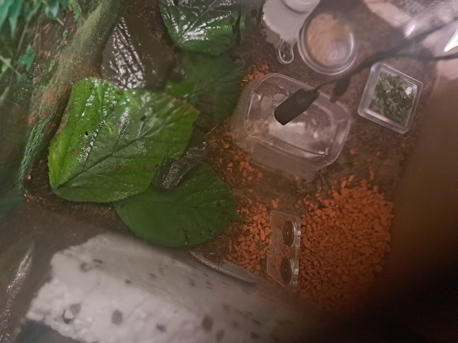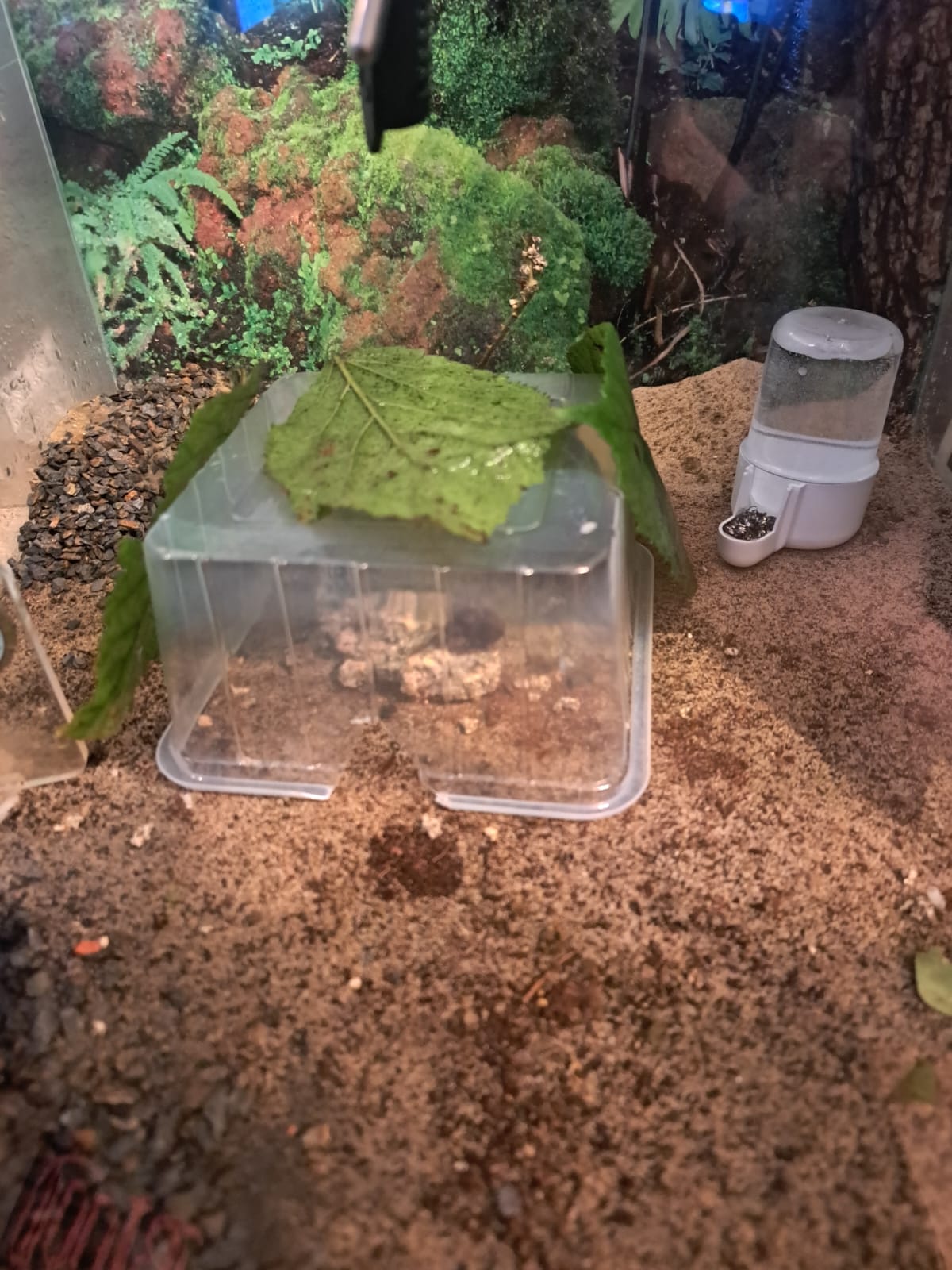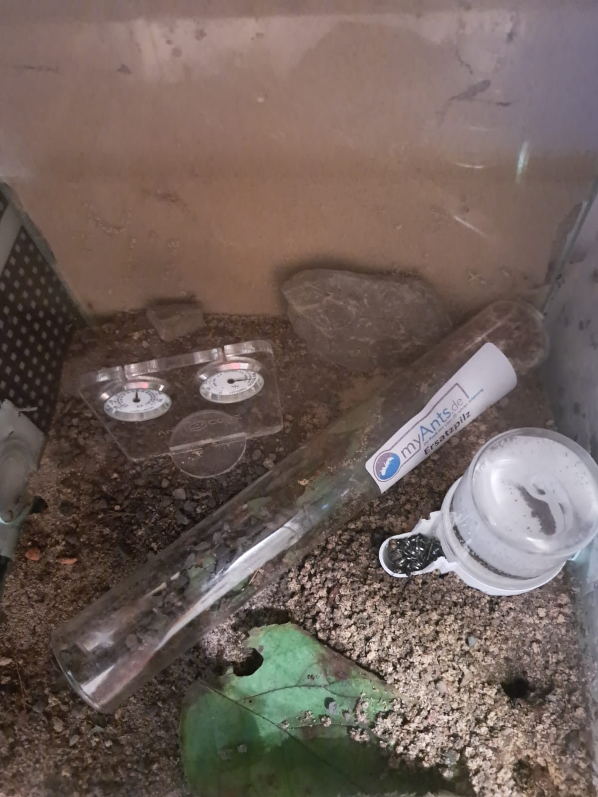 Luftfeuchtigkeit entsteht durch befeuchten des Bodens und der gegebenen BlÀtter, sowie durch zwei 45ml TrÀnken welche im Pilz und Futterbecken stehen und einer 30ml TrÀnke direkt an der Pilzkammer.