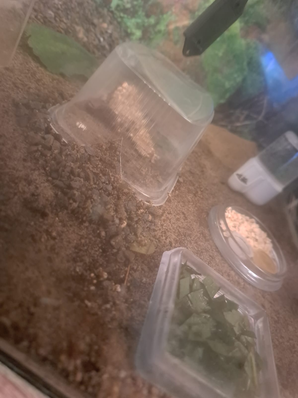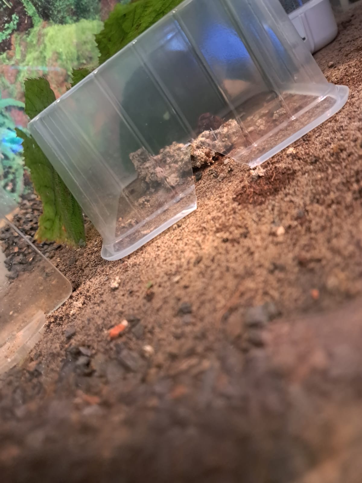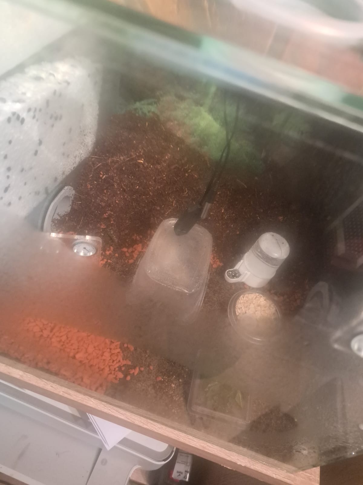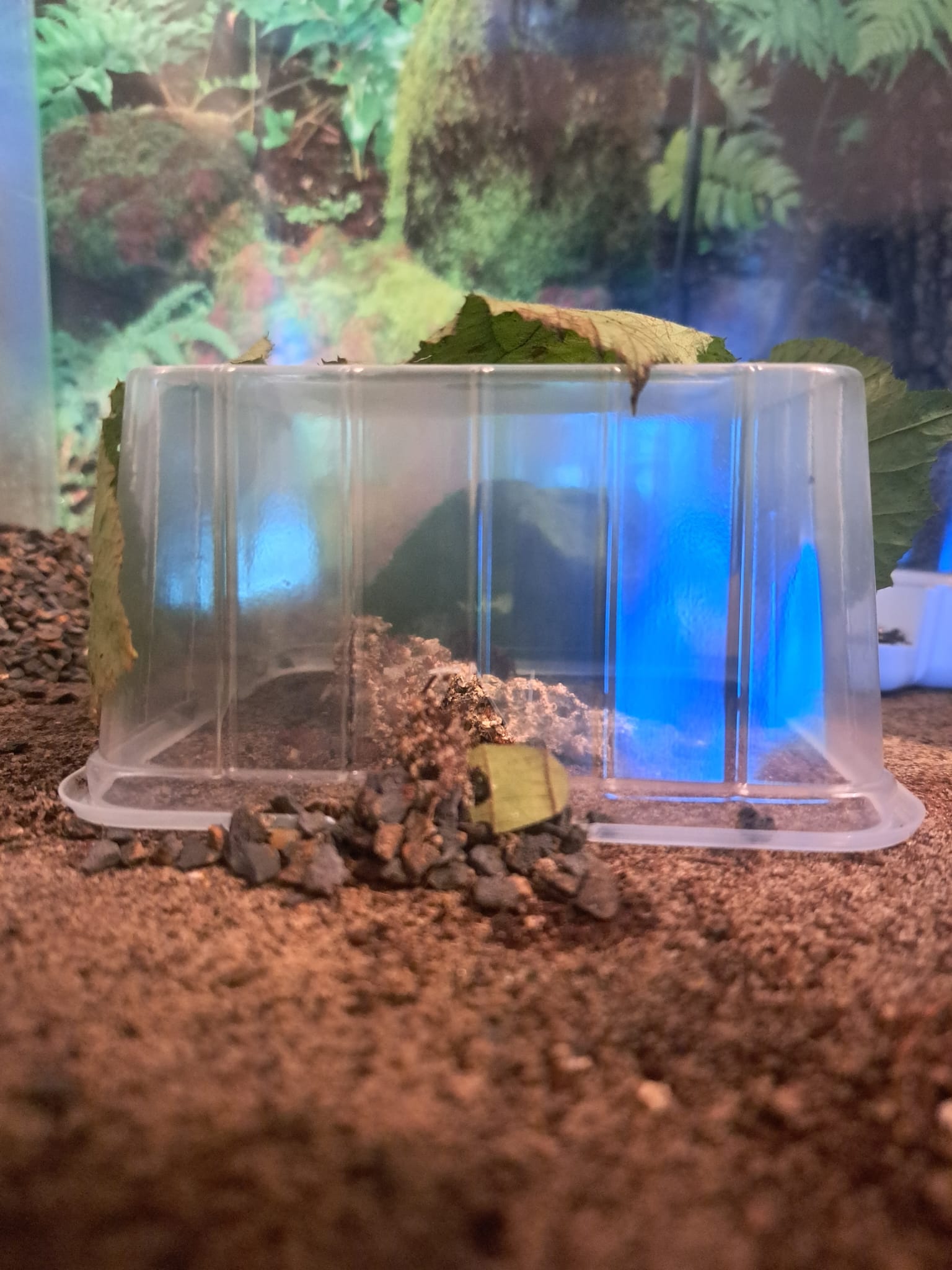 Luftfeuchtigkeit entsteht durch befeuchten des Bodens und der gegebenen BlÀtter, sowie durch zwei 45ml TrÀnken welche im Pilz und Futterbecken stehen und einer 30ml TrÀnke direkt an der Pilzkammer.