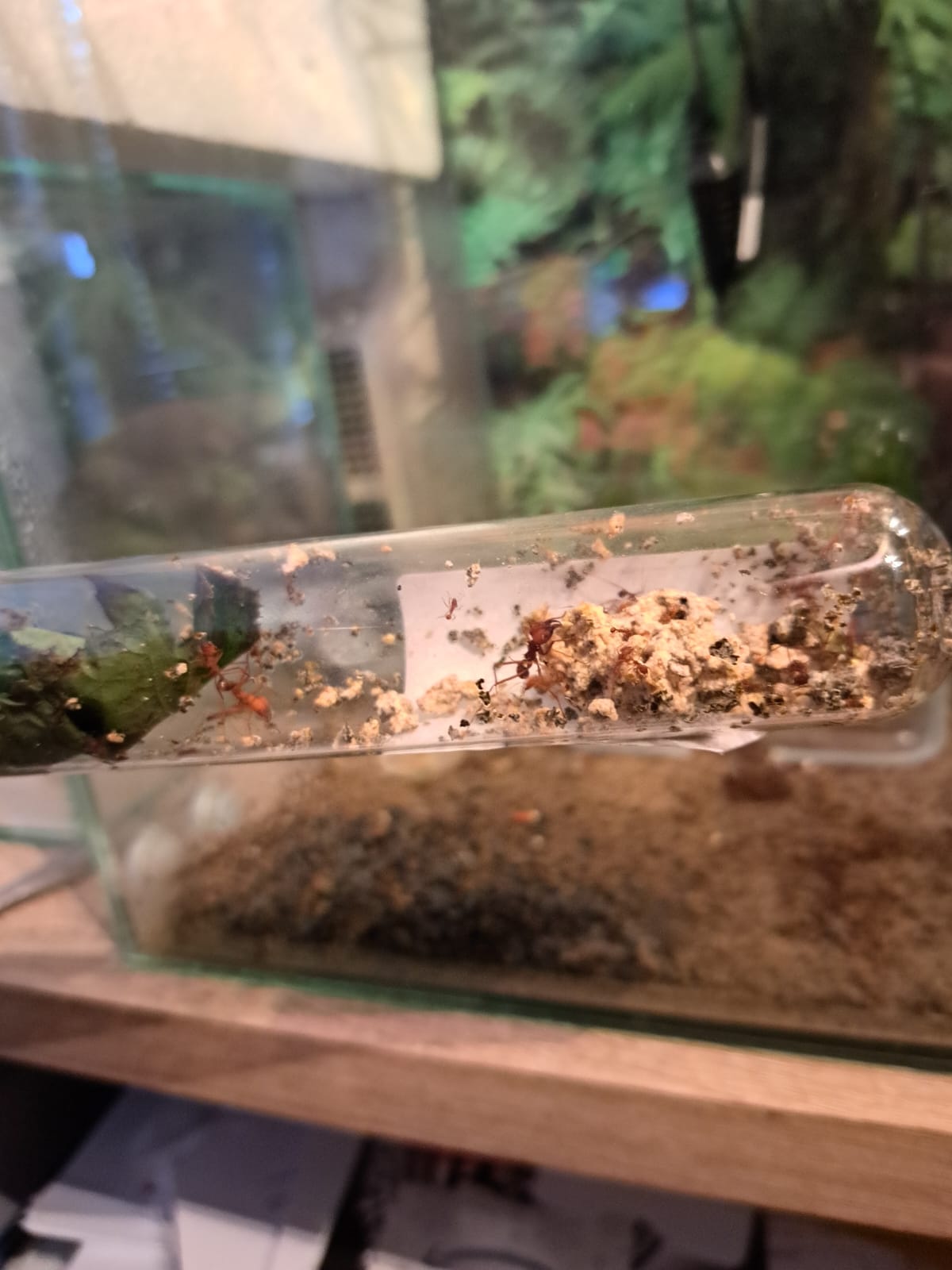 Ăber einen etwa 70cm langen Laufweg durch ein mit einer Liane versehenen Rohr erreicht die Kolonie die Futterkammer, diese ist ein 60x30x30cm Glasbecken mit Gitterdeckel (Ausbruchrahmen und Speziell angefertigter Deckel mit SchiebetĂŒr folgen)