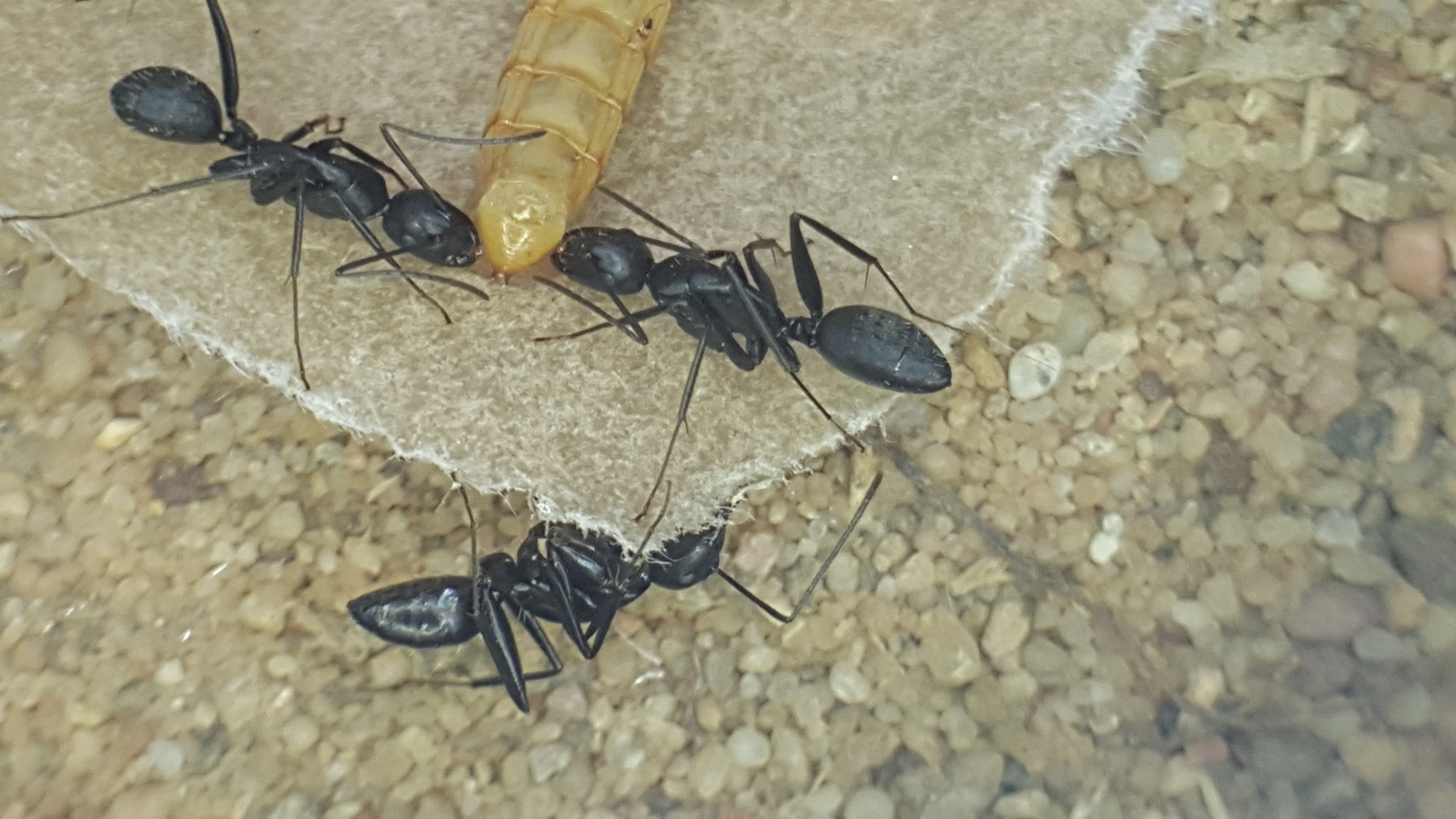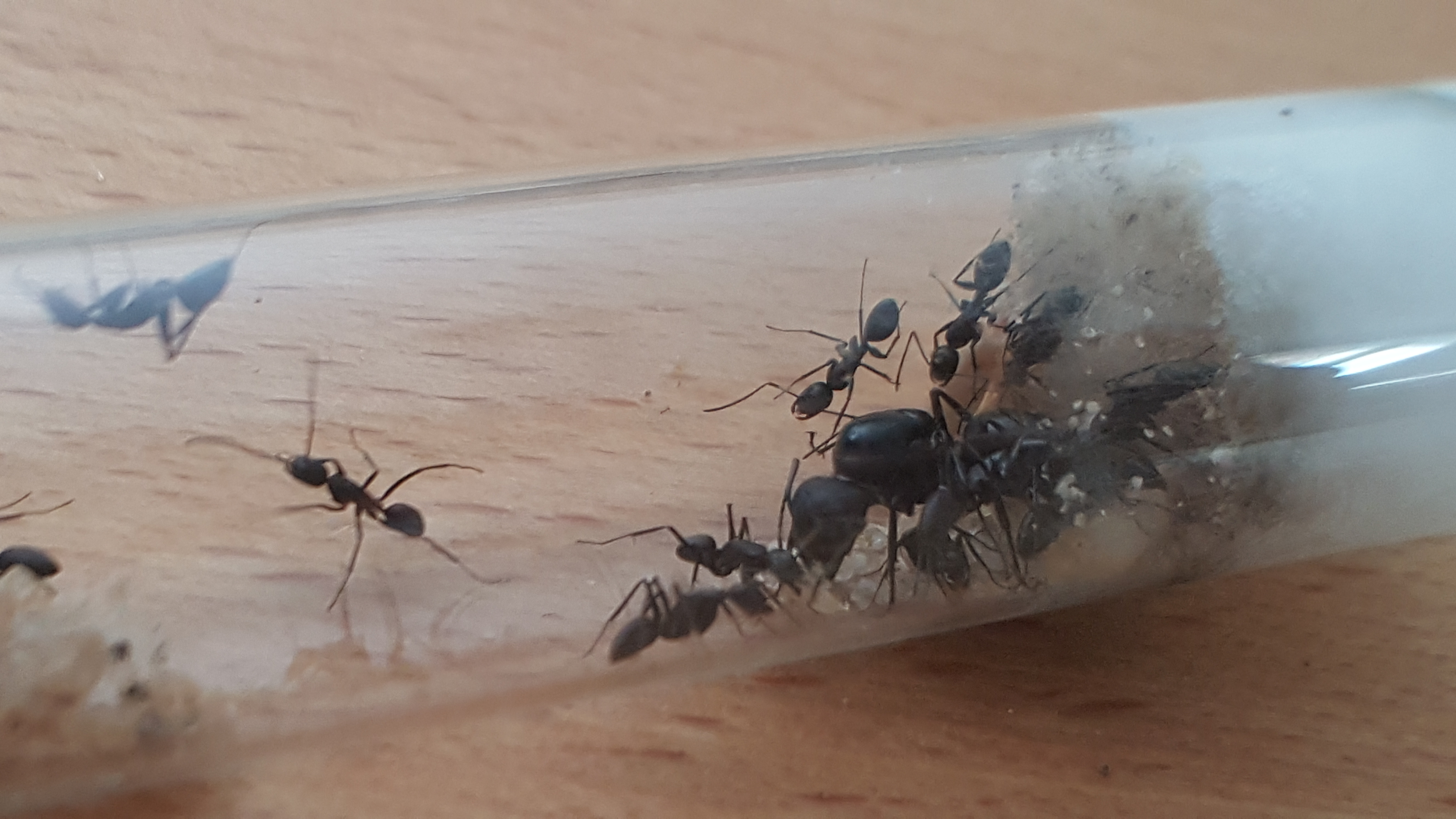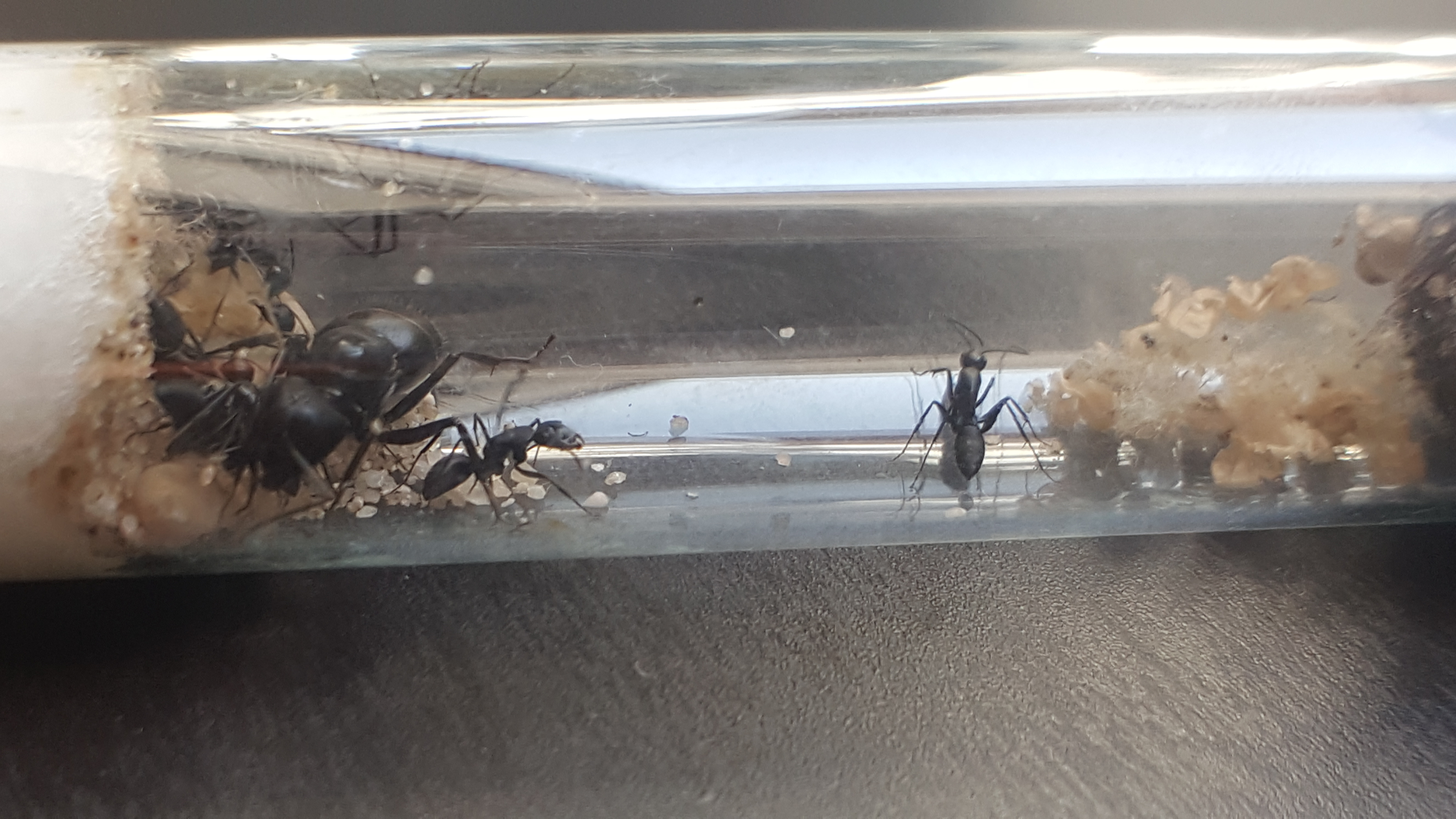 Die Kolonie umfasst um die 12 Arbeiterinnen (wobei es keine Transportopfer gab) und ist jetzt seit 3 Tagen in meinem Besitz. Sie bewohnen ihr Reagenzglas in einer kleinen Plastikbox, bis das Paludarium fertig ist, was in den nächsten Tagen der Fall sein wird. Sie haben sich direkt auf den Honig gestürzt, den ich ihnen hingestellt habe, allerdings haben sie die 2 Mehlwürmer, die ich ihnen bisher angeboten habe, kaum angerührt. Da es aber noch eine sehr kleine Kolonie ist, mache ich mir darüber noch keine Sorgen, im Gegensatz zur Temperatur...