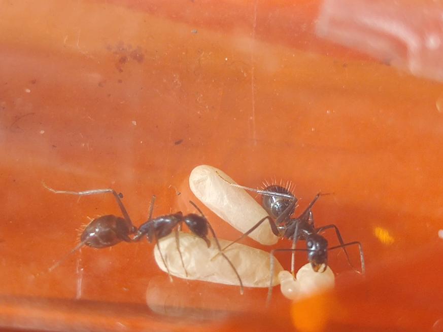 Man konnte gut die Rekrutierung beobachten, eine lief ins Nest und immer mehr kamen heraus, sogar die Majore! Die Beute wurde an allen Seiten fixiert und getötet. Ansonsten sind sie bisher aber noch ziemlich ängstlich, wird der Deckel geöffnet oder ähnliches verstecken sie sich und/oder flüchten ins Nest. Sie scheinen auch nicht gerne auf dem Boden herumzulaufen. Momentan nutzen sie lieber die Wege über die Steine oder die Wand.