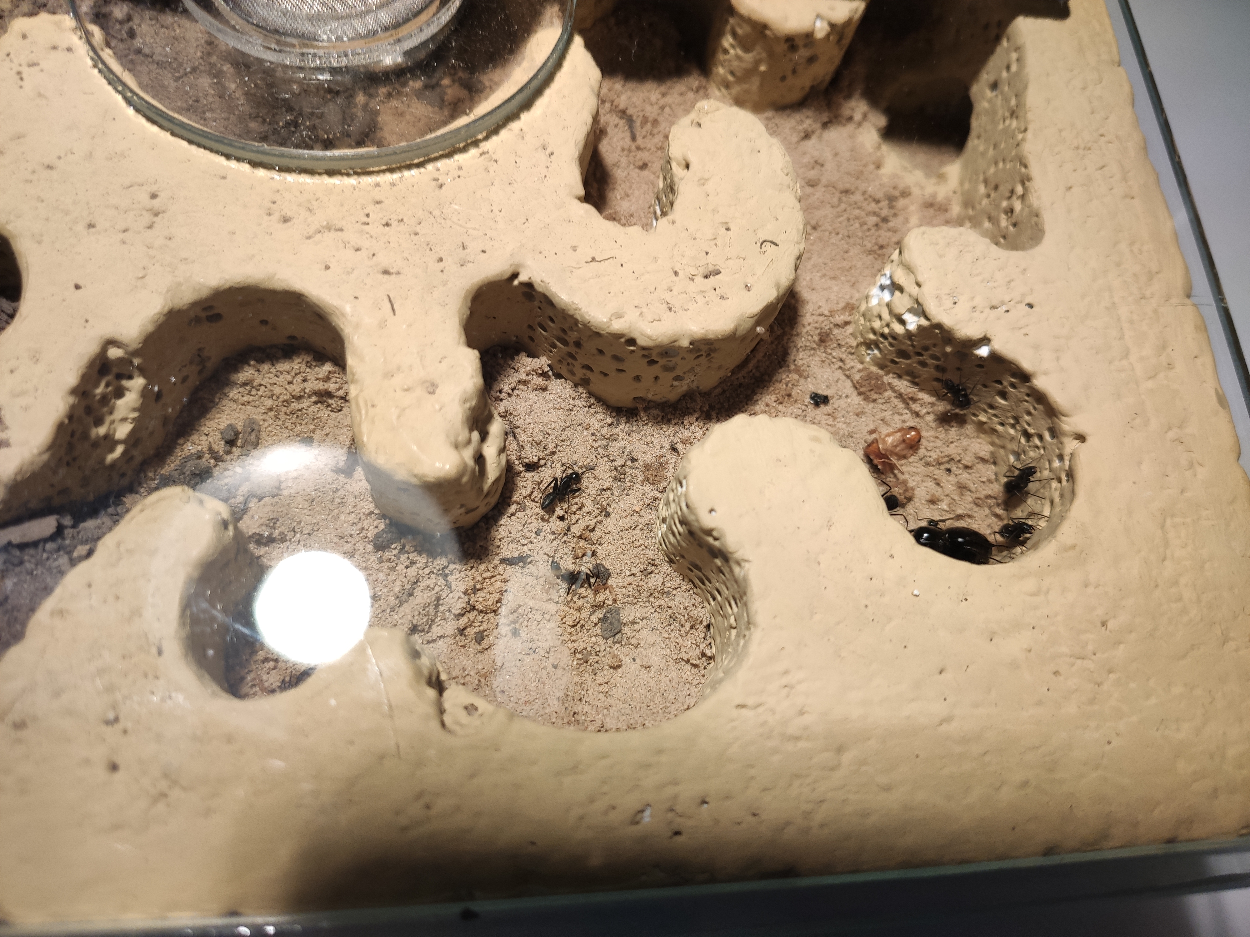 Nach circa 5 Monaten im RG hatte ich an die Lampe eine Zeitschaltuhr angeschlossen durch die recht kurzen Intervalle beschlossen die Ameisen aber dann recht schnell endlich auszuziehen und ins eigentliche Nest (durchgängig Beheizt 27-30°C) einzuziehen.