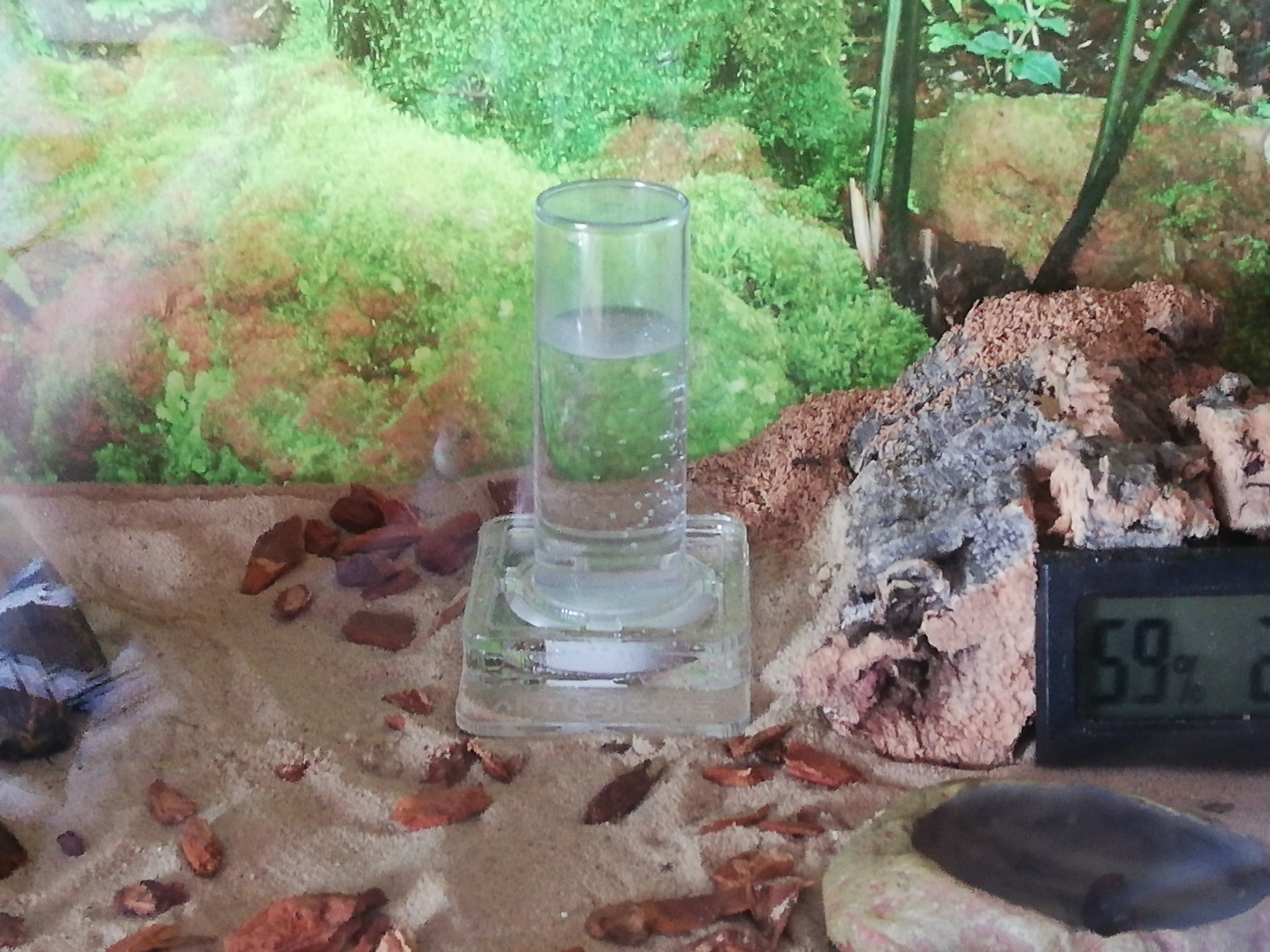 Oberhalb des Nestes fülle ich auch einmal täglich frisch Wasser nach, ist ein kleiner Behälter mit einer Art Watte gestopft).