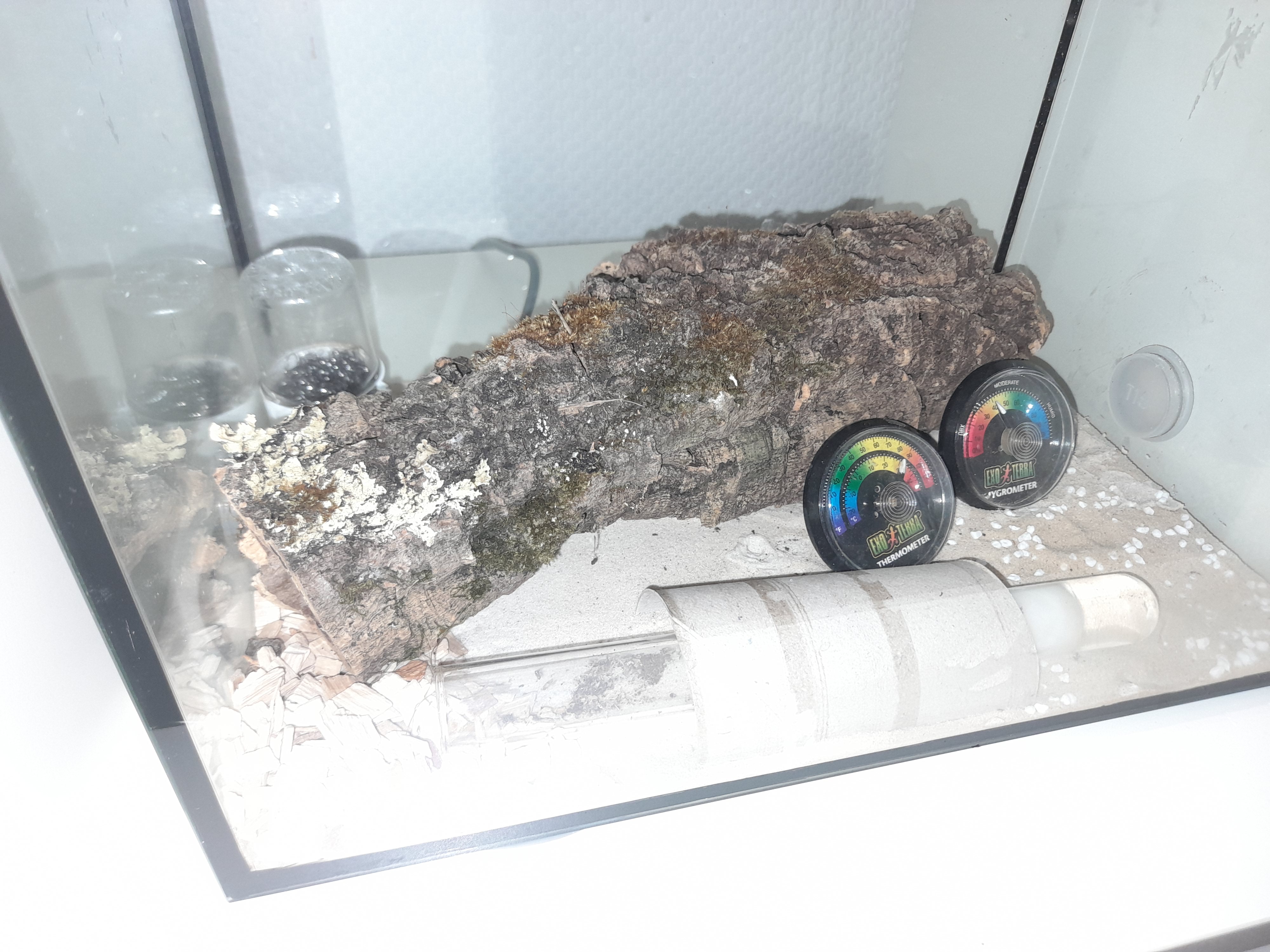Ich habe das Reagenzglas, abgedunkelt natĂŒrlich, in ein 30Ă20Ă20 Becken gelegt. Hinein kann noch eine Korkröhre, eine TrĂ€nke mit Zuckerwasser und unter das halbe Becken ein Heizkabel. Durchschnittlich betrĂ€gt die Temperatur 28° C befeuchtet wird alle 2 Tage und die Feuchtigkeit betragt immer zwischen 40 und 60 %.