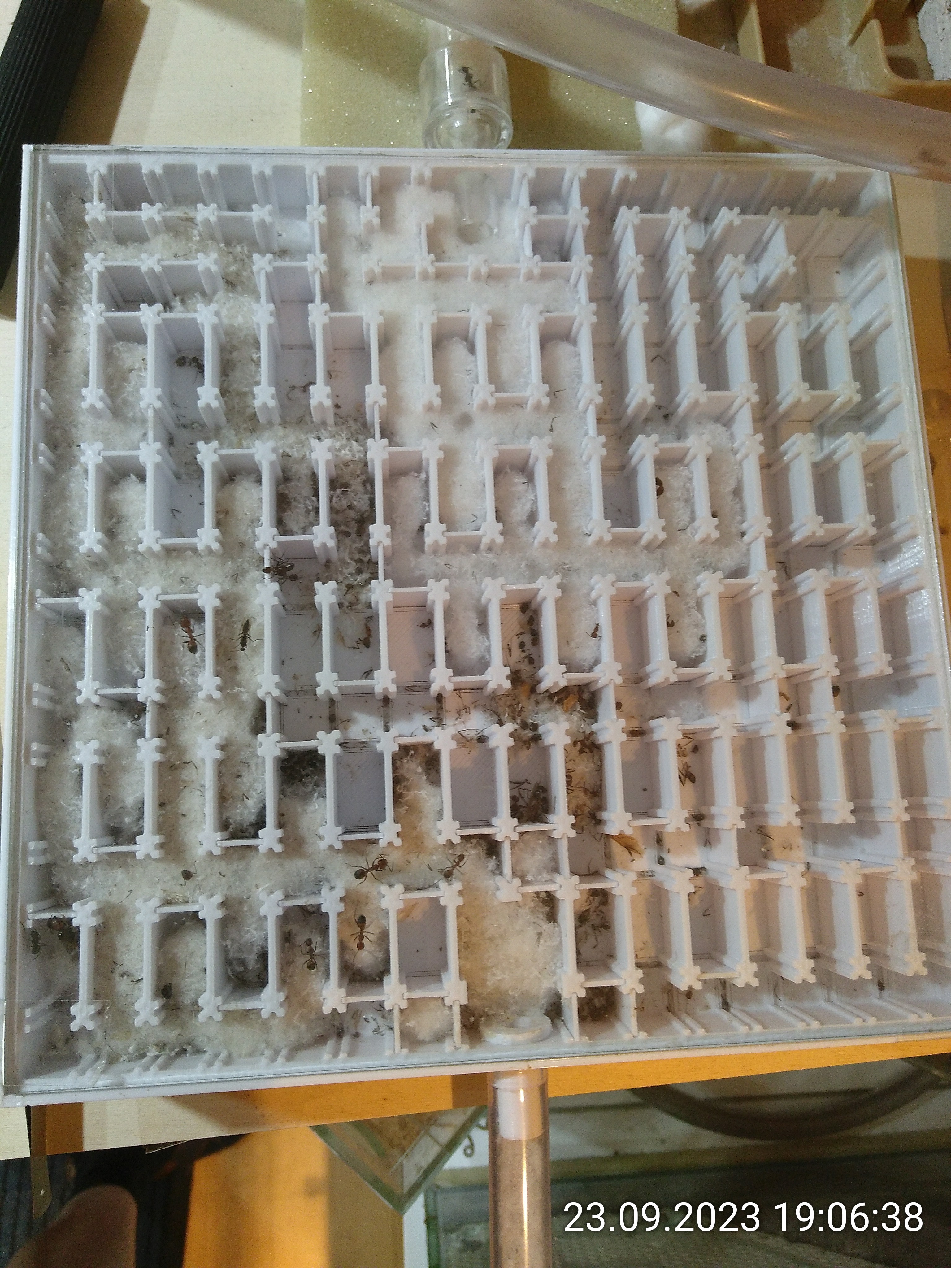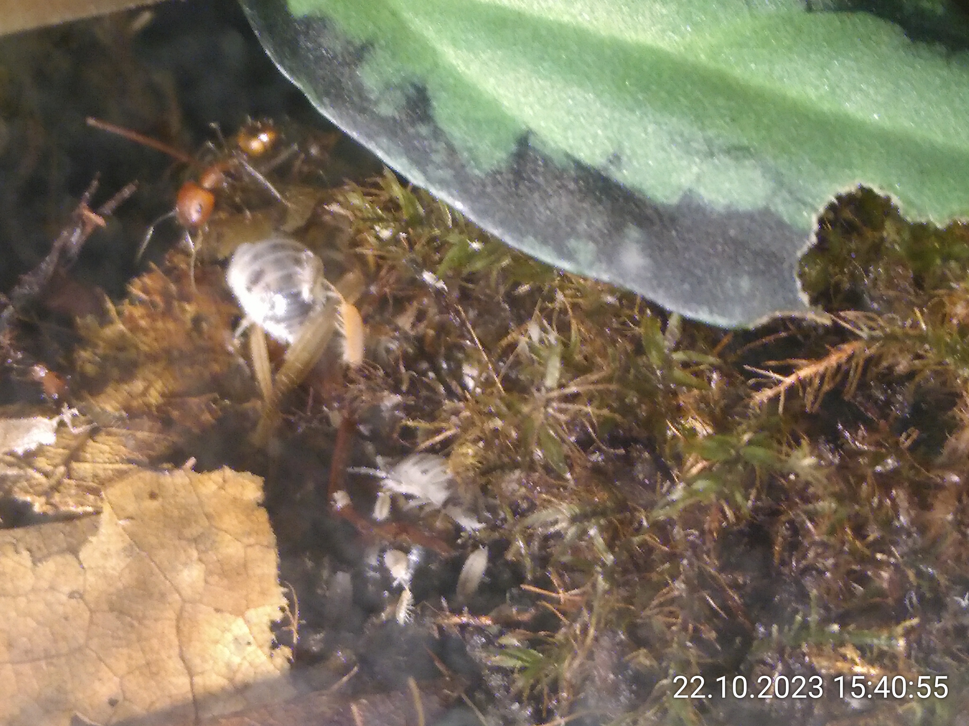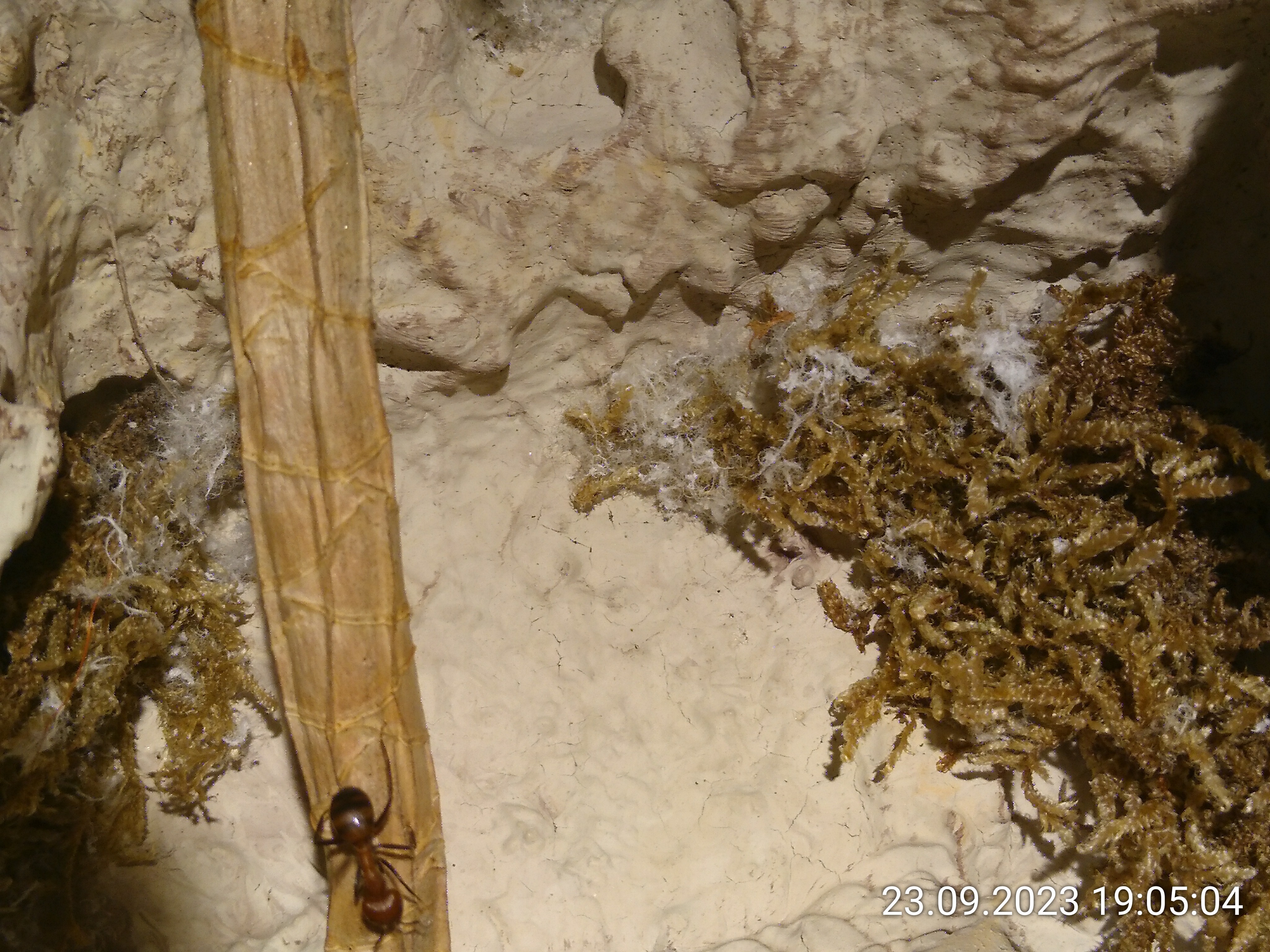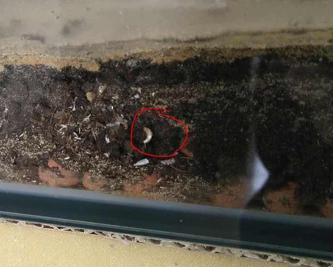 Das kleine Nest, also Camp Nico, ihr allererstes ĂŒbrigens, das sie nie aufgegeben haben, auch wenn sie es kaum noch aktiv nutzen, hat sich ziemlich verĂ€ndert. Das untere Drittel ist komplett angefĂŒllt mit MĂŒll, vermutlich gröĂtenteils Kork. Da werde ich bei Gelegenheit mal einen Löffel mit weiĂen Asseln reinsetzen. Hoffentlich erwische ich dabei keine Babys von den gröĂeren Arten. Das mittlere Drittel ist fast immer leer und im oberen sitzen viele MĂ€nnchen. Ist das ihre Man Cave? Im "oberirdischen" Bereich sieht sie AktivitĂ€t immer mal wieder anders aus. Im Sommer wurde dort sogar mal wiederBrut gelagert.