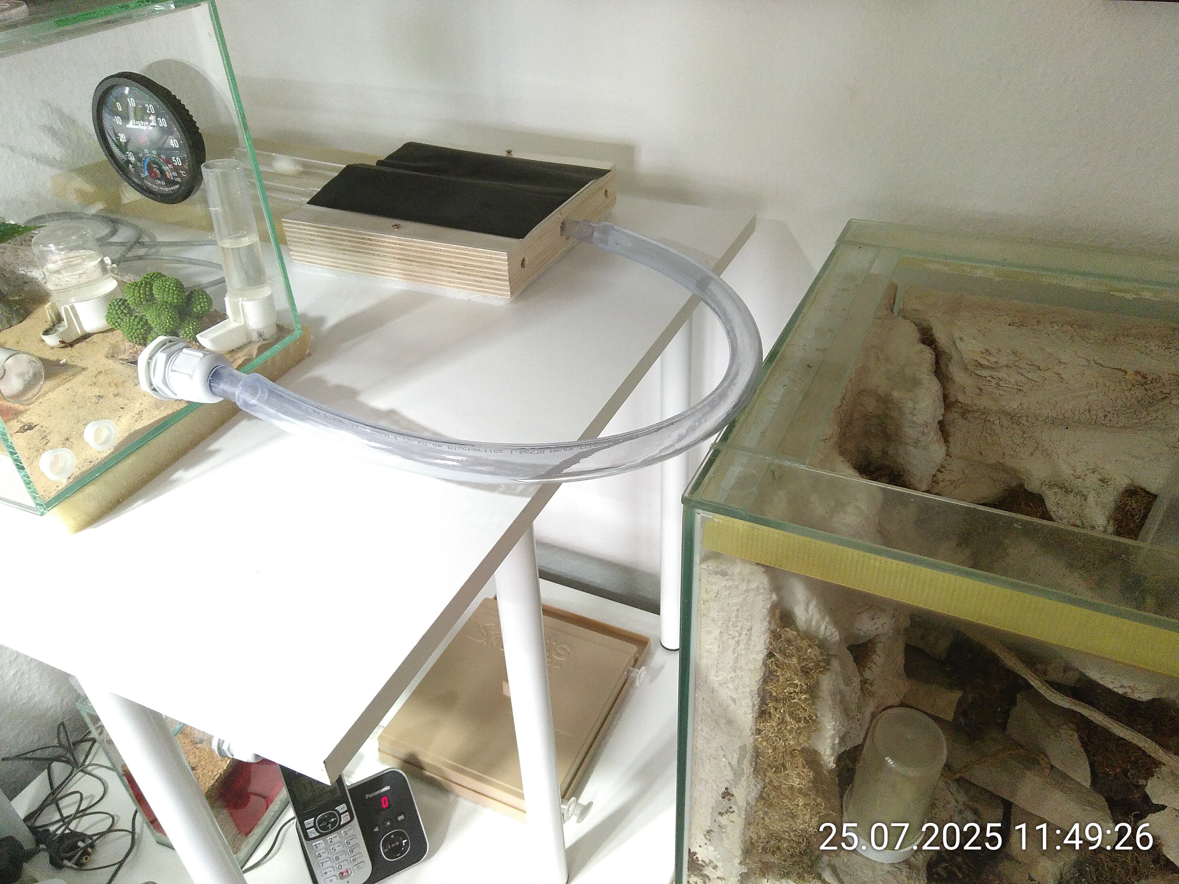 Ich habe sie wahrscheinlich auf frischer Tat ertappt. Sie scheint von ihrem Becken auf den Schlauch gestiegen zu sein. Ich muss also mal wieder den Ausbruchsschutz erneuern. Das habe ich gefĂĽhlt schon ewig nicht mehr gemacht. Wie man sieht, testen sie nach wie vor, zumindest ab und zu, immer noch ihre Grenzen aus.