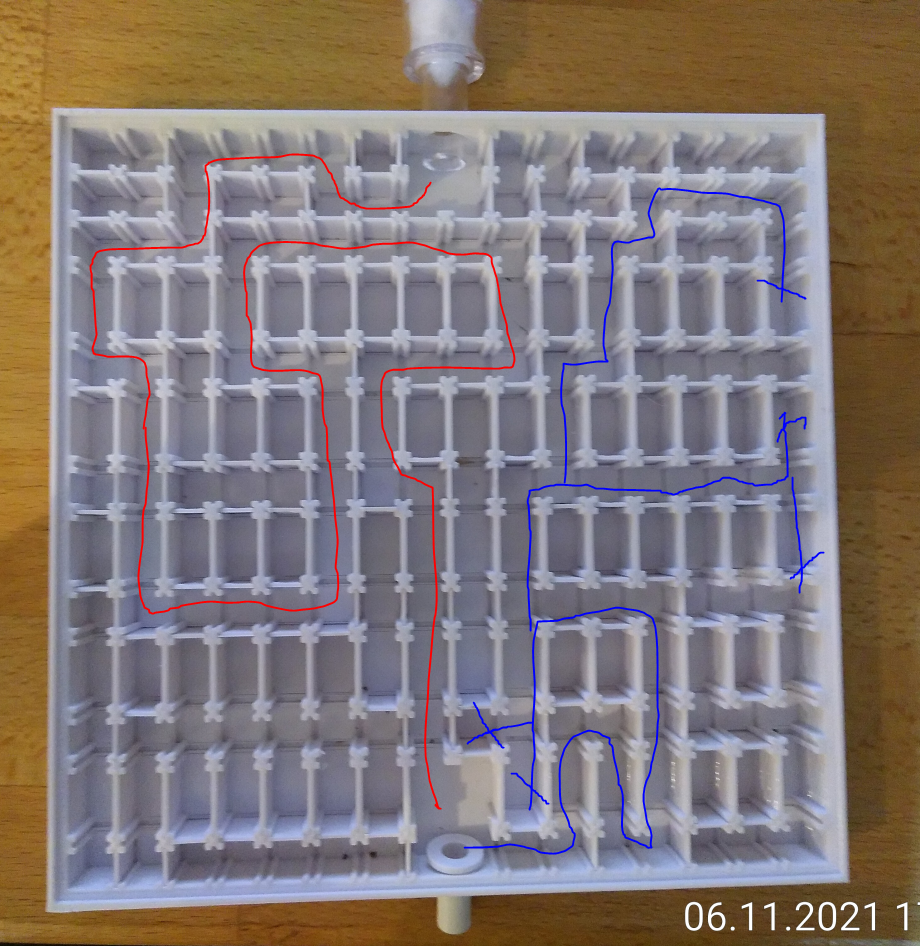 Nachtrag: Die Bonuspunkte vergebe ich zu 90 % jetzt schon. Das Verhältnis steht gerade 20:1 für den richtigen Weg. Aber beim nächsten Mal starte ich wieder später, sie sind noch nicht so richtig aktiv. Nach einer Stunde sind nur 20 Ameisen im Lab.