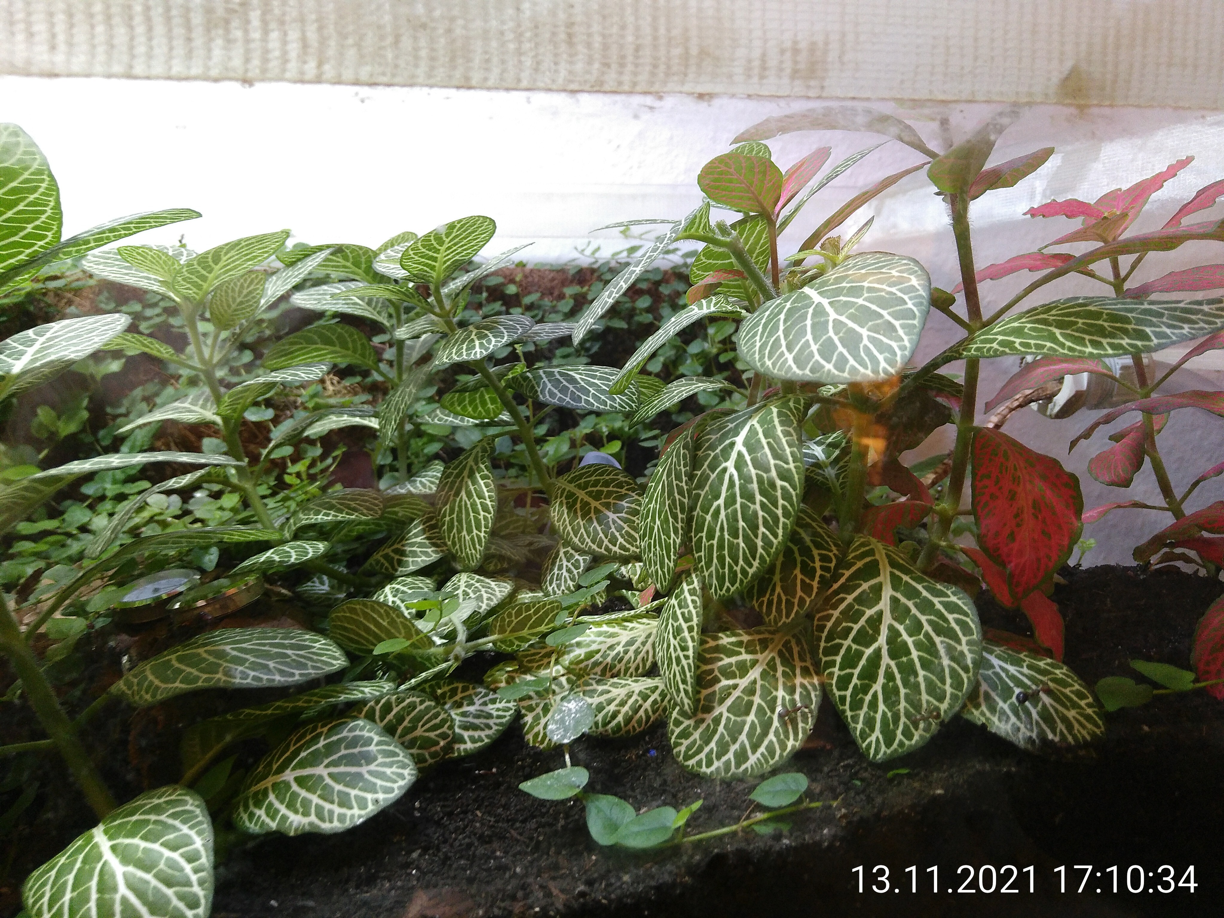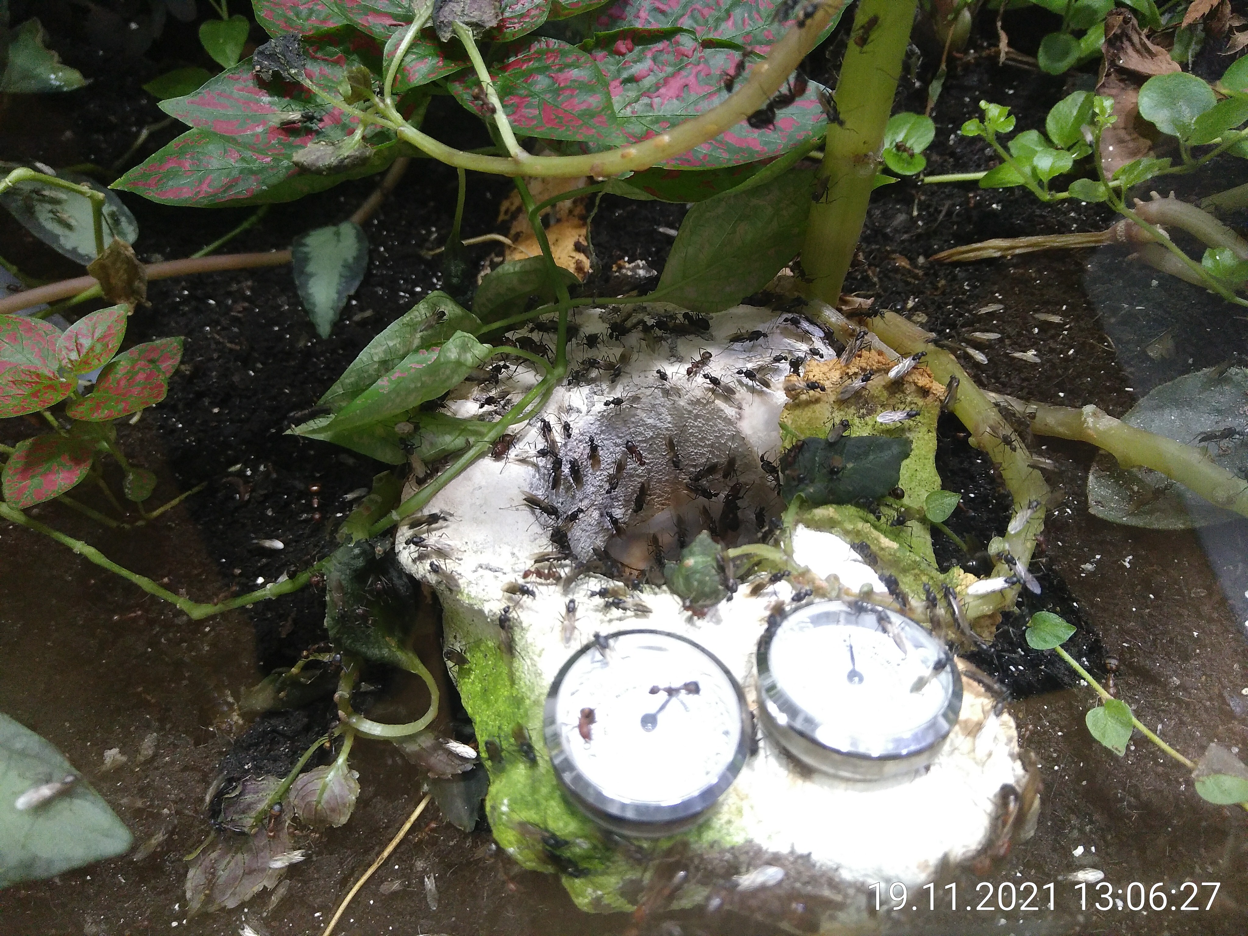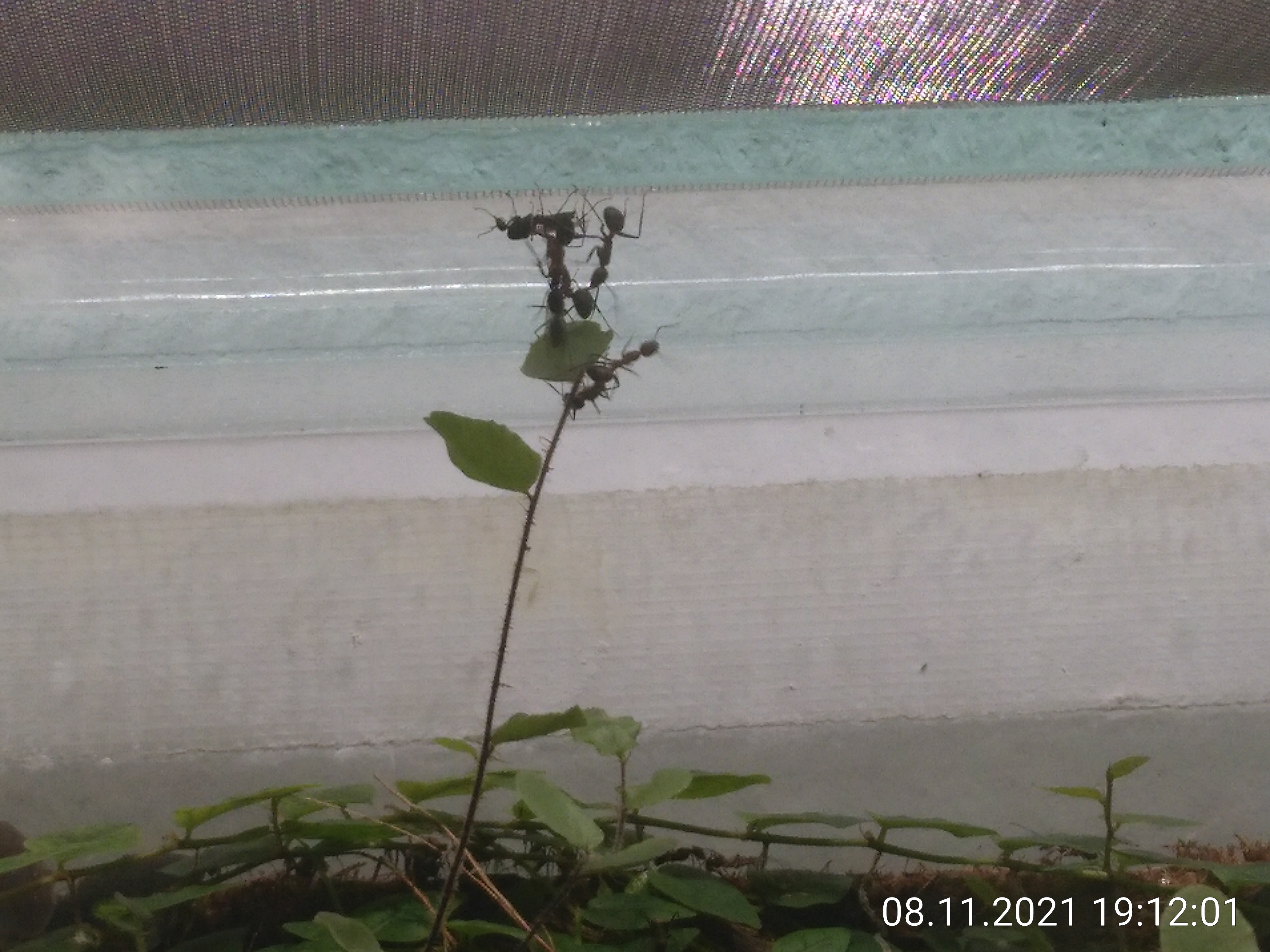 Ameisen am Deckel sind wirklich nicht gut oder besser lästig. Die Männchen reichen mir schon. Von denen sitzen immer so zwischen 20 und 100 am Deckel in der Nähe des Gitternetzes. Aber - wenn ich den Deckel abnehme, bleiben sie ganz ruhig. Ich kann gießen und was sonst noch so nötig ist und den Deckel dann einfach wieder drauf setzen. Es krabbelt nur selten mal einer weg. Arbeiterinnen verhalten sich da ganz anders. Sie sind viel neugieriger und müssen dann leider eine nach der anderen wegpinzettiert werden. Die Obergrenze des Dschungels muss ich daher immer im Blick behalten. Am schlimmsten sind die großen lila Blätter, die stellen sich abends immer senkrecht. Das ist schwer einzuschätzen, bis es zu spät ist. Mehr Geschichten aus dem Dschungel gibt es am Wochenende.