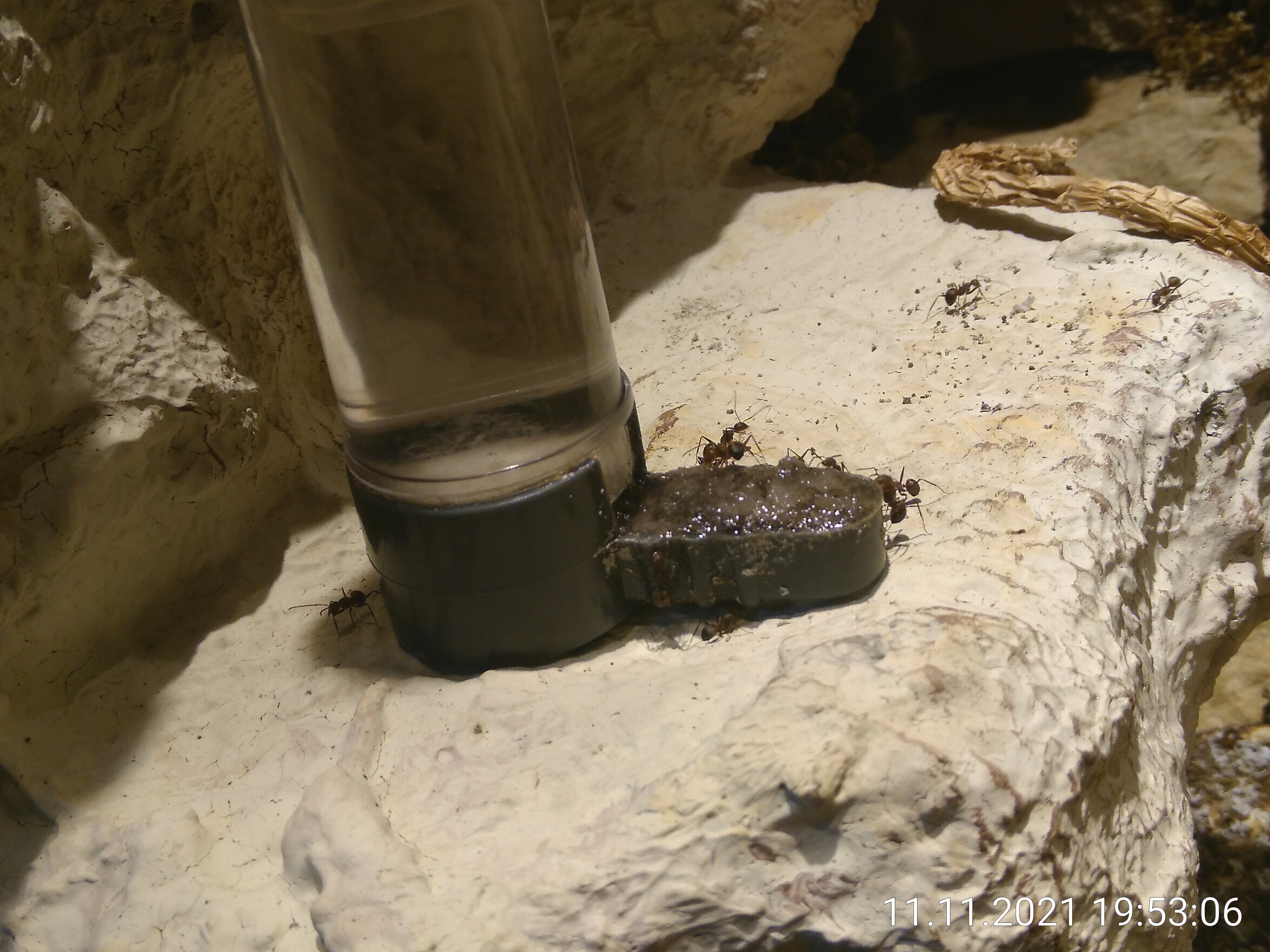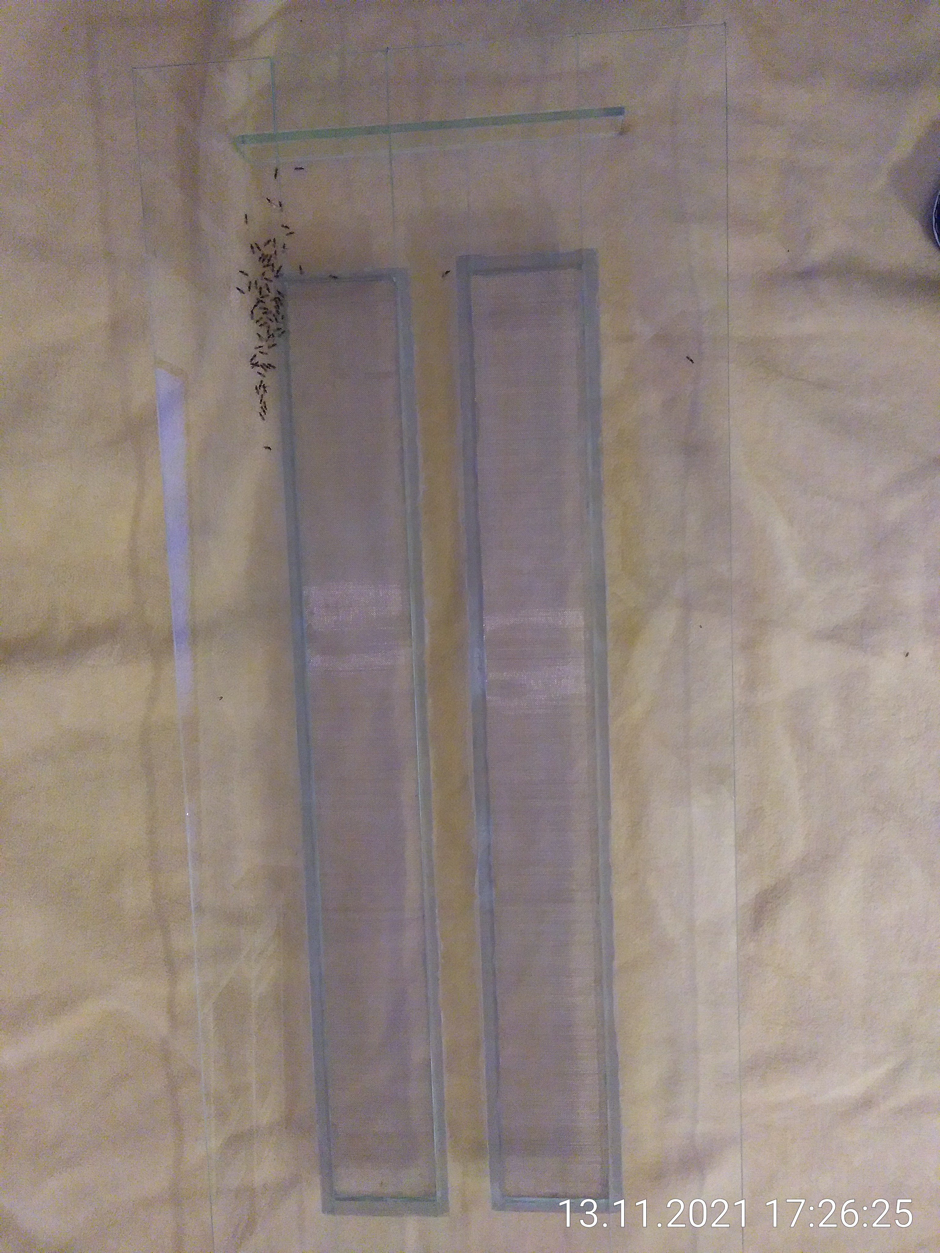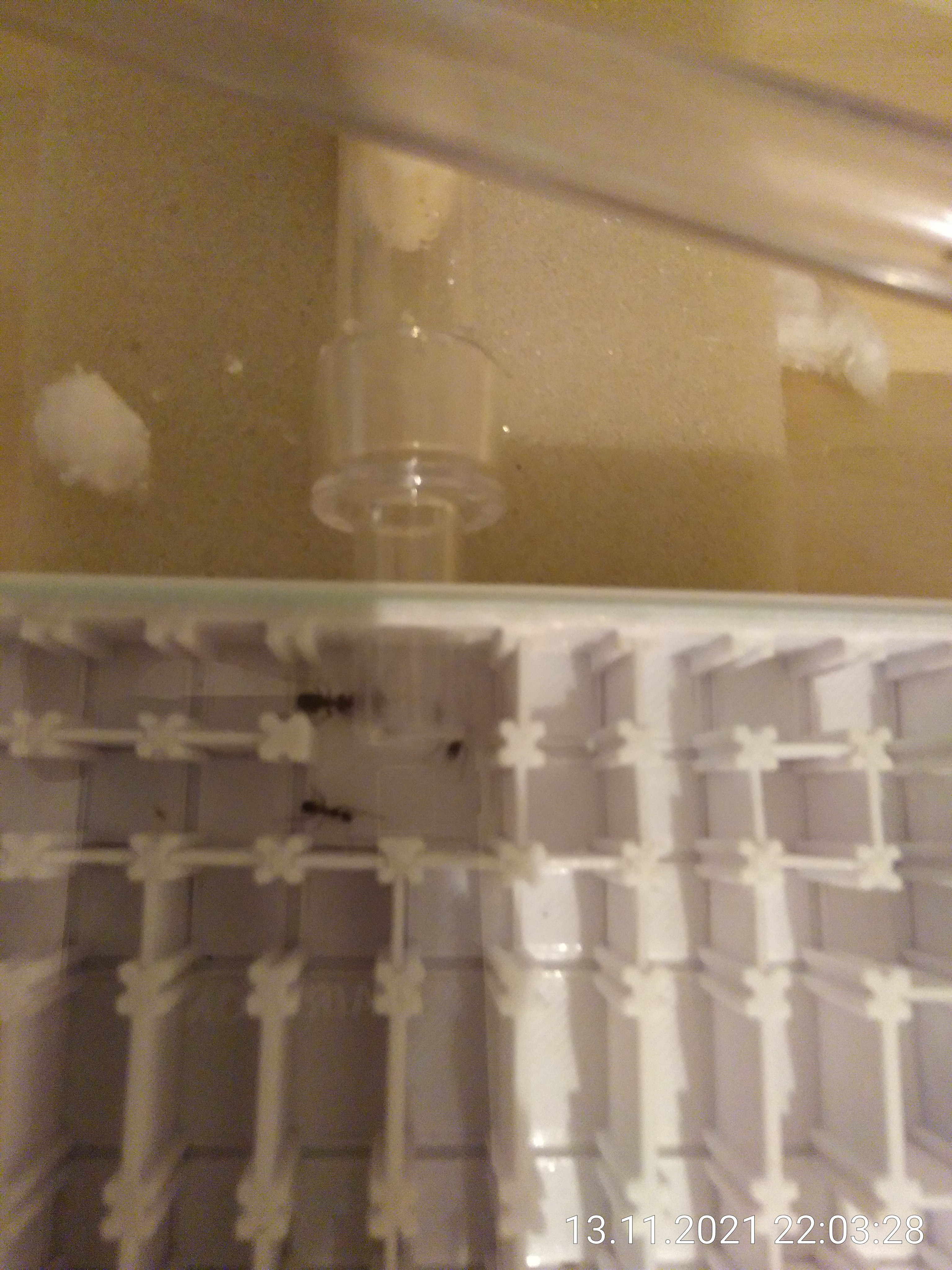 Nach dem Beschneiden habe ich den Ausbruchschutz erneuert und dann mit dem Ceranfeldreiniger die Scheiben geputzt. Der Unterschied ist echt gewaltig, ist aber auf Fotos nicht so gut zu erkennen. Anschließend kam die Fütterung der Ameisen und der Bodenpolizei. Heute gab es nochmal eine gemörserte Eierschale für die Kleinen. Habe kürzlich erst gelernt, dass die auch Kalk für ihr Wachstum brauchen. Gegossen wird seit einiger Zeit auch nicht mehr mit Leitungswasser. Das hört sich nicht nach viel Arbeit an, hat aber ein bis zwei Stunden gedauert.