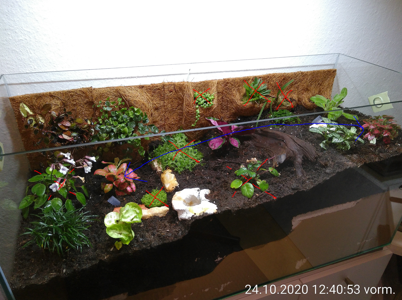 Die beiden rötlichen Pflanzen haben irgendwann Plätze getauscht (blauer Pfeil), weil die eine viel höher wächst und links mehr Platz ist. Die rot markierten haben es nicht geschafft sich durchzusetzen. Auf diesem Bild konnte ich das am besten zeigen, weil es noch so übersichtlich aussieht. Aber das war nicht der Startzustand. Eigentlich sahe es so aus, als alles bepflanzt war.