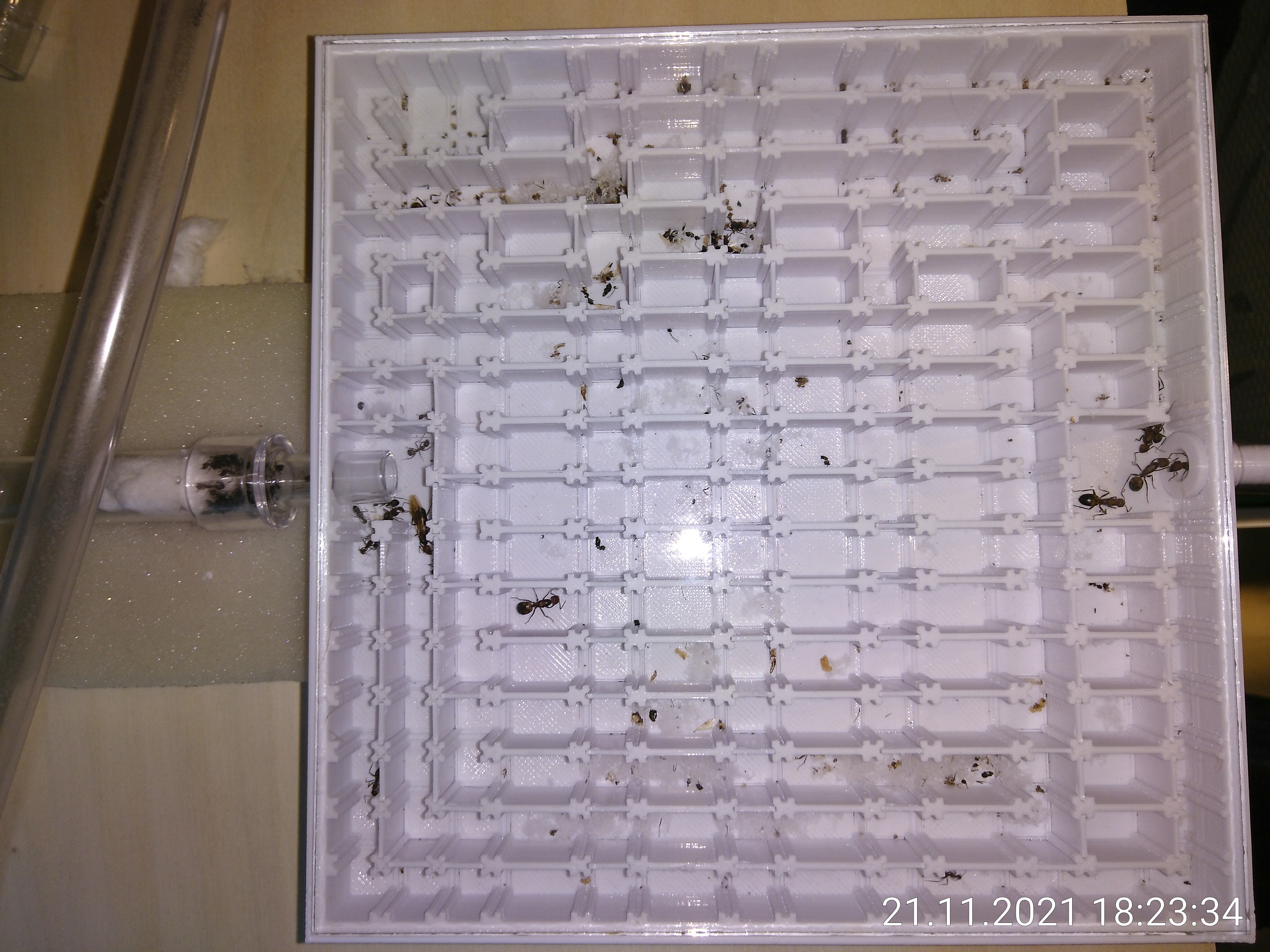 Ich weiß nicht, ob es Zufall ist oder ob sie gelernt haben, aber der Unterschied zwischen dem ersten Test und dem zweiten ist riesig. In der ersten Woche waren ungefähr gleich viele Ameisen in beiden Bereichen unterwegs. In der zweiten Woche haben sie den Sackgassen-Bereich nach kurzer Erkundung fast komplett ignoriert. Ich glaube, sie sind da hauptsächlich rein, um Müll abzulegen. Das werde ich weiter testen. Aber diese Woche bekommt Rapunzula seinen Wunsch erfüllt! Die Belohnung ist zu 95 % vernichtet. Samstag oder Sonntag kann es wieder losgehen.
