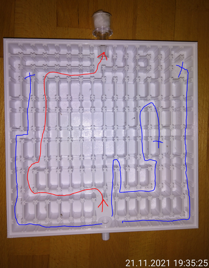 Dann Punkt 1+2 wiederholen (mit selben Labyrinth) diesmal aber das Labyrinth zwischen Punkt 1+2 reinigen, so dass keine Pheromonspur mehr vorhanden ist!