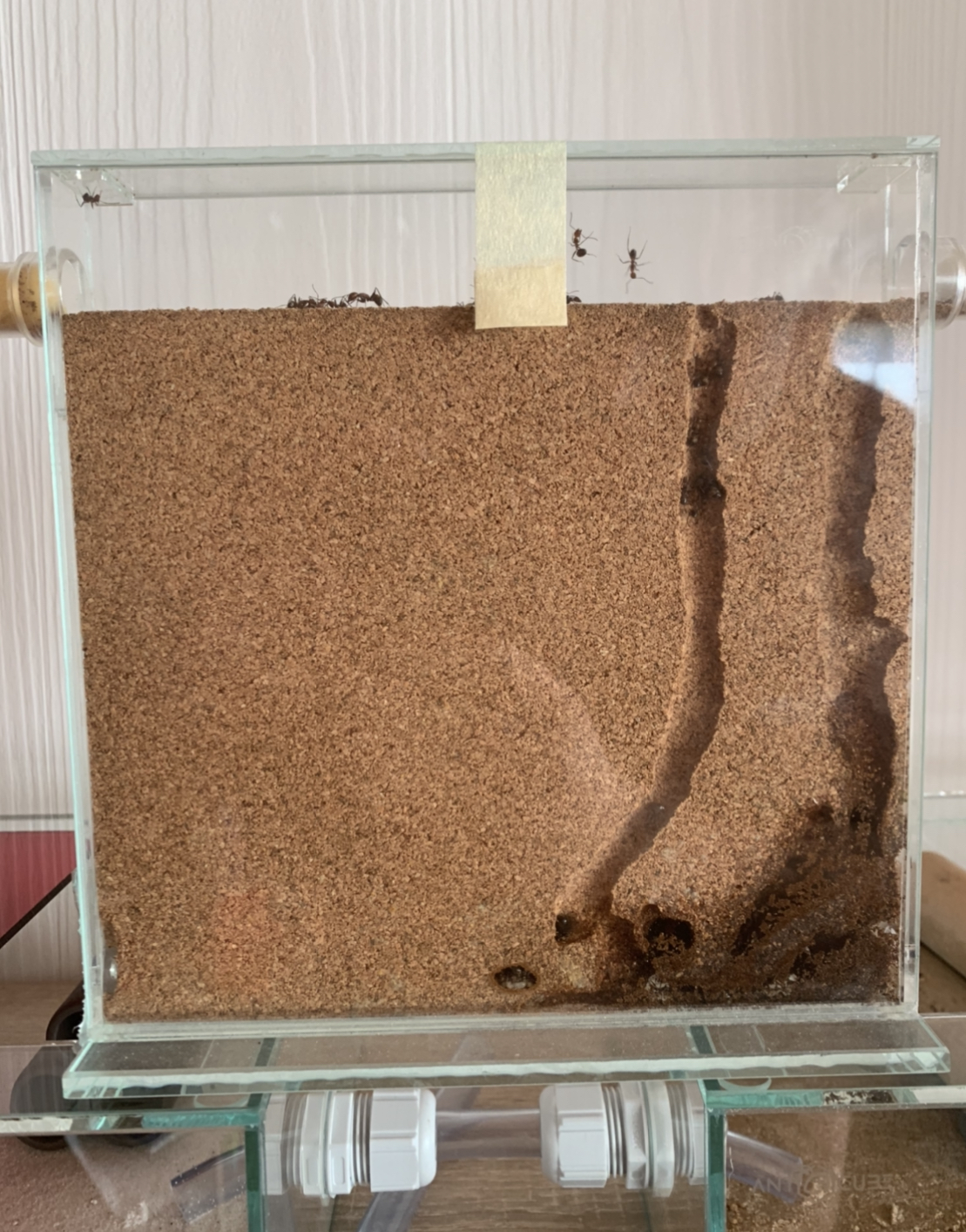 Ich war so überrascht, dass nach nur ein paar Minuten ein paar Ameisen (wahrscheinlich Kundschafterinnen oder Aufklärer) im Korknest waren! Ich dachte, dass es sicher lange gehen würde bis sich dort oben eine Ameise zeigt!