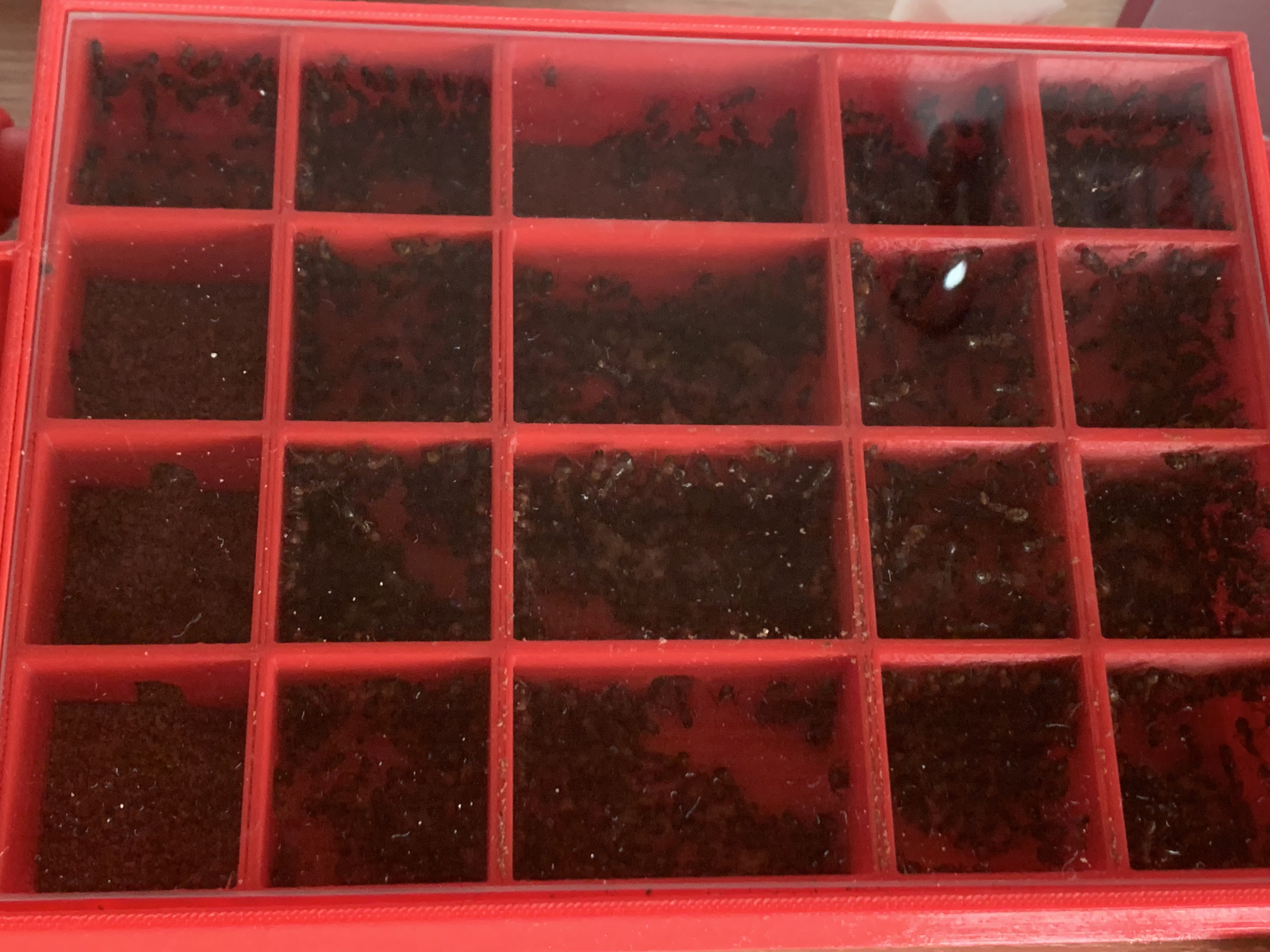 Unten rechts seht ihr das rote selbstgedruckte Nest wo sich seit einiger Zeit dieKönigin aufhält.