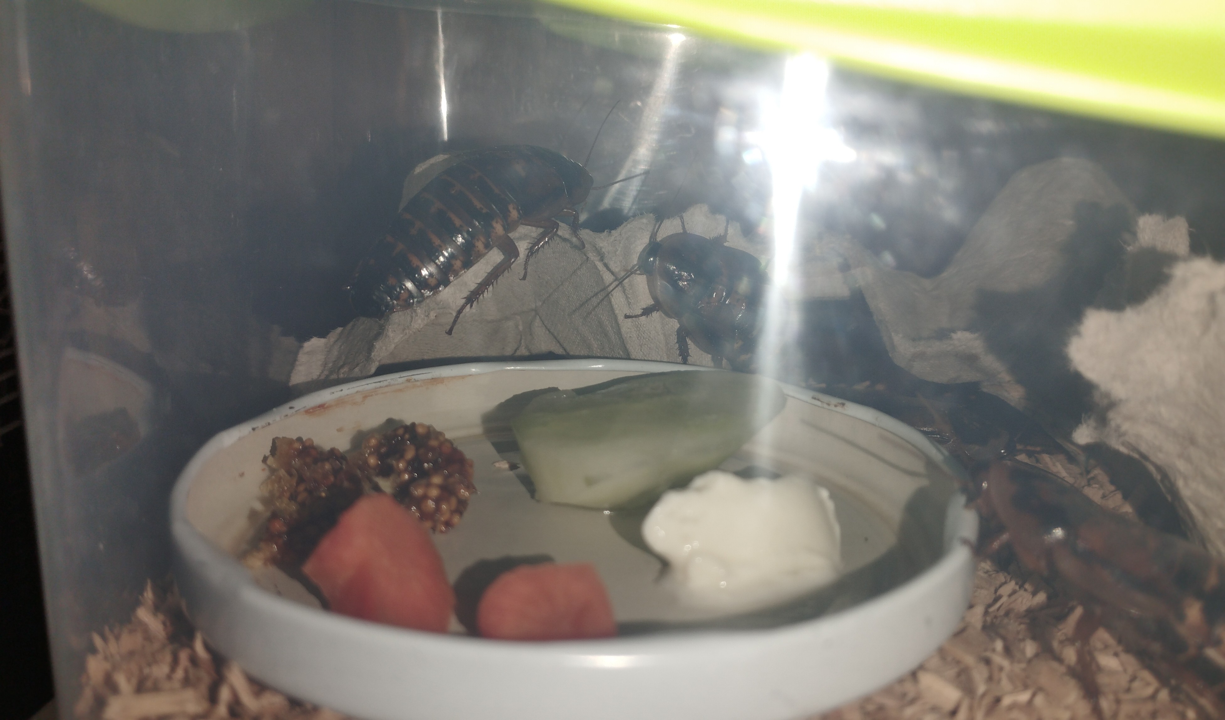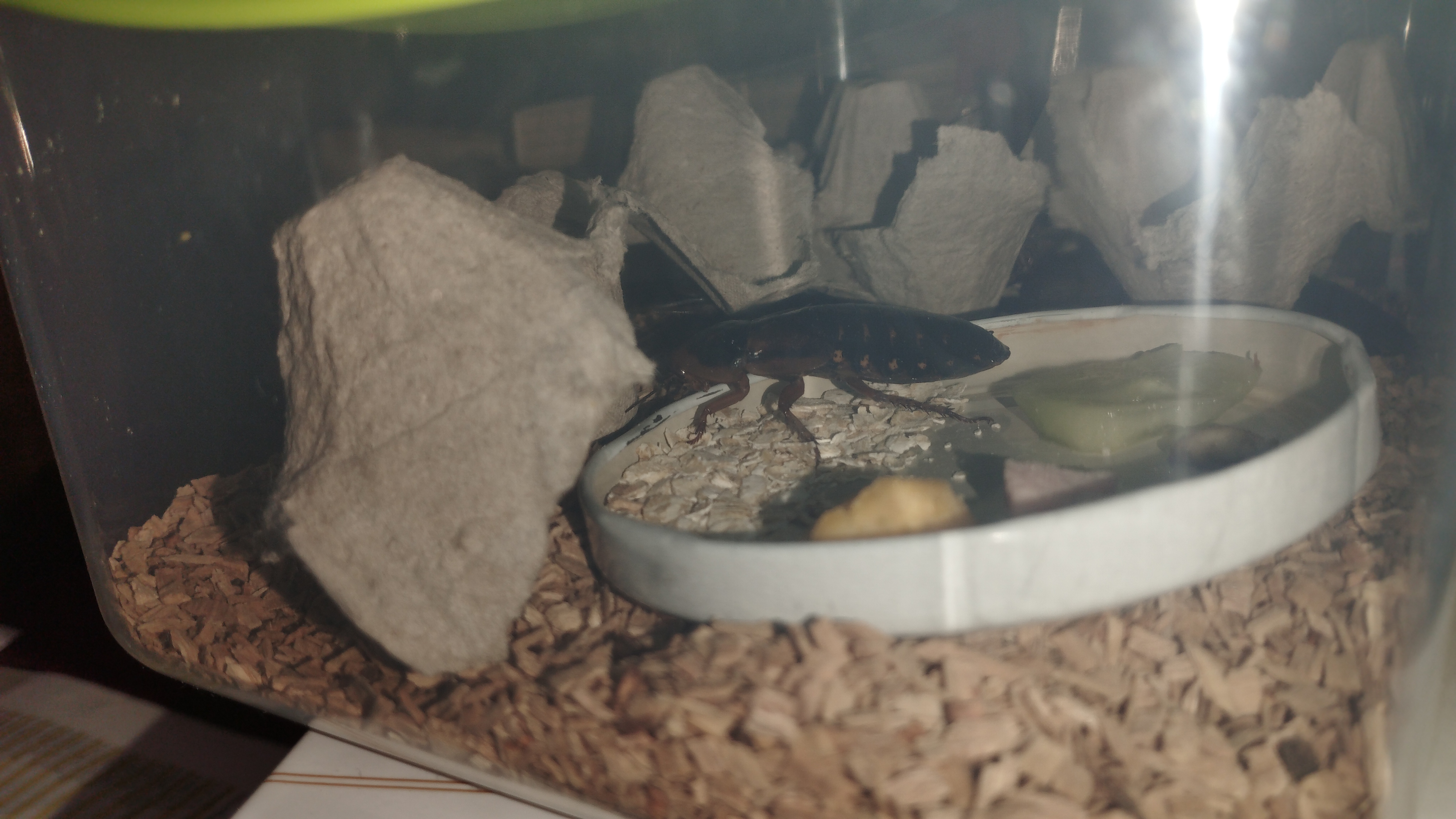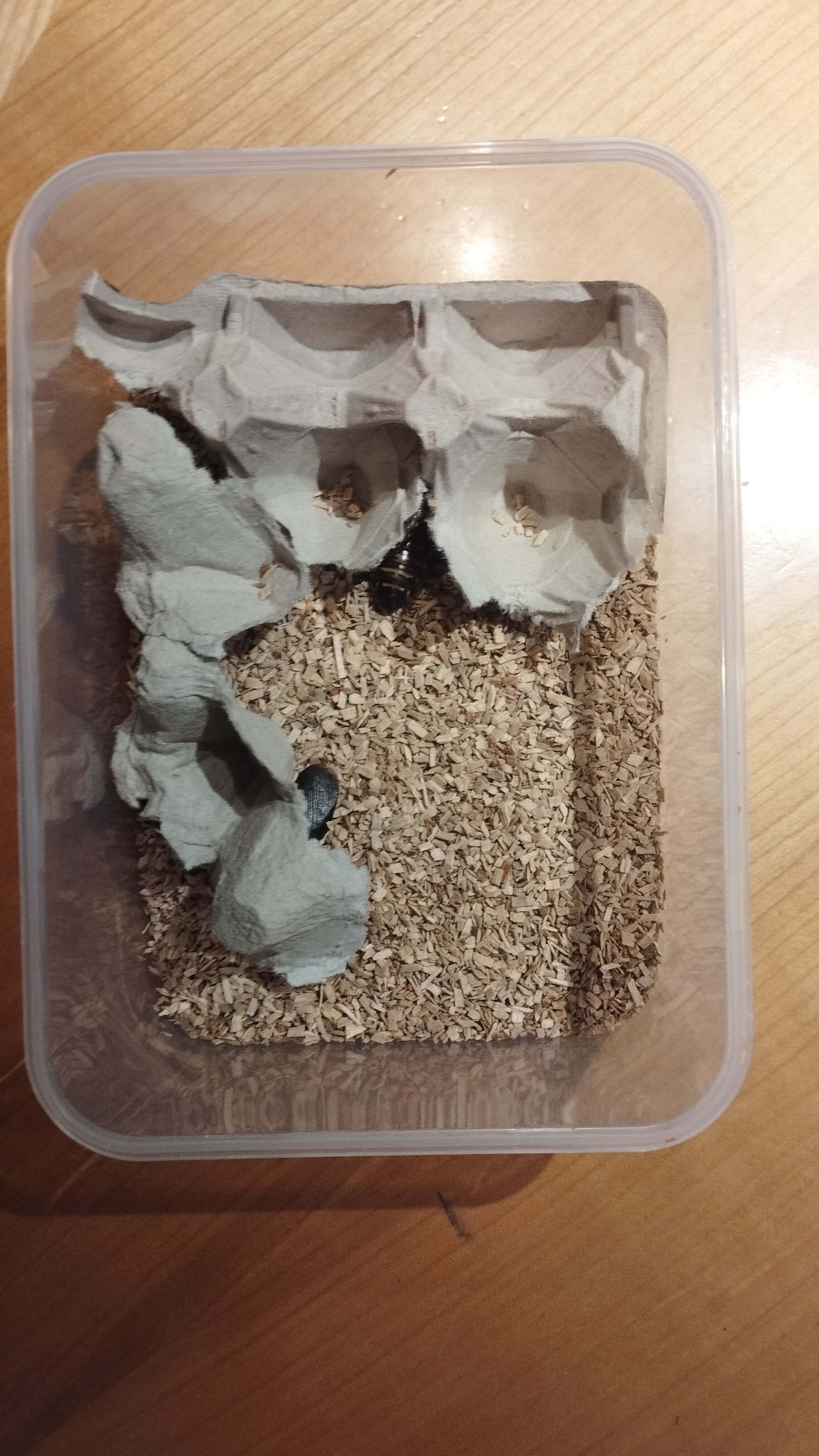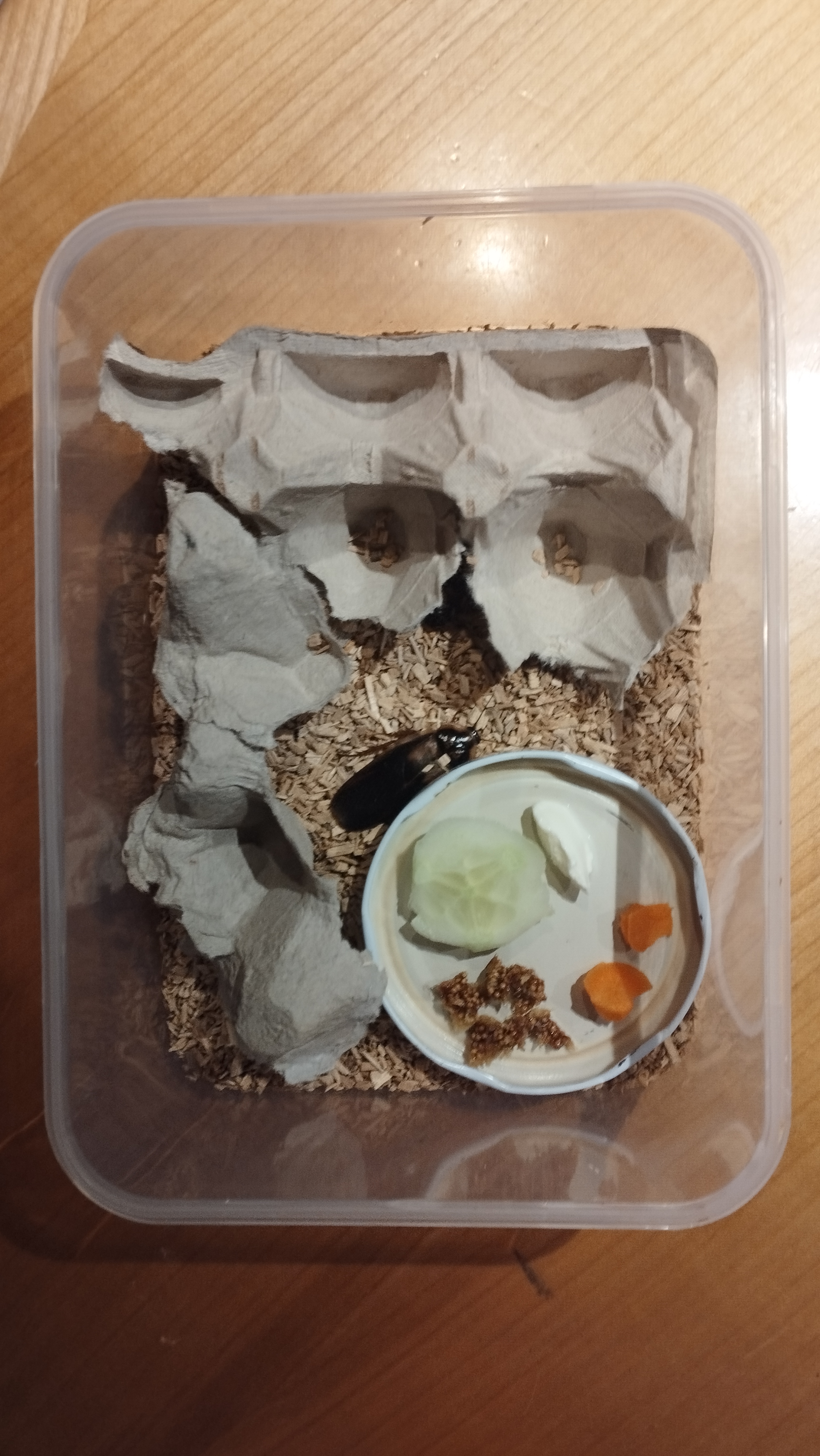 So viel schonmal dazu, desweiteren habe ich bemerkt, dass ich das Gemüse wohl 1-2 Tage zu lange drin hatte, sodass sich auf der Futterschale langsam Schimmel gebildet hat. Dementsprechend (und weil es sicherlich auch so nicht schaden kann) habe ich die Schaben einmal kurz 10 Minuten umgesiedelt und in der Zwischenzeit die kleine Plastikbox (die bald aber größer werden wird) gesäubert, sprich mit Wasser abgewaschen, die Holzspäne gewechselt und neue Eierkartons hinein gelegt. Aber seht selbst: