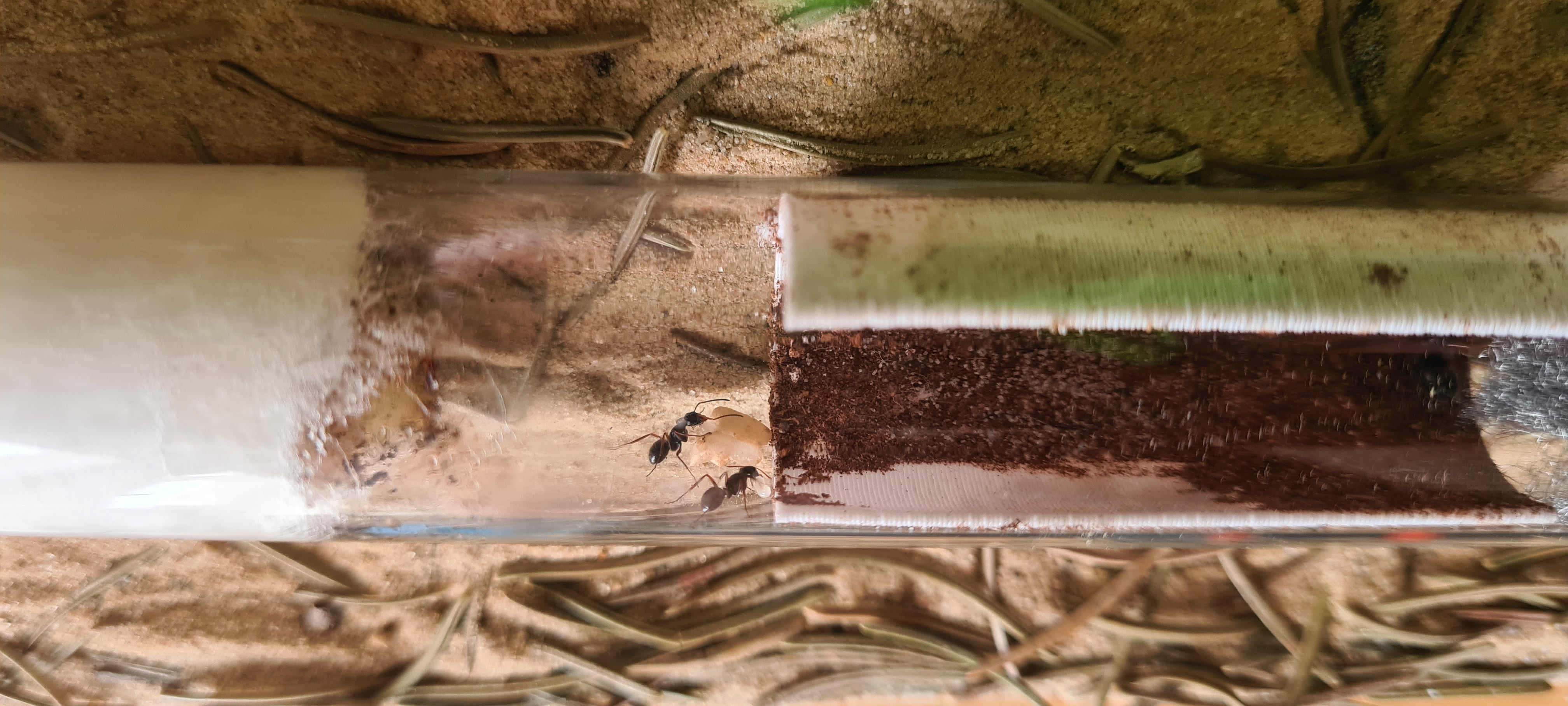 Das Formicarium wird nun langsam erkundet. Aber meist ist nur eine Arbeiterin am umherstreifen. Sie hat auch noch längst nicht alles erkundet.