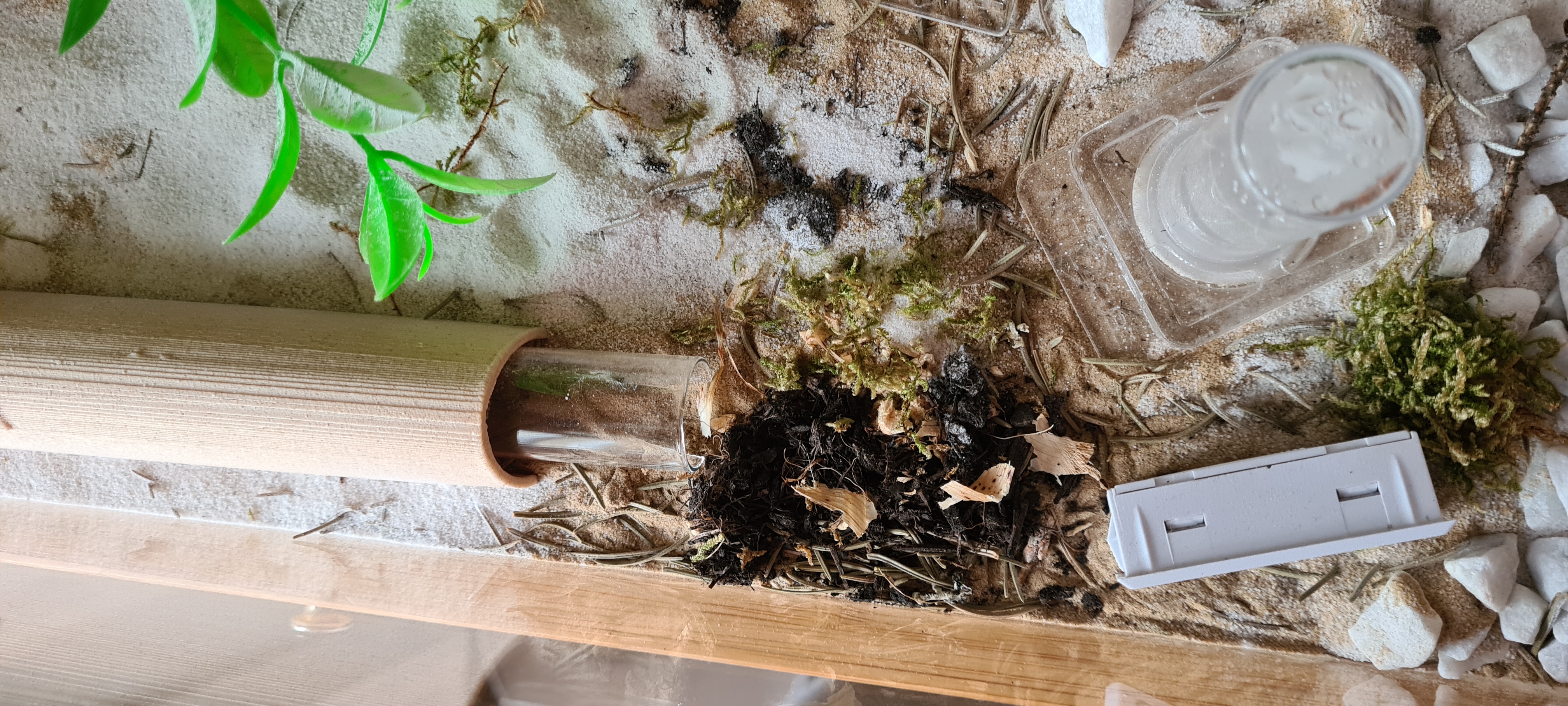 Idealer Weise verschließen die Ameisen den Eingang vom RG mit Material, das sie in der Arena finden, selbst. Das hat den Vorteil, dass sie den Ausgang nach Belieben verkleinern/vergrößern können, womit sie auch das Mikroklima im RG regulieren. In deiner Arena gibt es eine Menge Nadeln, welche für diesen Zweck geeignet sind, aber nicht unbedingt ideal, einfach weil sie so lang und spitz sind und für ein-/ausgehende Arbeiterinnen zum Hindernis werden können.