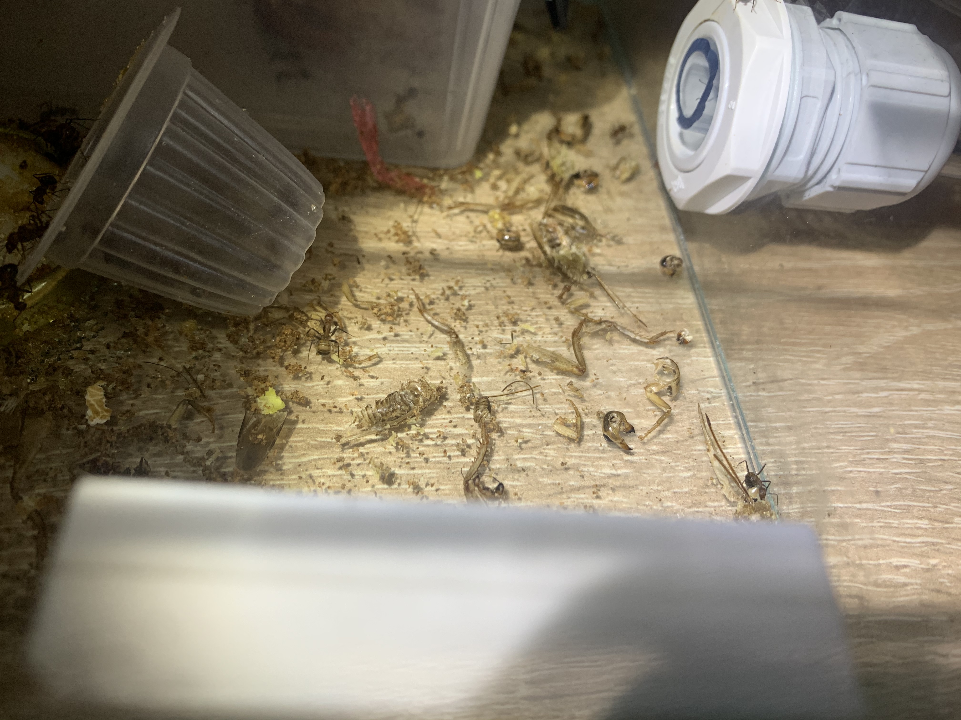 Am 23.12.2020 habe ich neben den Wachsmaden auch noch 5-6 Heimchen in die Arena gelegt, alle sind verputzt worden, die Ăśberreste sind auf dem Foto gut ersichtlich.