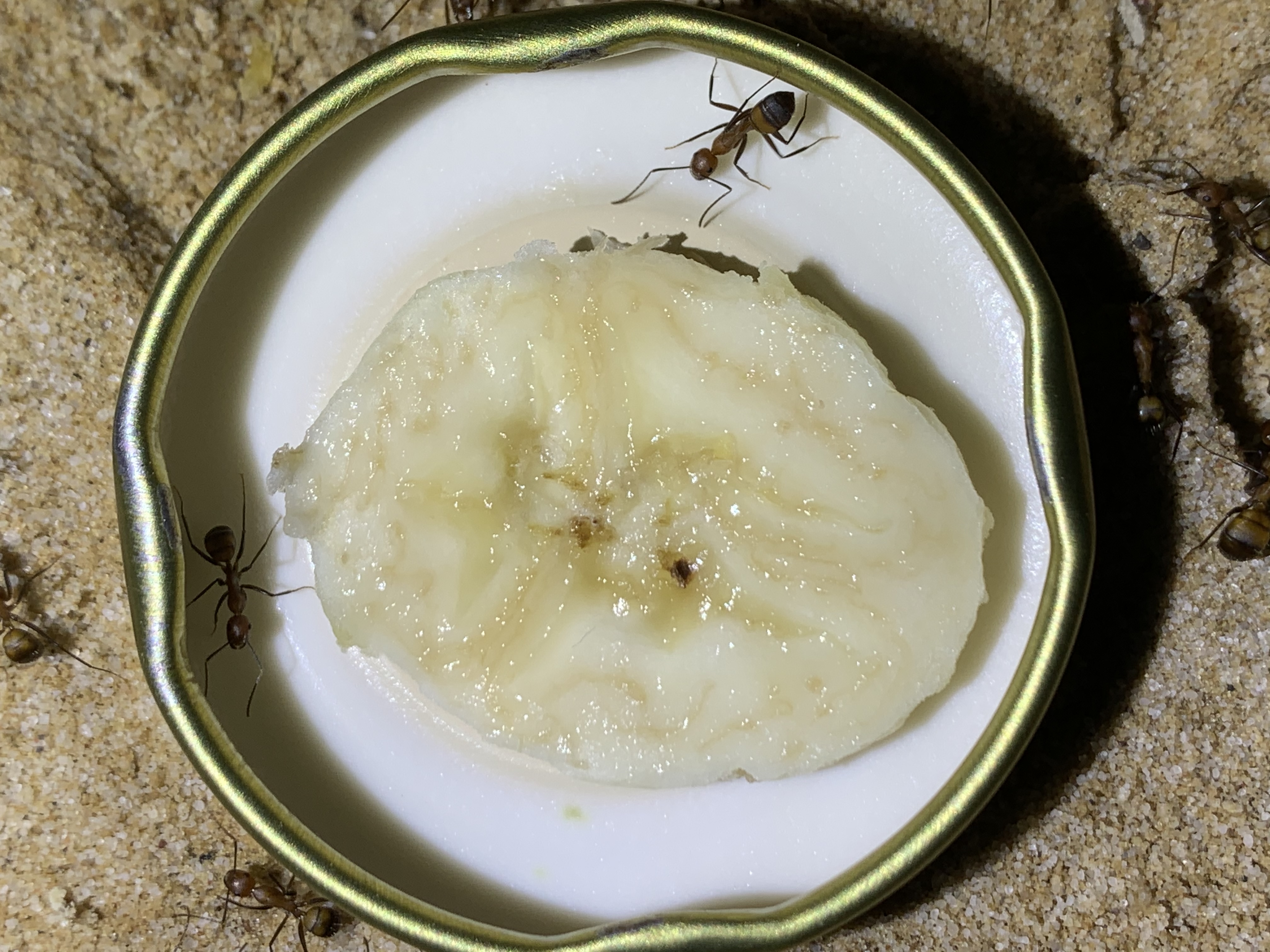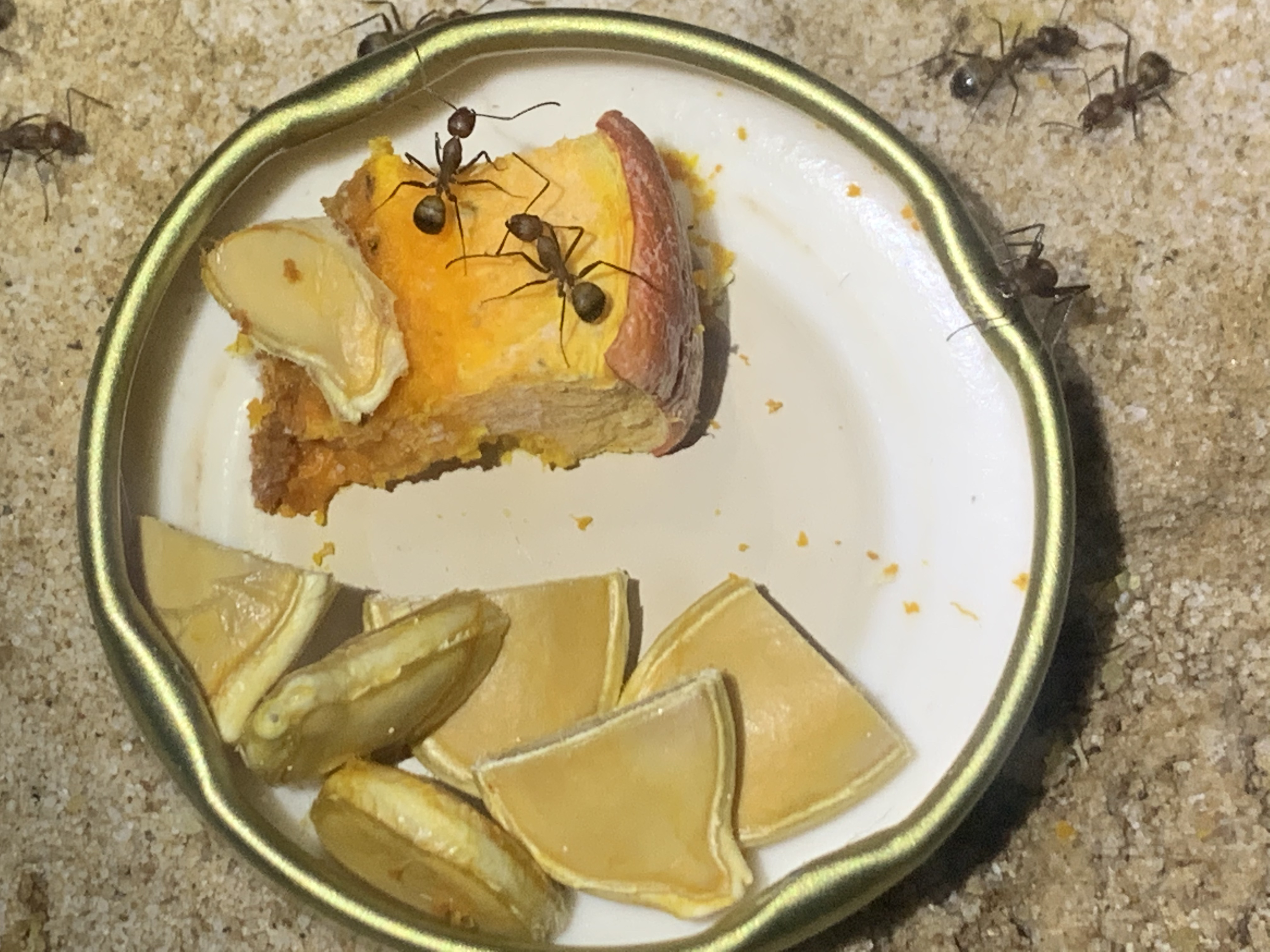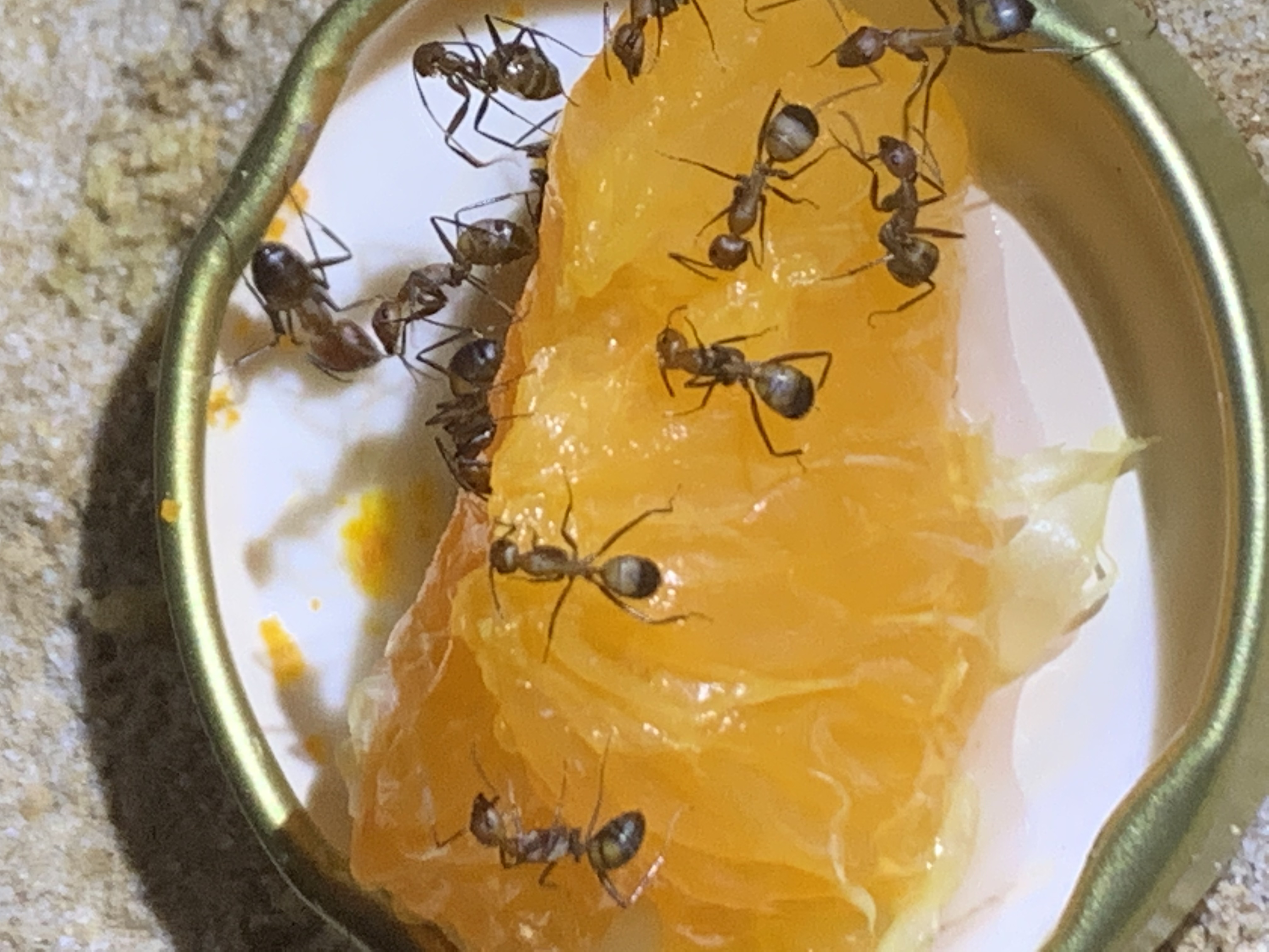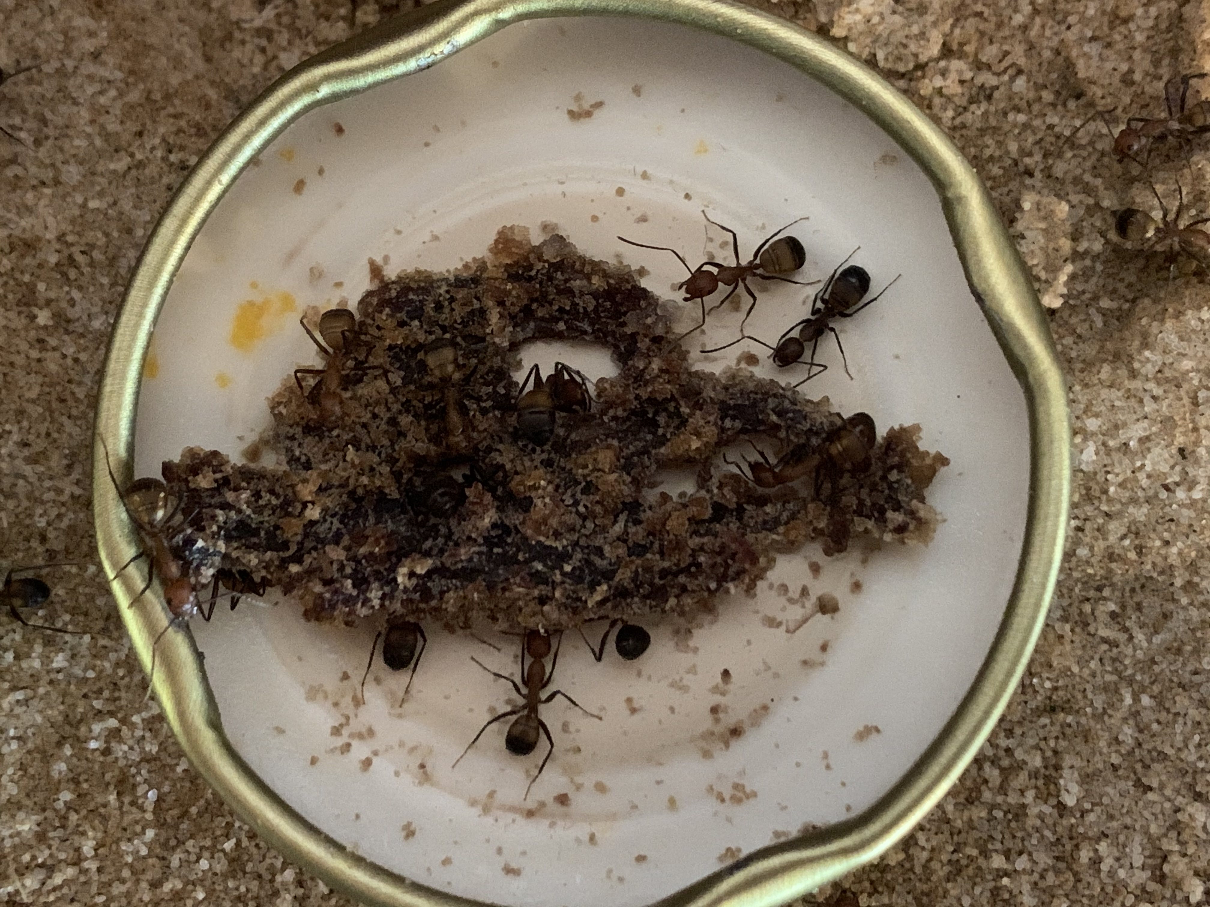 Zwei Arbeiterinnen waren ganz lange an einem Invertzuckerwassertropf (Mischverhältnis 45 1/3.79 zu 45 1/3.79) und haben genüsslich getrunken