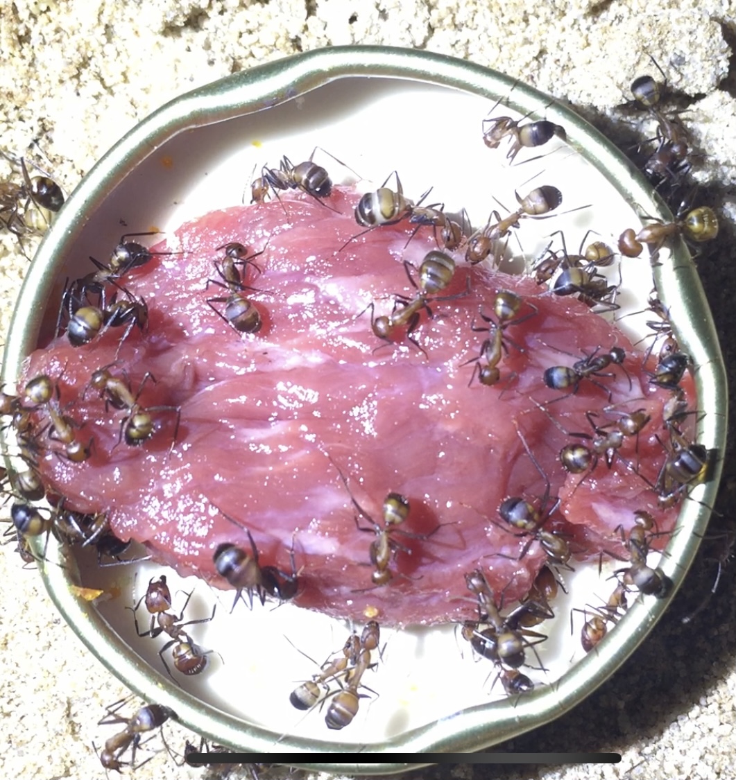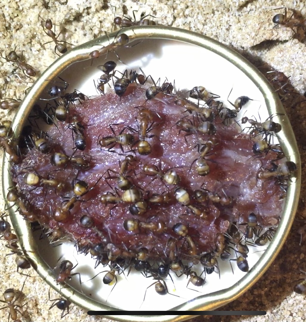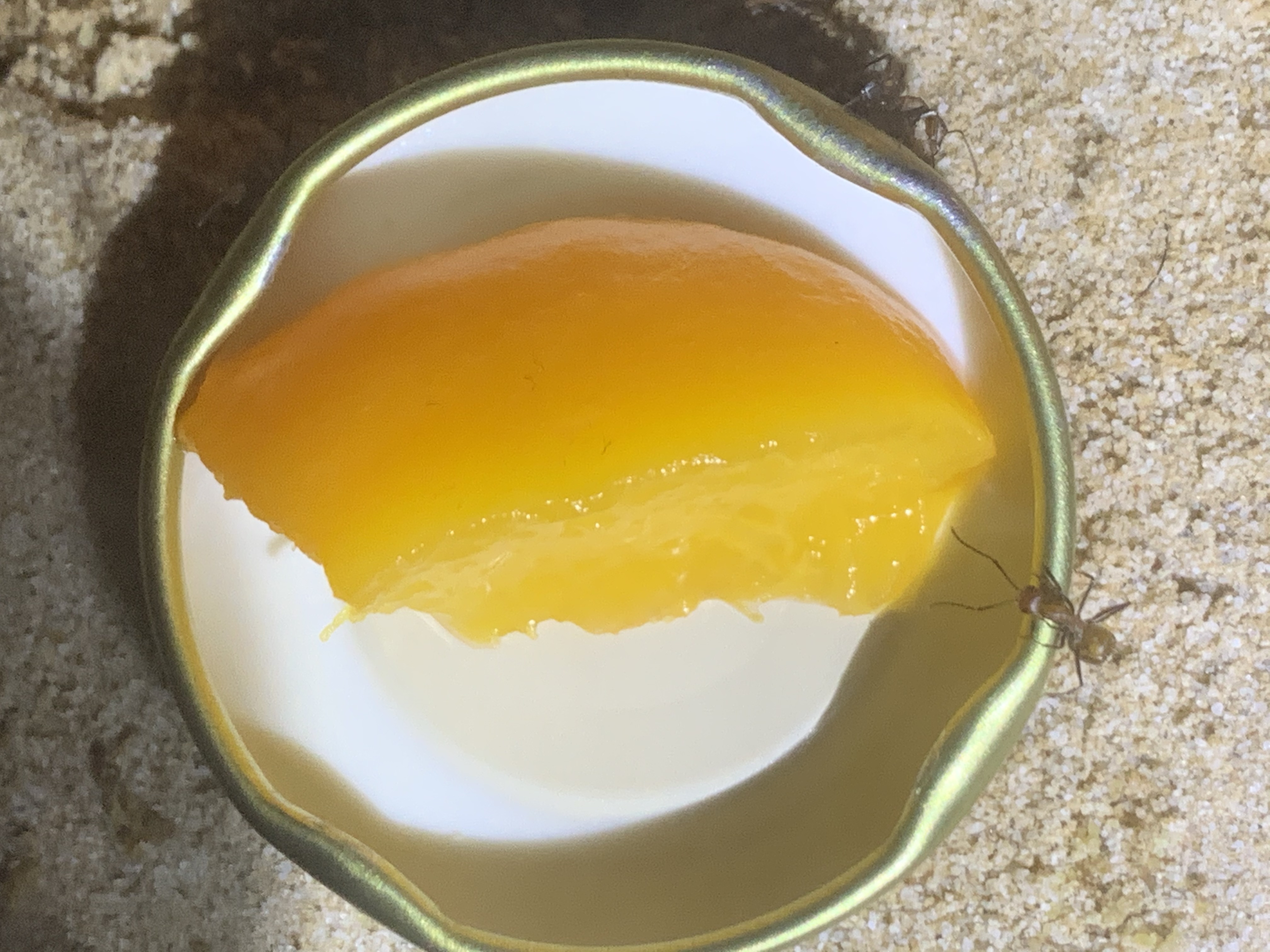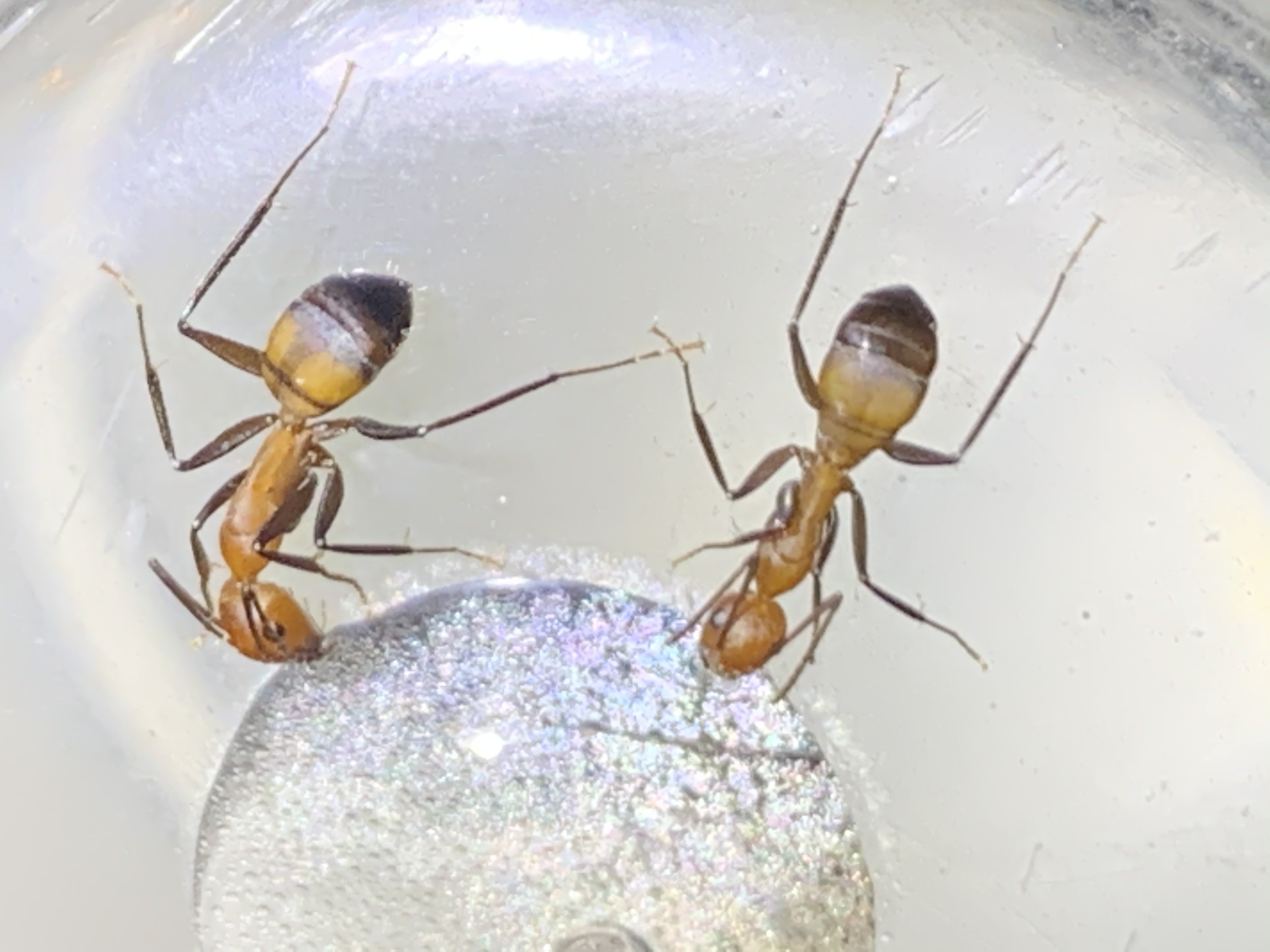 Zwei Arbeiterinnen waren ganz lange an einem Invertzuckerwassertropf (Mischverhältnis 45 1/3.79 zu 45 1/3.79) und haben genüsslich getrunken