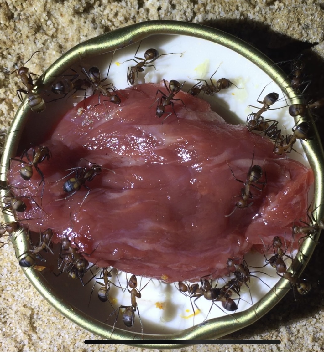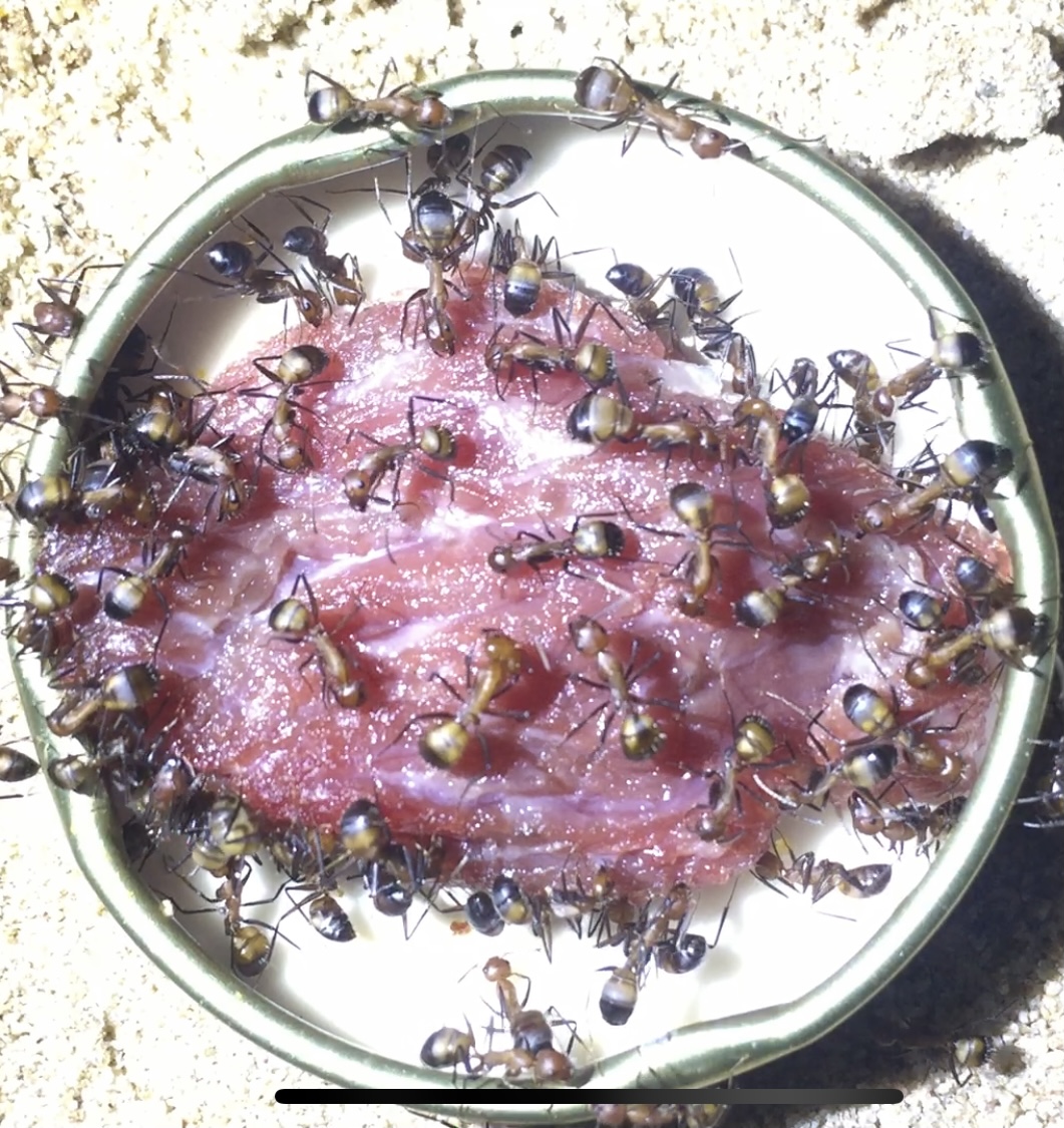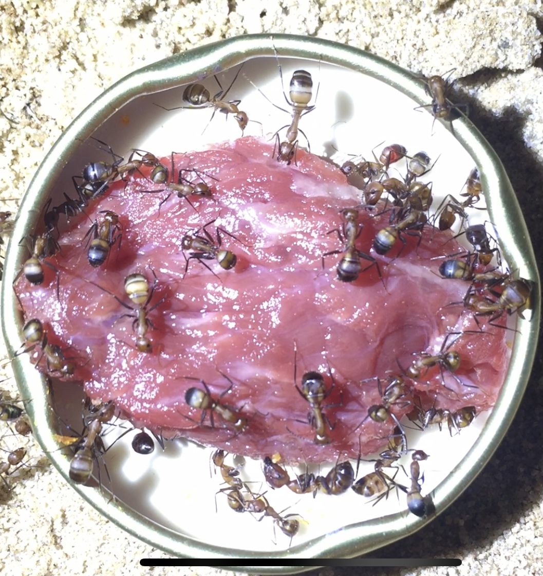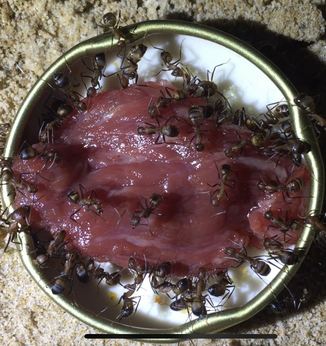 Zwei Arbeiterinnen waren ganz lange an einem Invertzuckerwassertropf (Mischverhältnis 45 1/3.79 zu 45 1/3.79) und haben genüsslich getrunken