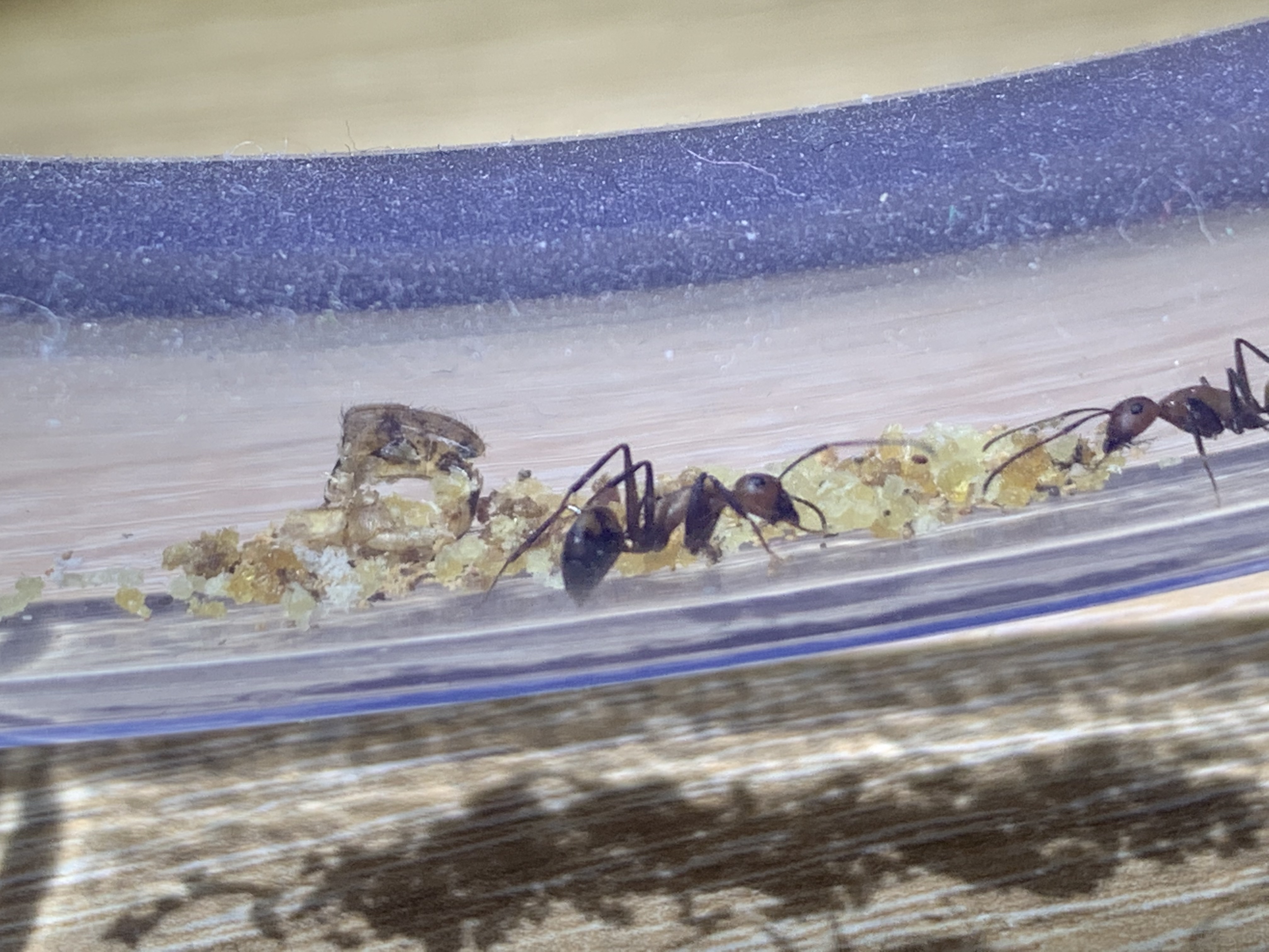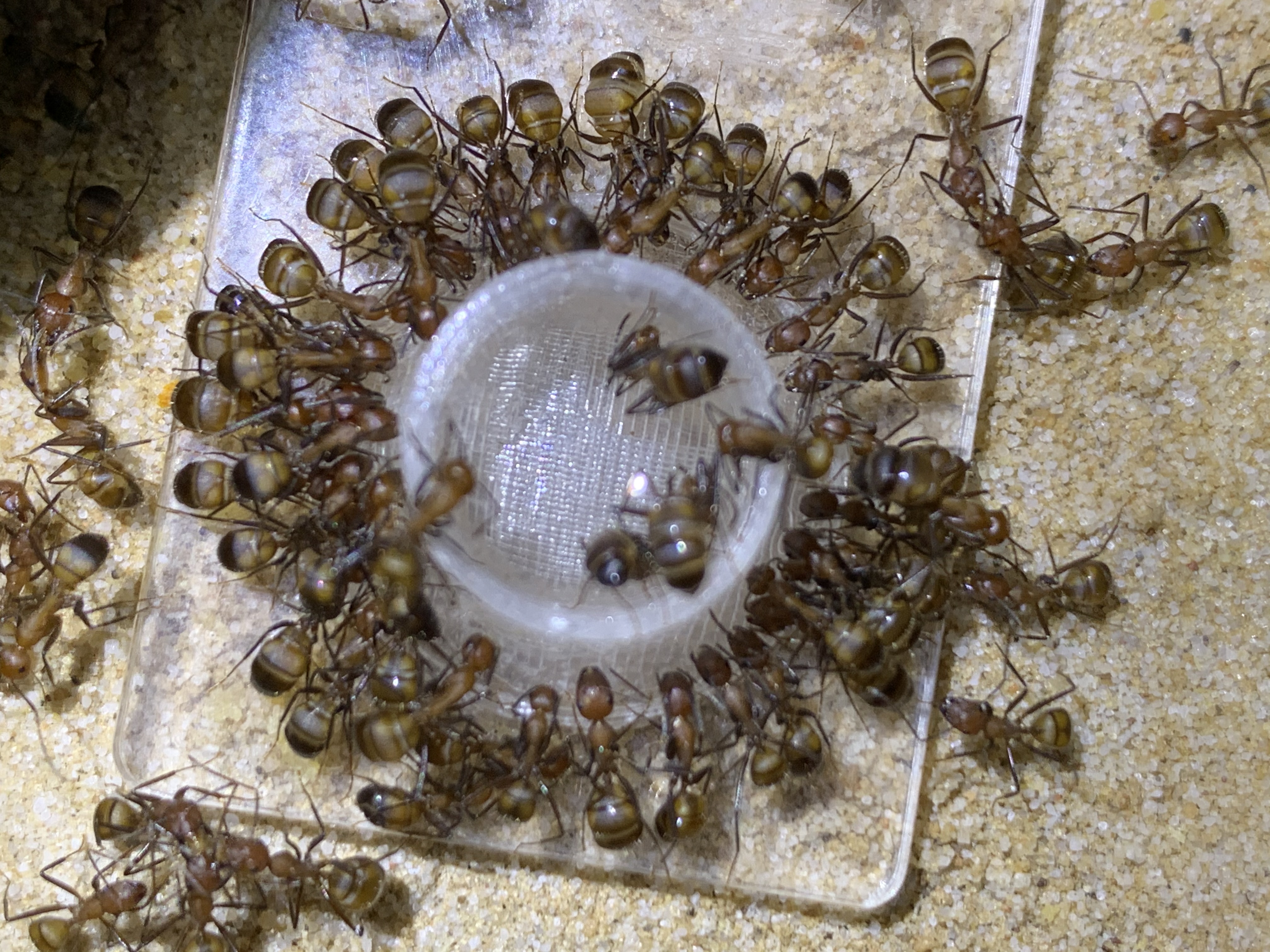 Ich habe vorhin meinen Camponotus nicobarensis vorhin wiedermal eine Portion mit Invert-Zucker verdünntes Wasser gegeben. Ein paar Tage habe ich ihnen keinen Zucker mehr gegeben. Sie sind wie Junkies auf Entzug auf dieses Gemisch los (oder wie Schwiegermütter die um einen Wühltisch um Liebestötern feilschen)