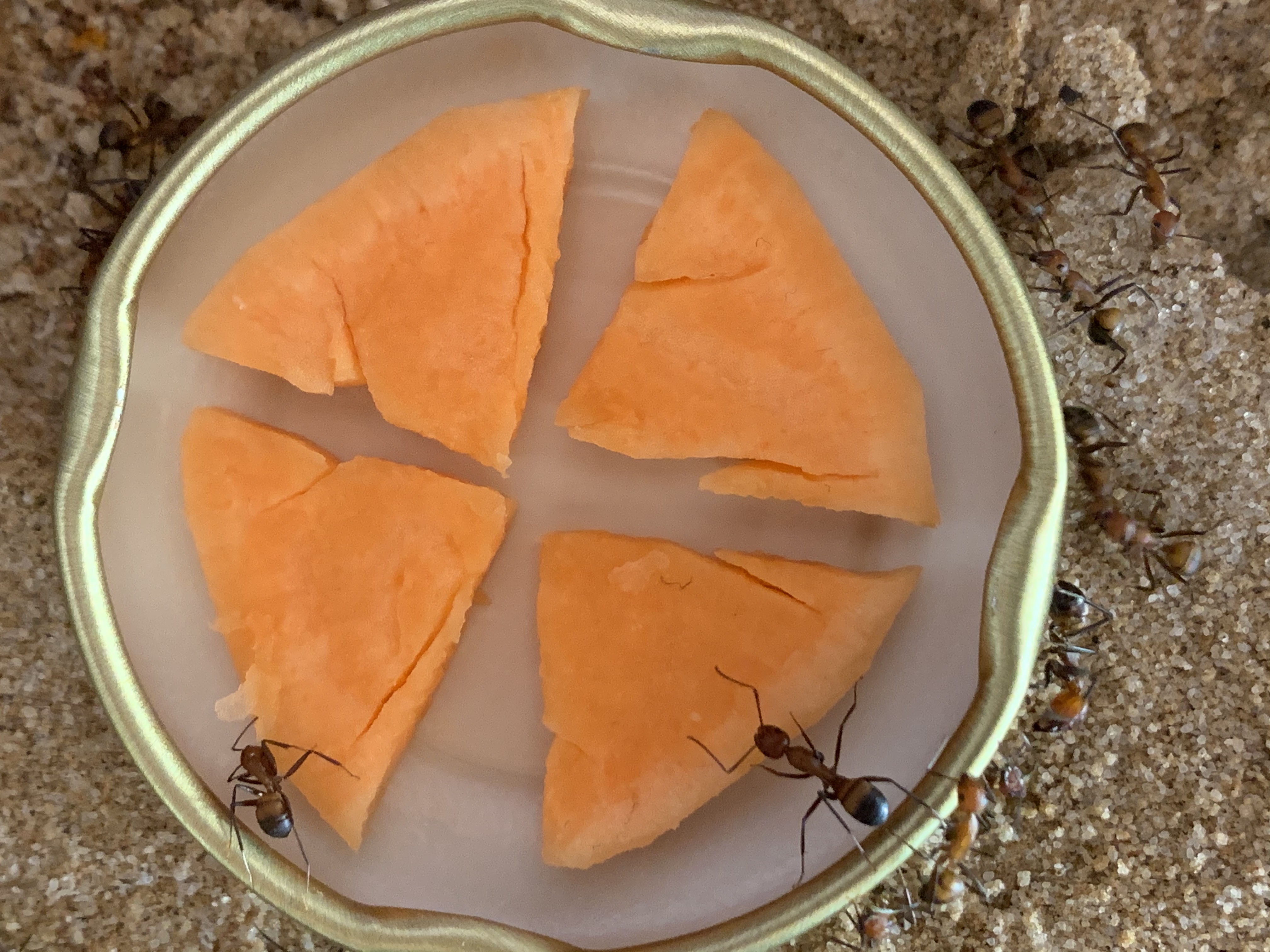 Als ich heute vor dem Mittagessen in die Küche ging habe ich meine Frau dabei ertappt, wie sie das Mittagessen zubereitet! Sie hat Süsskartoffeln geschnitten (Süsskartoffeln haben einen Stich ins Rote). Als ich ihr zuschaute wie sie diese Teile zerhackte dachte ich mir, dass sehr viele Lebensmittel welche ich meinen Camponotus nicobarensis angeboten habe einfach ignoriert wurde.