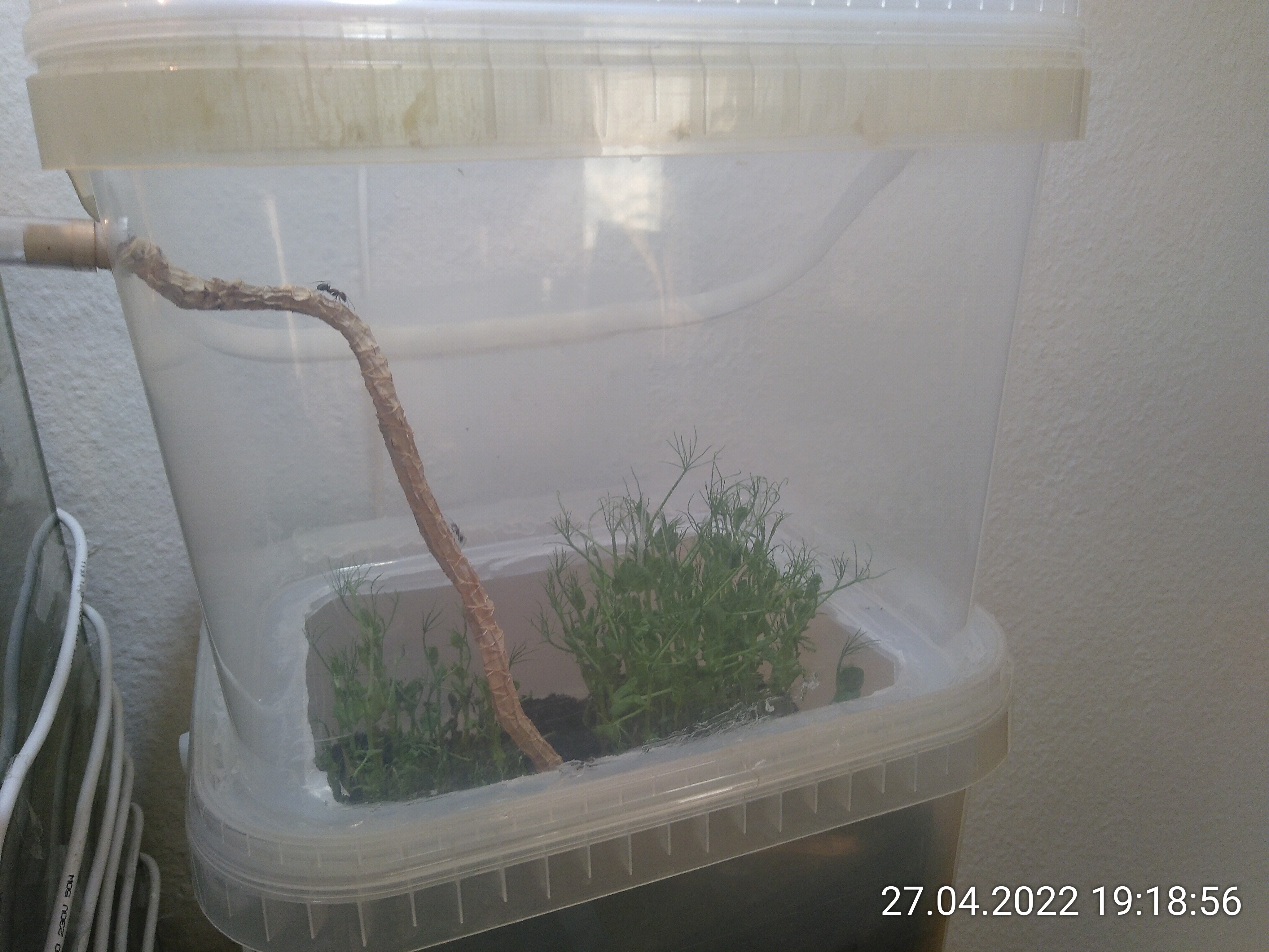 Das Plexiglas habe ich sogar in der richtigen Größe bekommen. Ich habe noch eine zweite Scheibe gekauft, um evtl. auch die Seiten verkleiden zu können. Das würde zum einen den Draht besser fixieren und zum anderen die Feuchtigkeit besser halten und Verdunstung vorbeugen. Ein Wasserbett soll ja nicht austrocknen. Bei 20 x 20 x 5 cm passen die Scheiben, auch 20 x 20, perfekt. Das war das einzige, das ich kaufen musste. Alles andere war schon da.