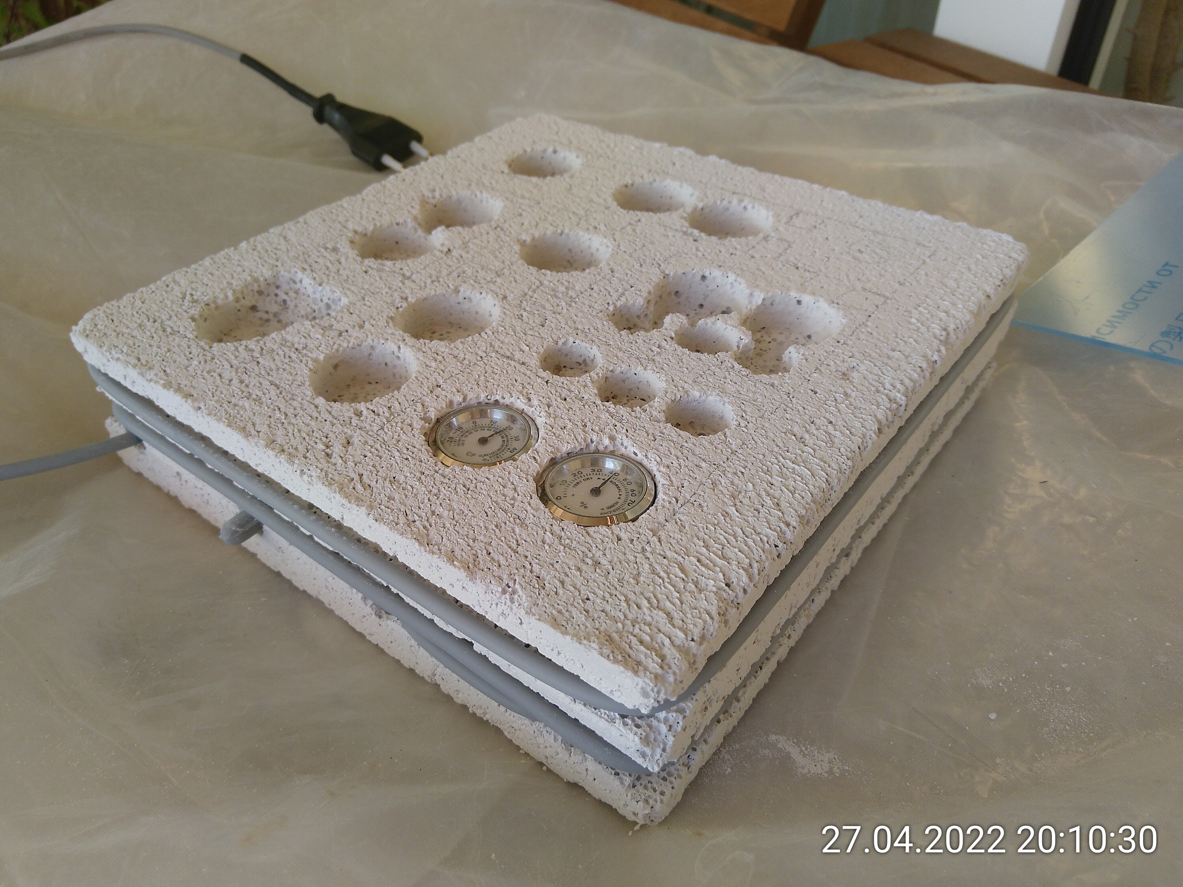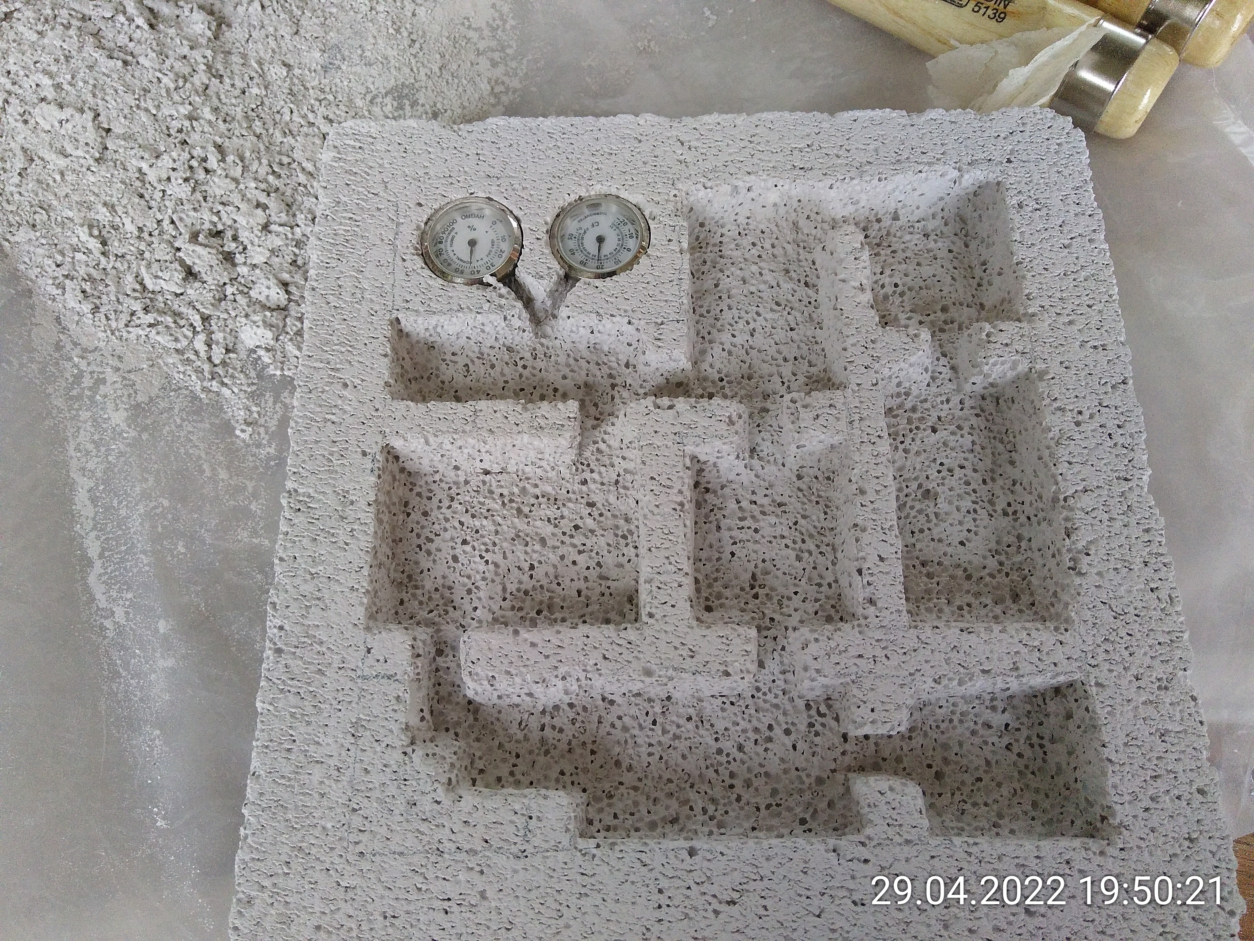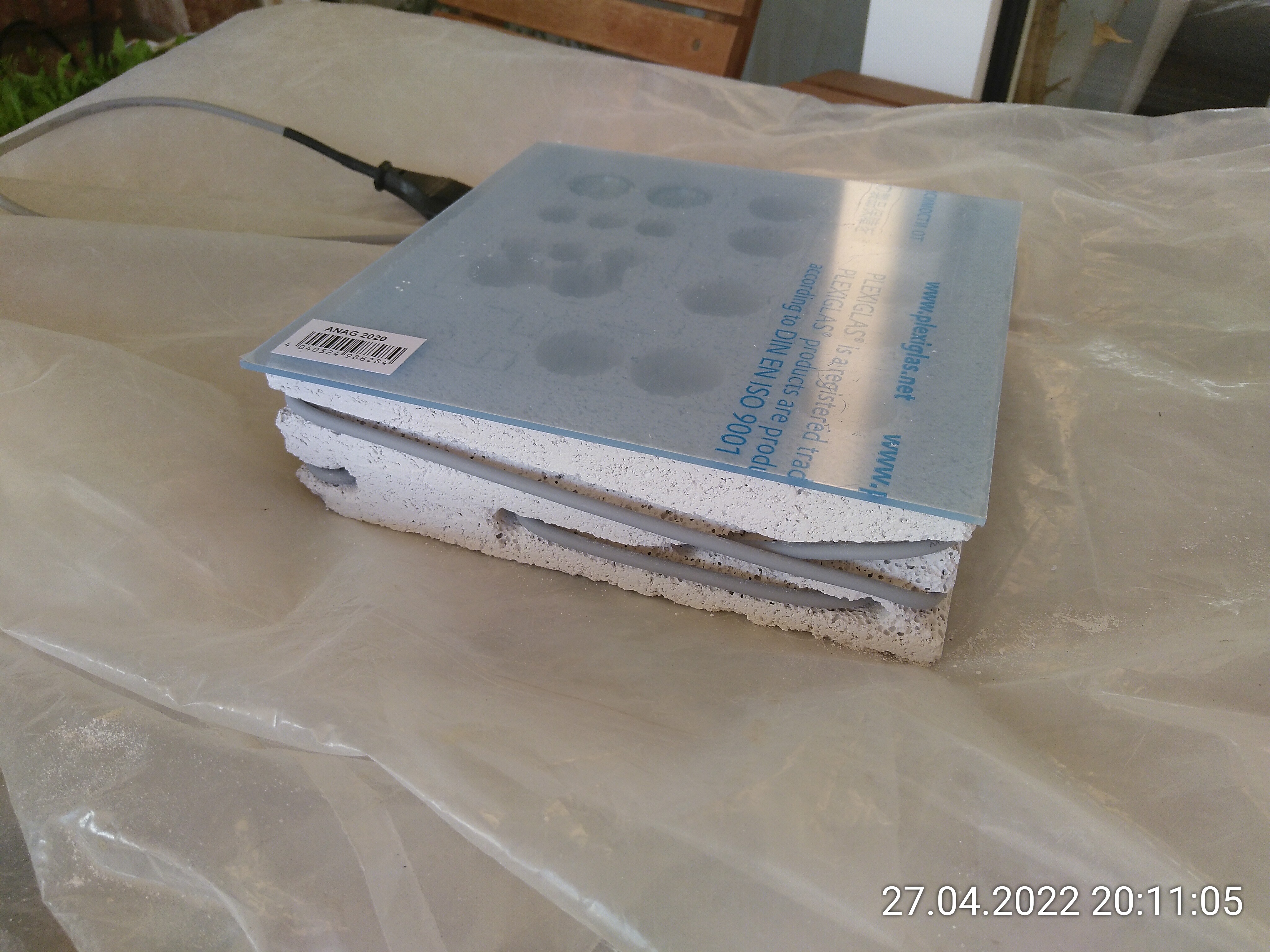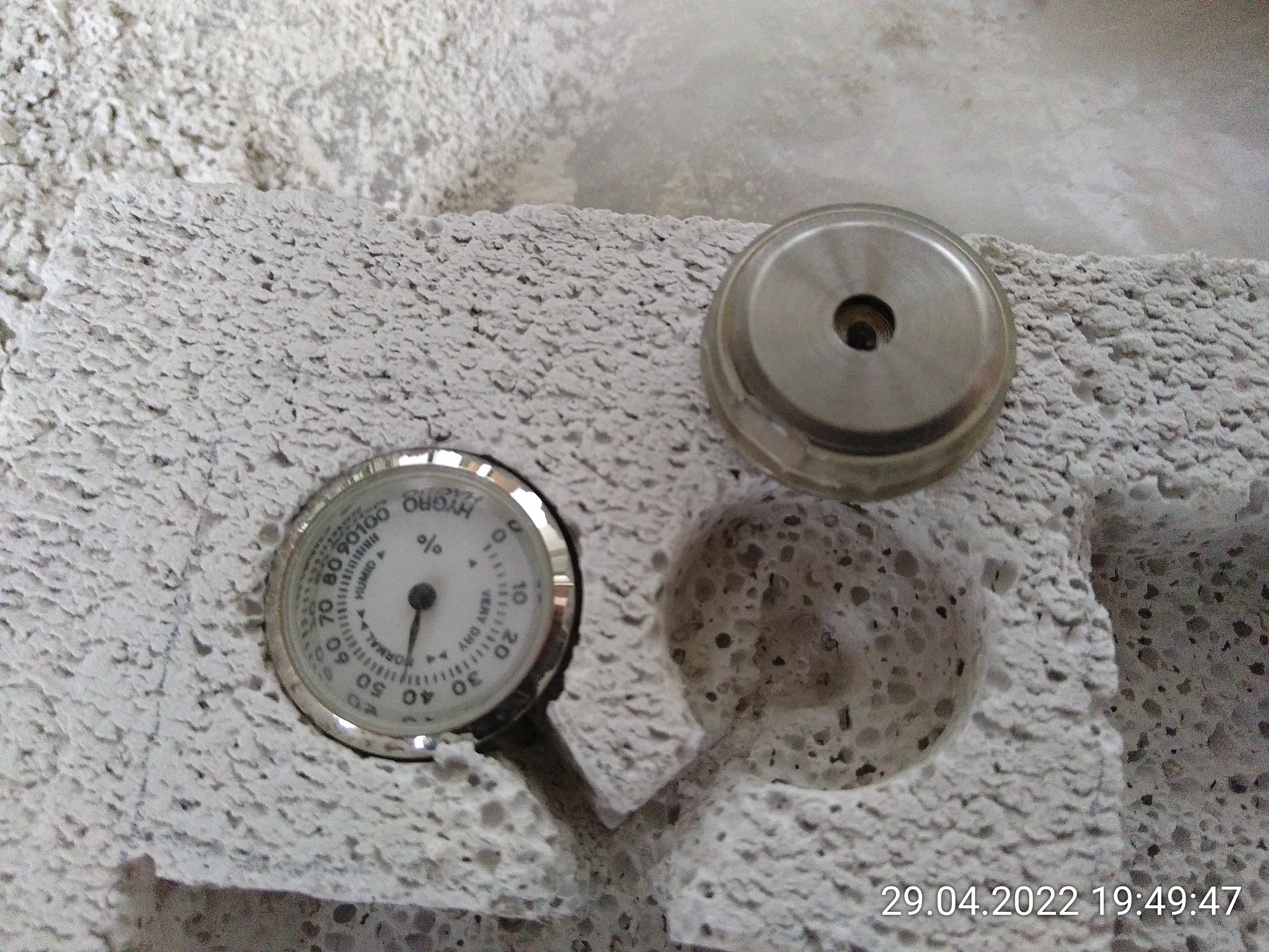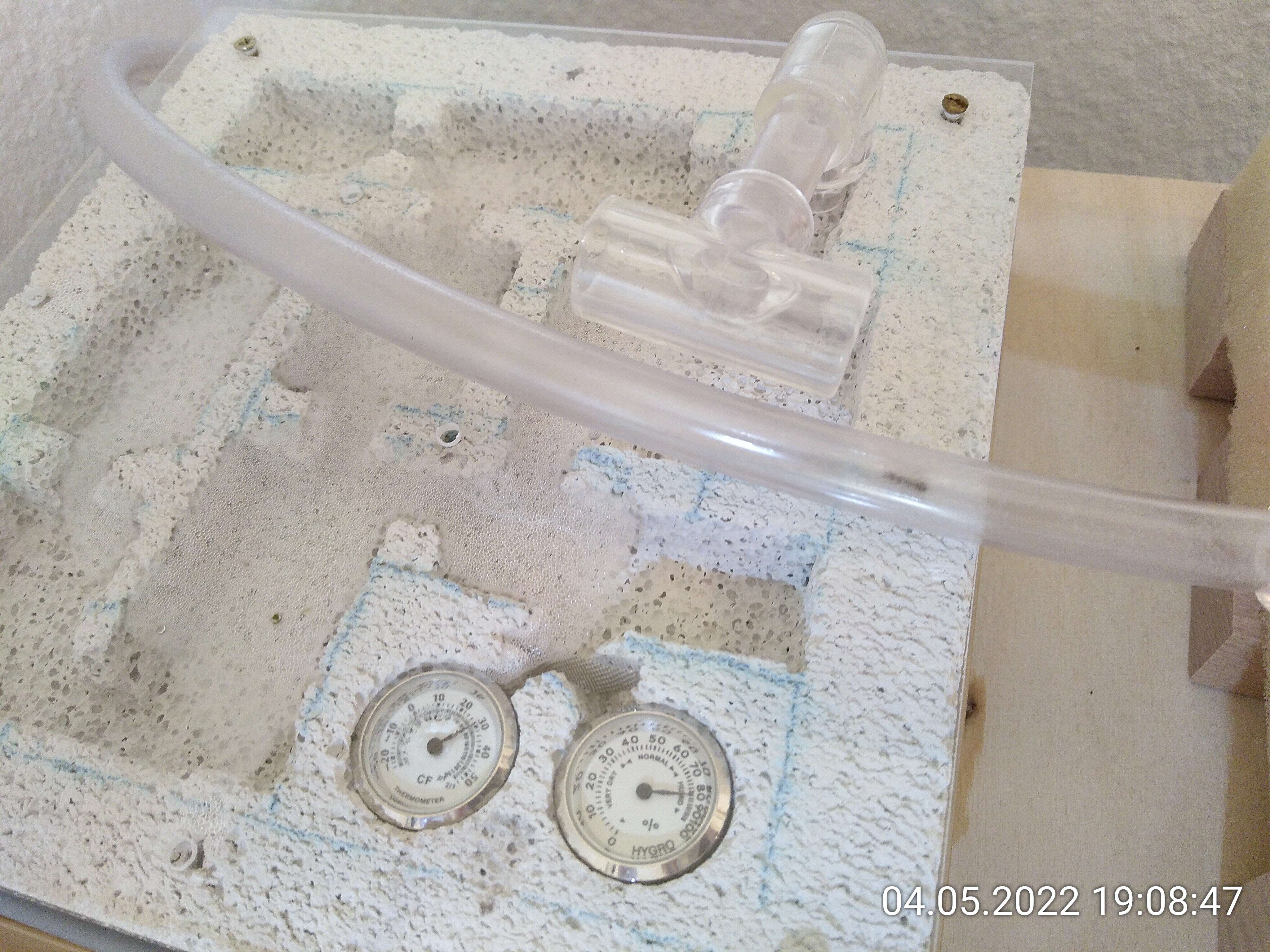 Nach 2 Stunden sind es 30 °C und 80 % LF. Die Scheibe ist beschlagen. Das muss sich jetzt erstmal einpegeln. Morgen teste ich wahrscheinlich eine Windung des Heizdrahts weniger. Ach ja, ich seh grad, ich muss das Schutzgitter noch installieren und eine Aufnahme dafür aussägen. Die Folie ziehe ich erst vom Plexiglas ab, wenn die Ameisen einziehen. Vorher drehe ich auch keine Schrauben in den Stein. Das will ich nur einmal machen.