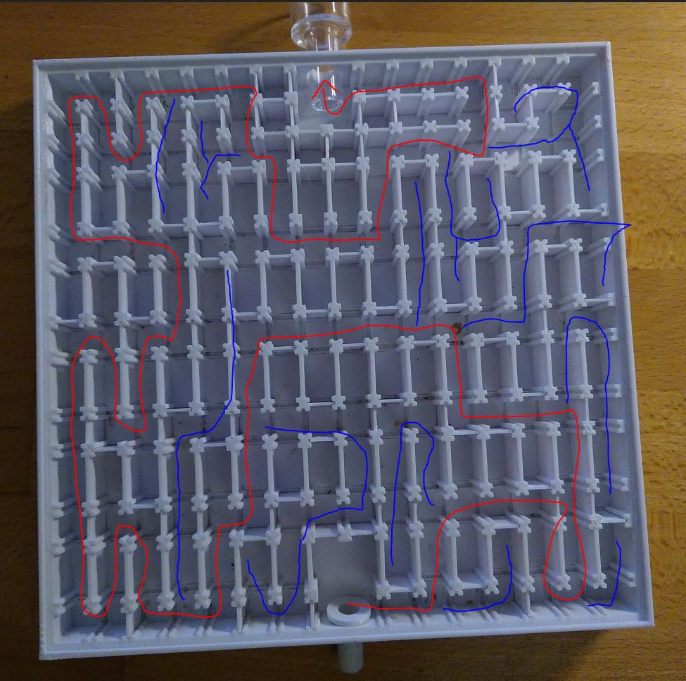 Die ersten beiden stürmen sofort rein. Nummer eins mit einem kleinem Umweg über meine Hand. Von den ersten 10, die schon nach einer Minute im Lab waren, sind drei schon wieder auf dem Rückweg, um die Schwestern zu informieren und Verstärkung zu rekrutieren. Nach vier Minuten hat die Entschlossenste fast die Hälfte des Weges schon gefunden. Sie ist zielstrebig an den falschen Abzweigungen vorbeigelaufen. Doch kurz danach dreht sie wieder um und läuft den beiden Verfolgerinnen entgegen. Aber die machen keine entscheidenden Fortschritte. Sie erforschen doch lieber erstmal die Sackgassen.