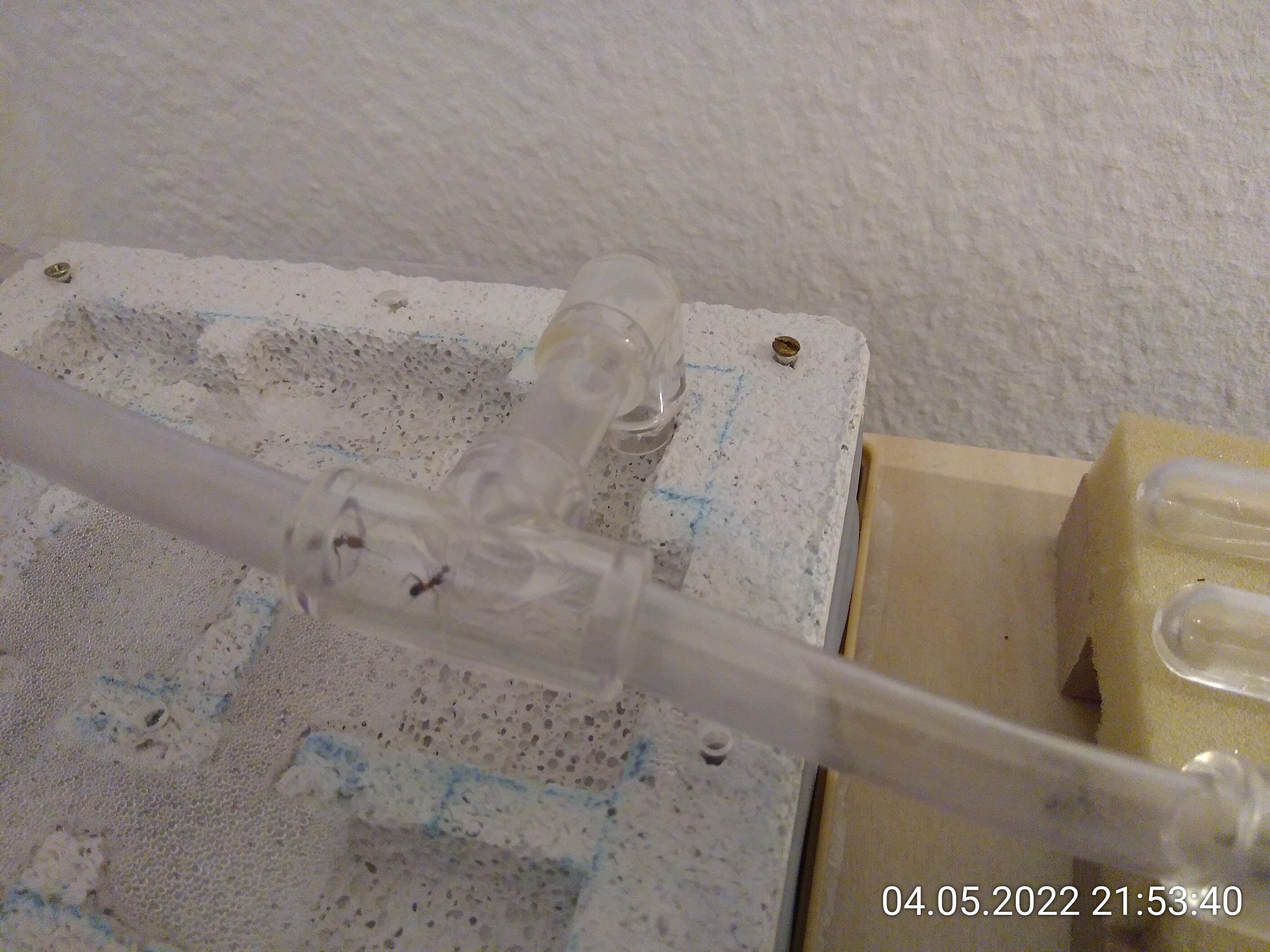 Die Lücke in der Pheromon-Spur wurde sofort geschlossen und die ersten zwei Neugierigen sind auch gleich in Richtung Wasserbett aufgebrochen. Am Ende des Schlauchs sind sie wieder umgedreht. Genau wie alle anderen, die innerhalb der ersten Minuten folgten.
