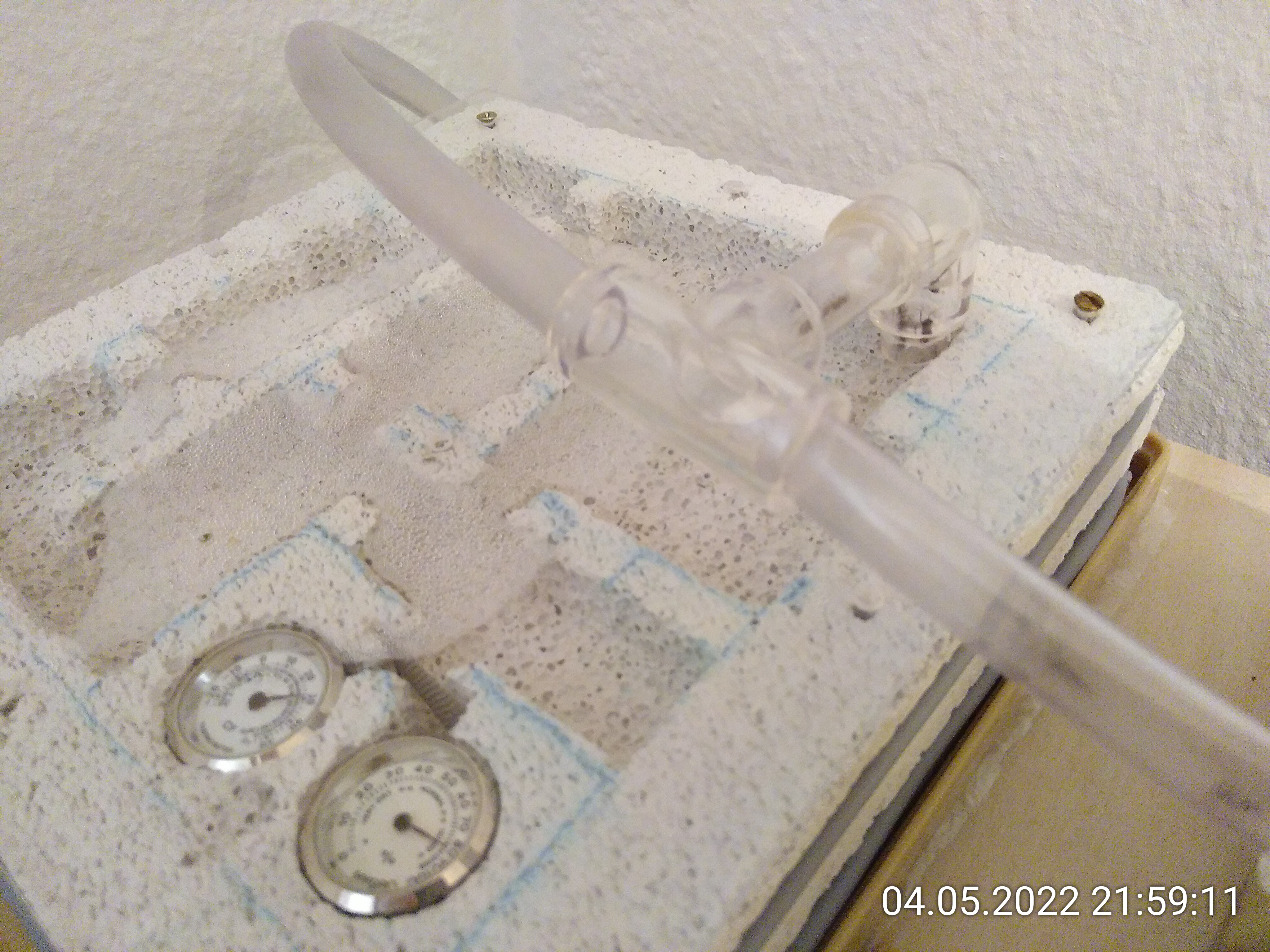 Wie ich den Anschluss plane, ist wohl gut zu erkennen. Ich muss nur noch den Schlauch durchschneiden und an das Verbindungsstück klemmen. Das Kondenswasser ist vergleichsweise wenig geworden. So sieht man fast alles. Wässern kann ich entweder über das Unterteil oder durch insgesamt 6 Löcher im Plexiglas.