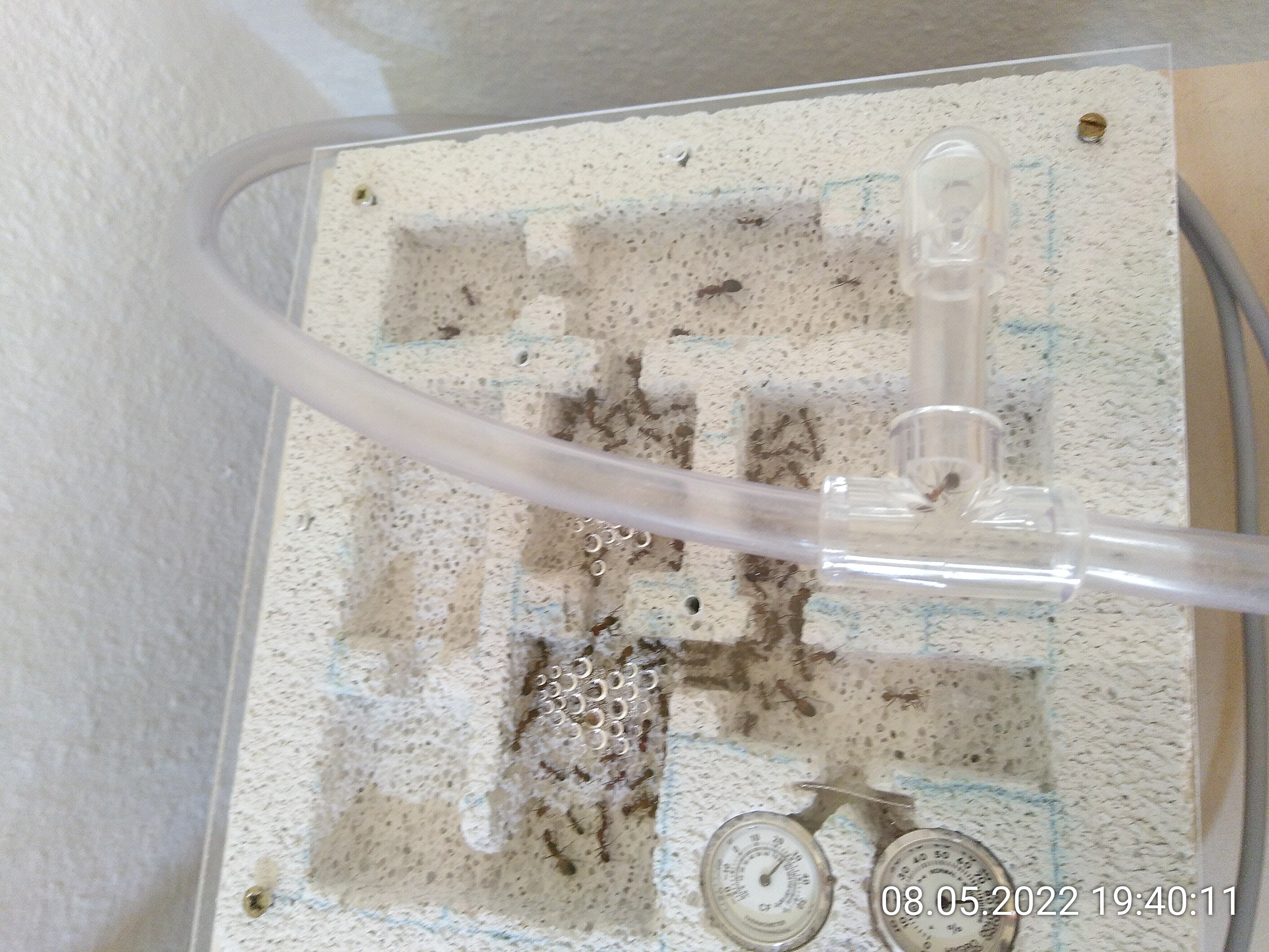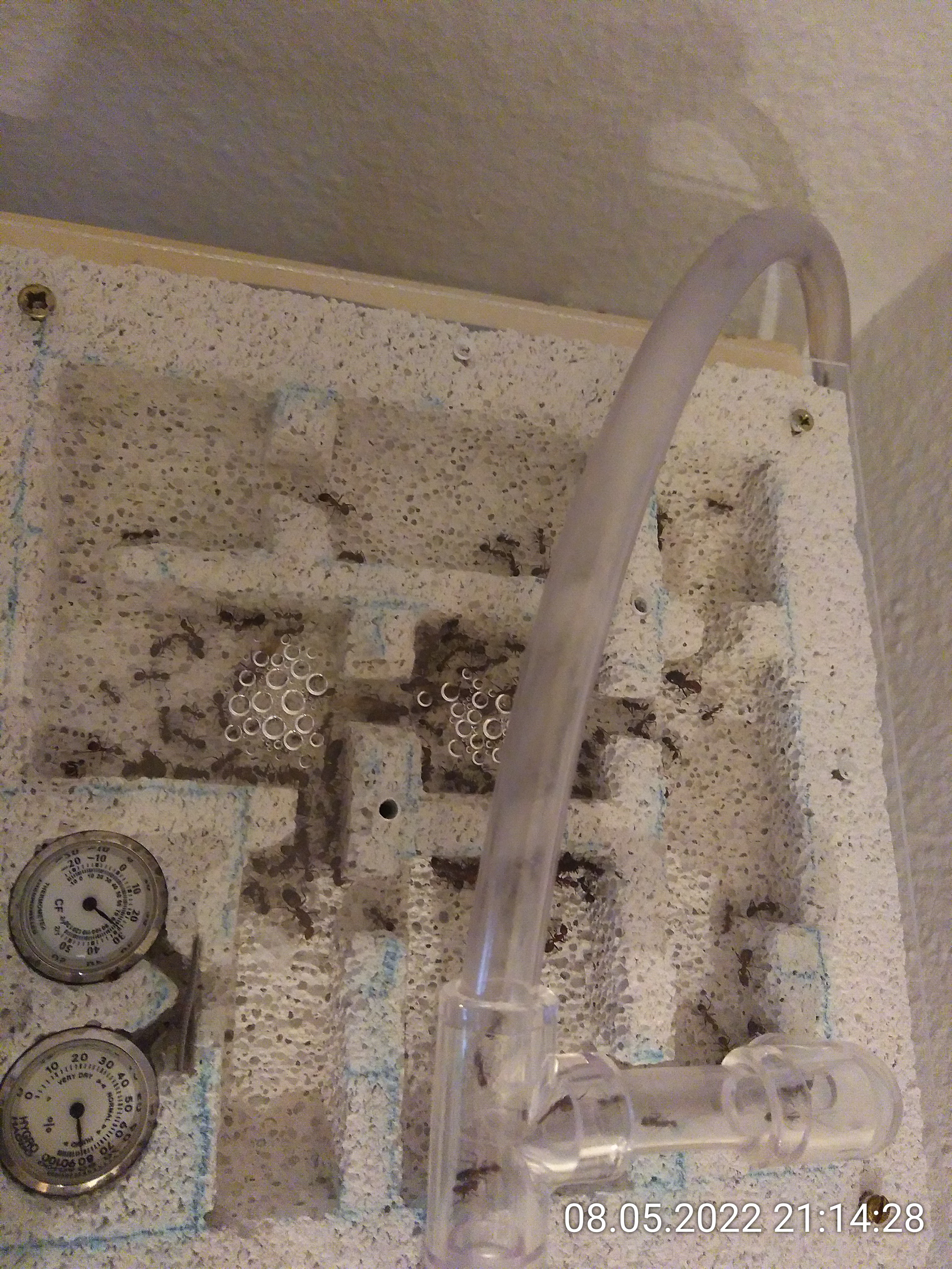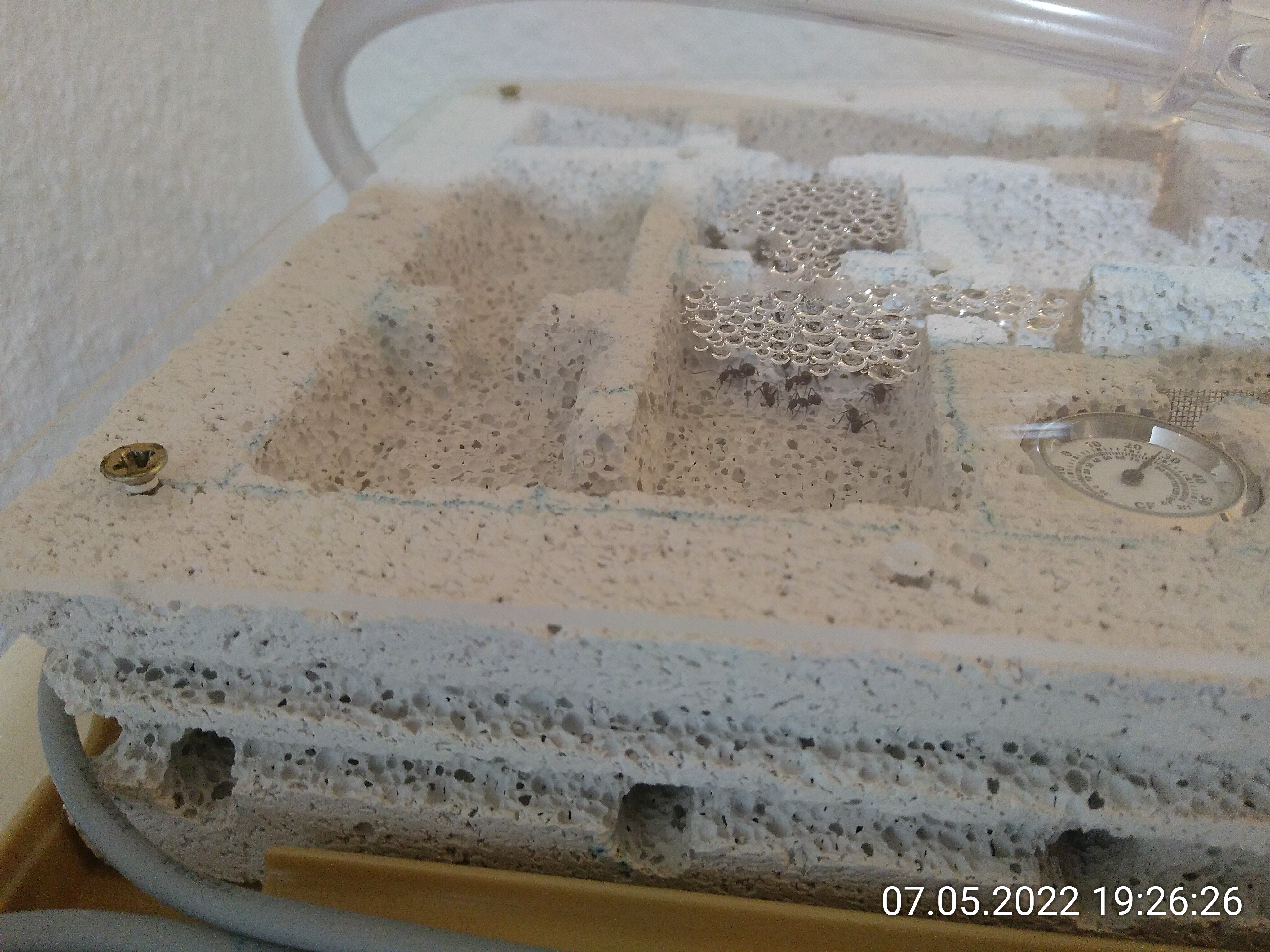 Es war ihnen wohl tatsächlich zu warm. Ich halte fest: Temperaturen über 28 °C bei 80 % LF mögen sie nicht. Bei niedrigeren Temperaturen scheint es erträglich zu sein. Prognose: Morgen ist das Kondenswasser so gut wie verschwunden und in den restlichen Kammern sitzen mehr Ameisen. Sie können übrigens doch über das Gitter klettern. Naja, was soll's...
