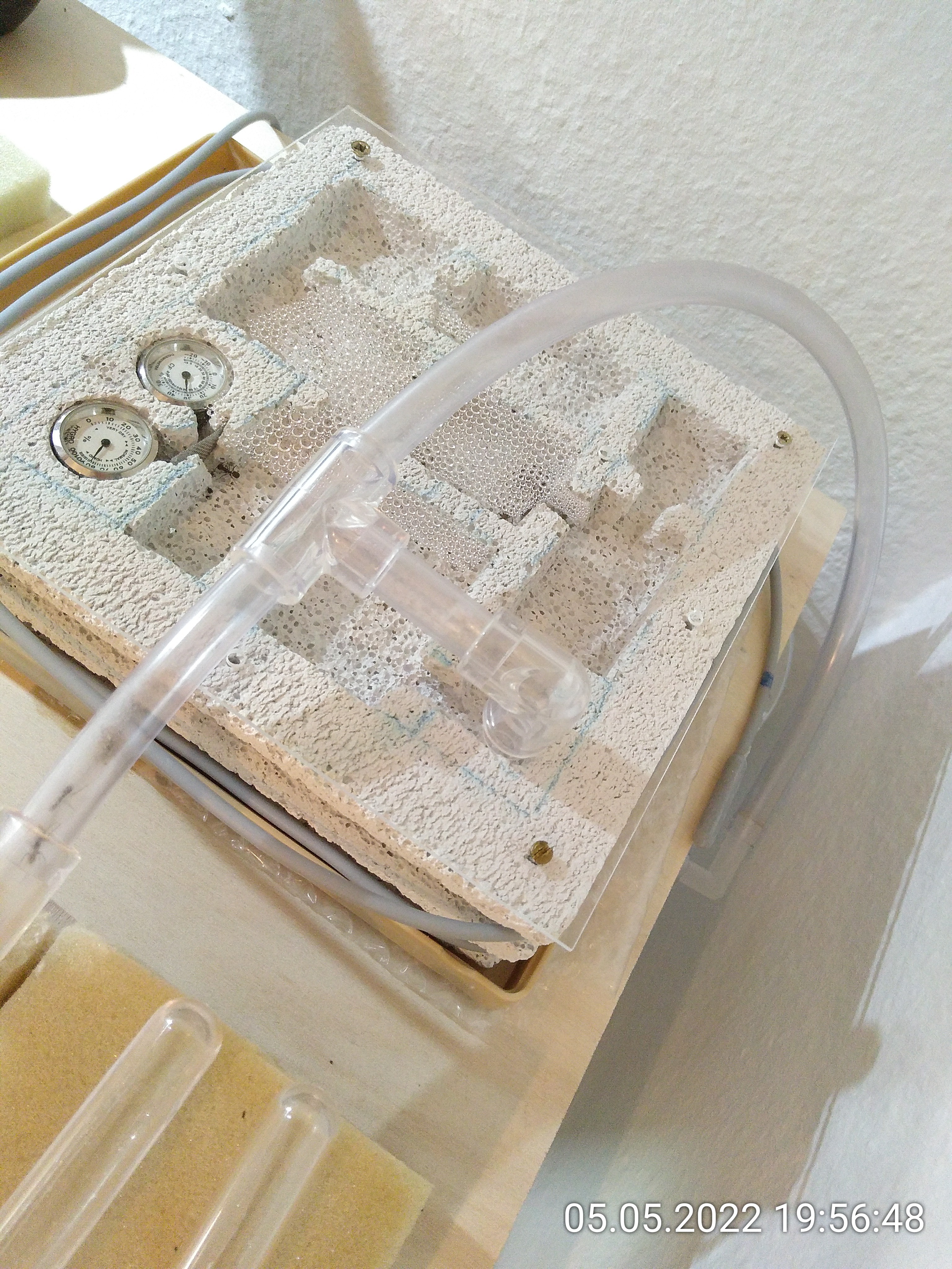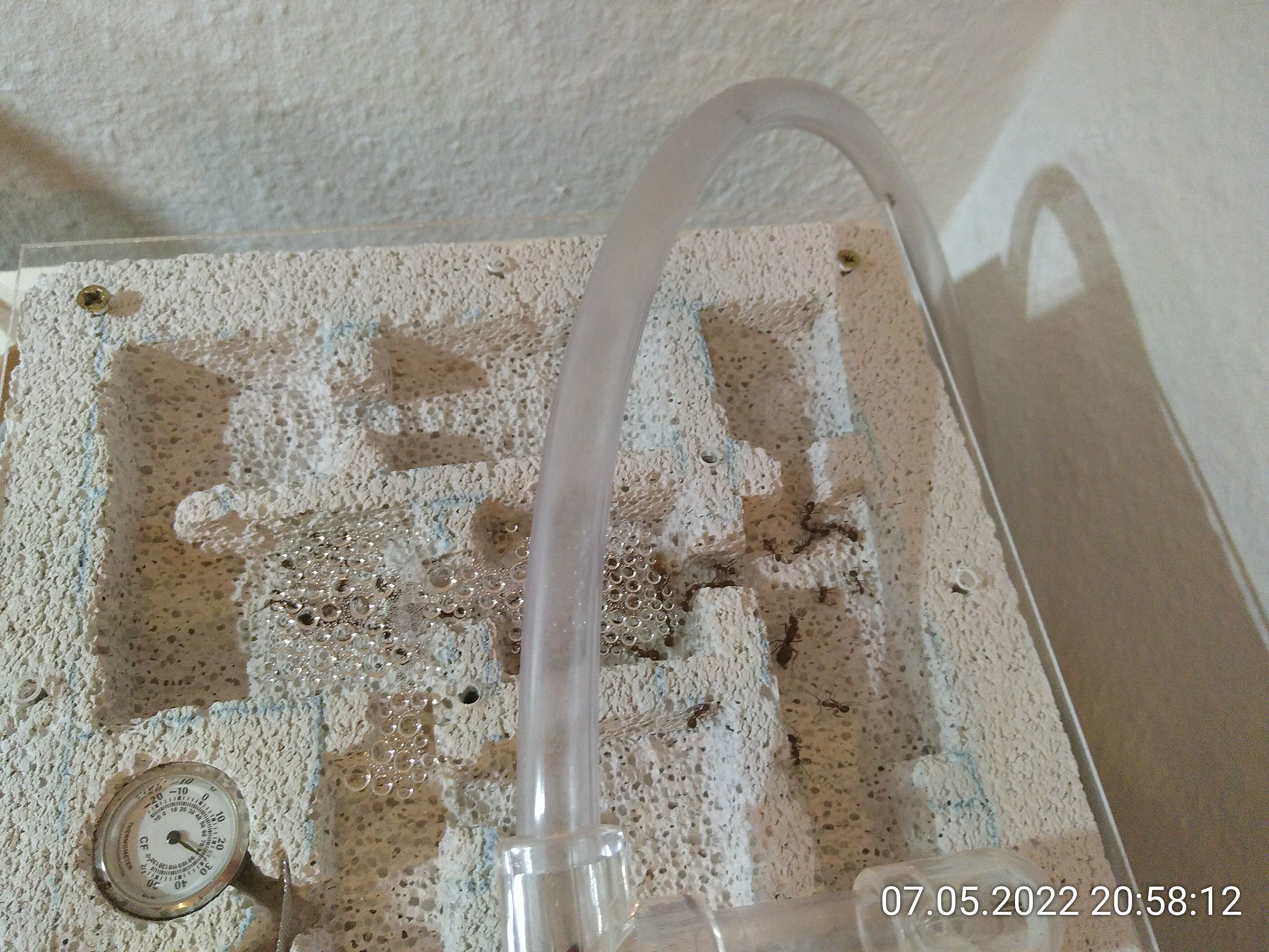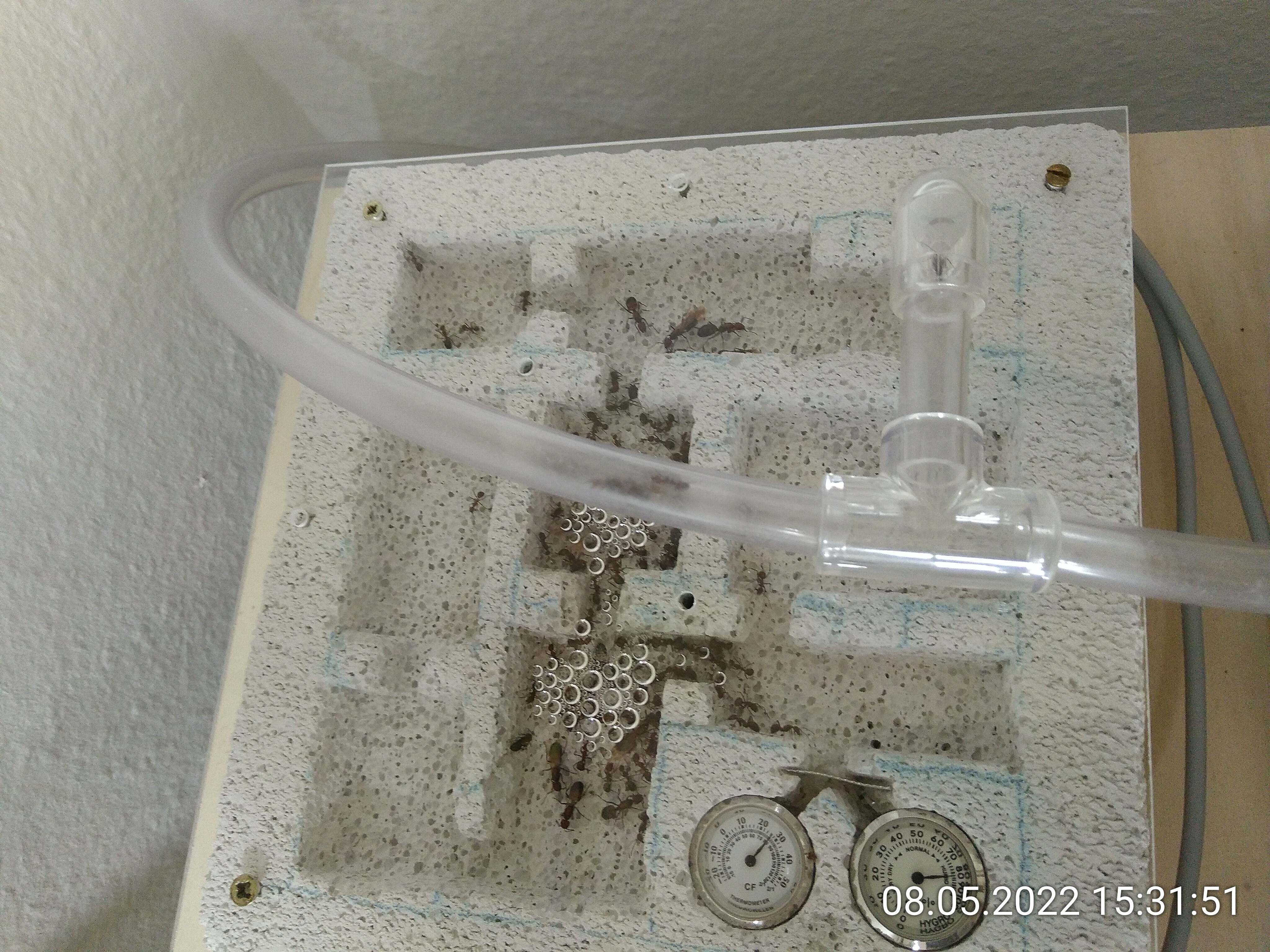 Es war ihnen wohl tatsächlich zu warm. Ich halte fest: Temperaturen über 28 °C bei 80 % LF mögen sie nicht. Bei niedrigeren Temperaturen scheint es erträglich zu sein. Prognose: Morgen ist das Kondenswasser so gut wie verschwunden und in den restlichen Kammern sitzen mehr Ameisen. Sie können übrigens doch über das Gitter klettern. Naja, was soll's...