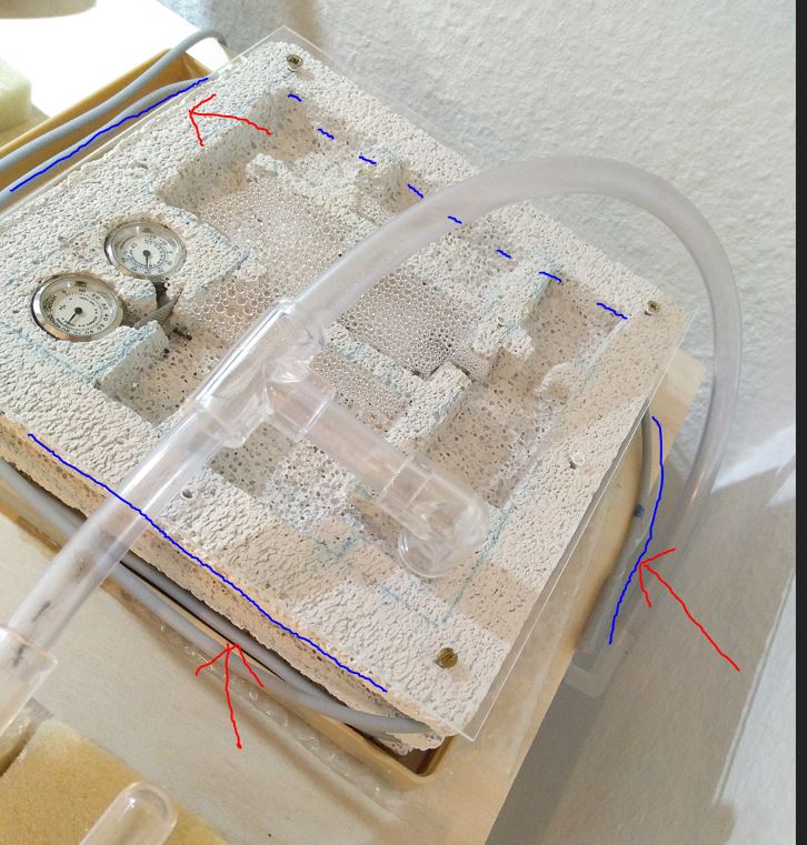 Die letzte äußere Wicklung des Heizdrahts habe ich eben auch noch entfernt. Er läuft jetzt nur noch durch eine Bohrung. Die Heizung steht also auf 1. Wenn das auch keine nennenswerte Änderung bringt, klemme ich das Wasserbett doch nochmal ab und baue einen Luftabzug ein. Vielleicht ein zusätzliches Loch im Plexiglas, verschlossen mit feinem Draht, oder so...
