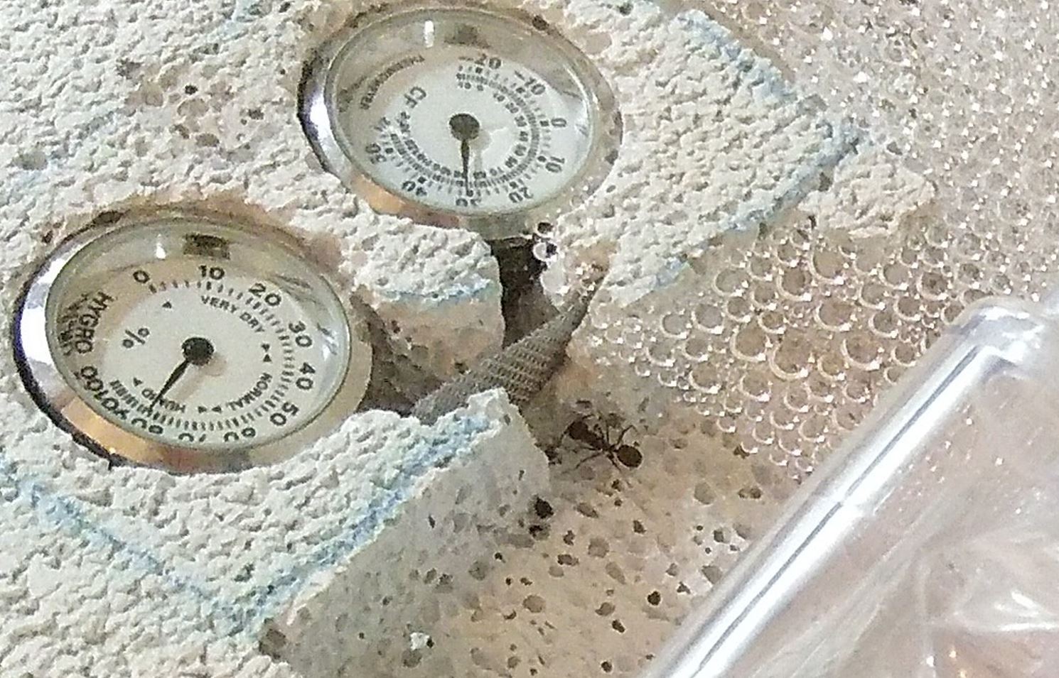 Das habe ich gerade erst entdeckt: Meine Barriere funktioniert. Außerdem muss ich meine Klima-Angaben korrigieren, wie die Nahaufnahme zeigt. Es sind eher 28 als 30°C und über 80 % LF. Der Temperaturfühler sitzt auf der jetzt wärmeren Seite. Mal sehn, ob und wie viel er fällt.
