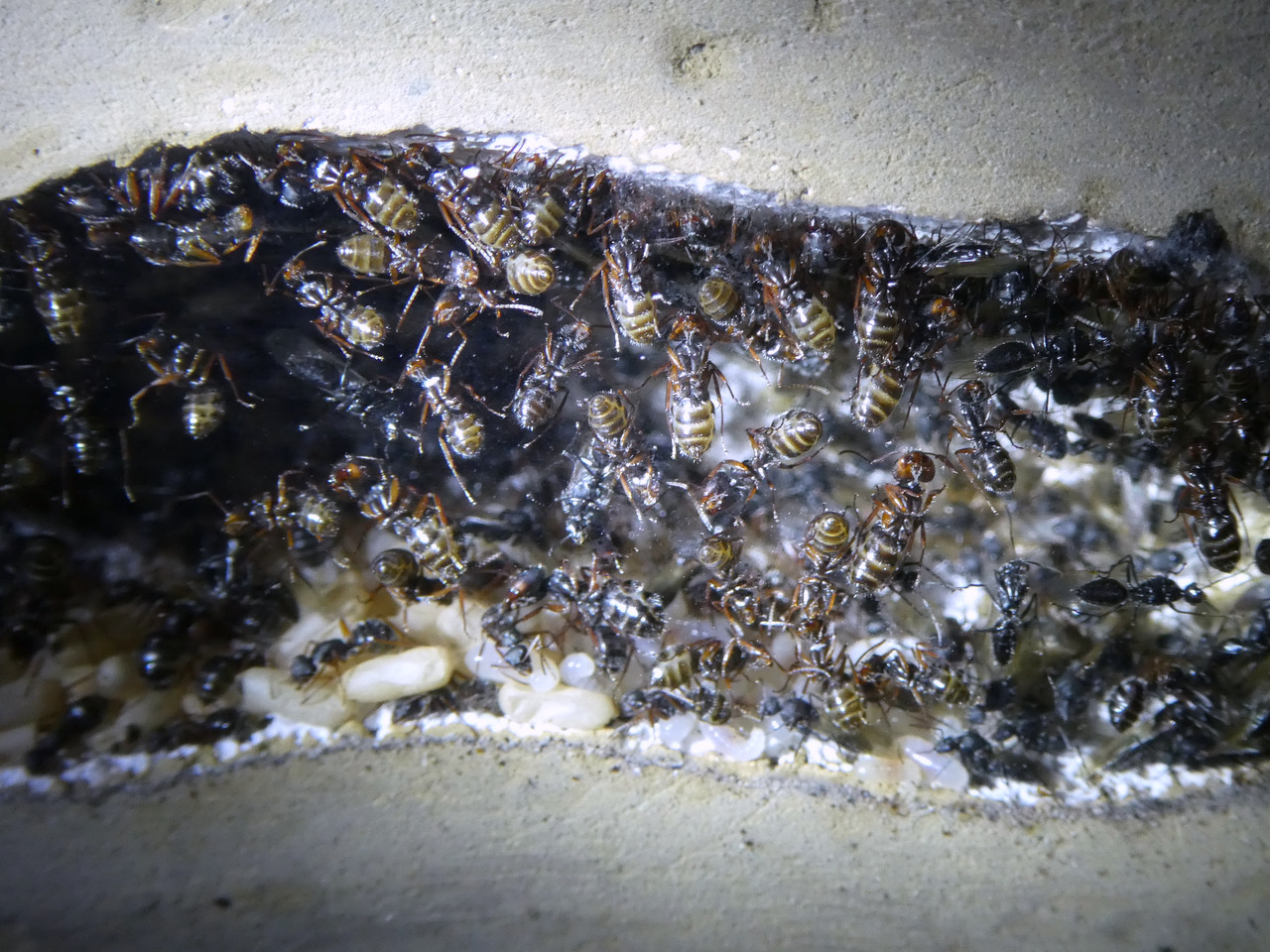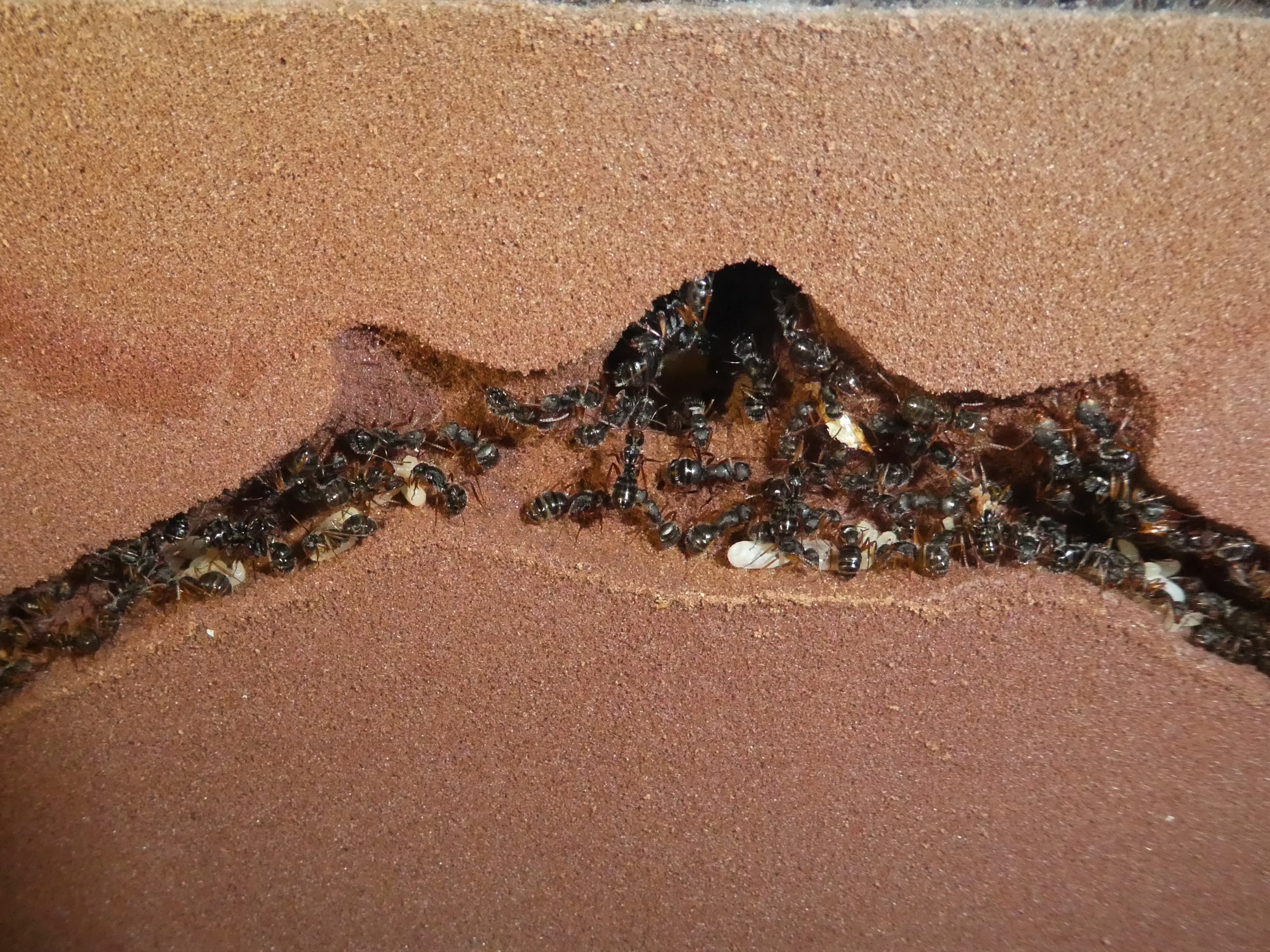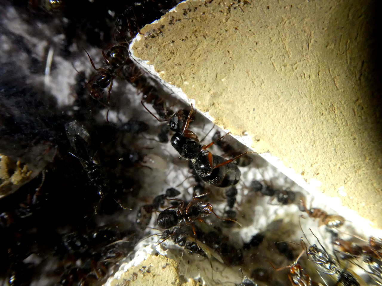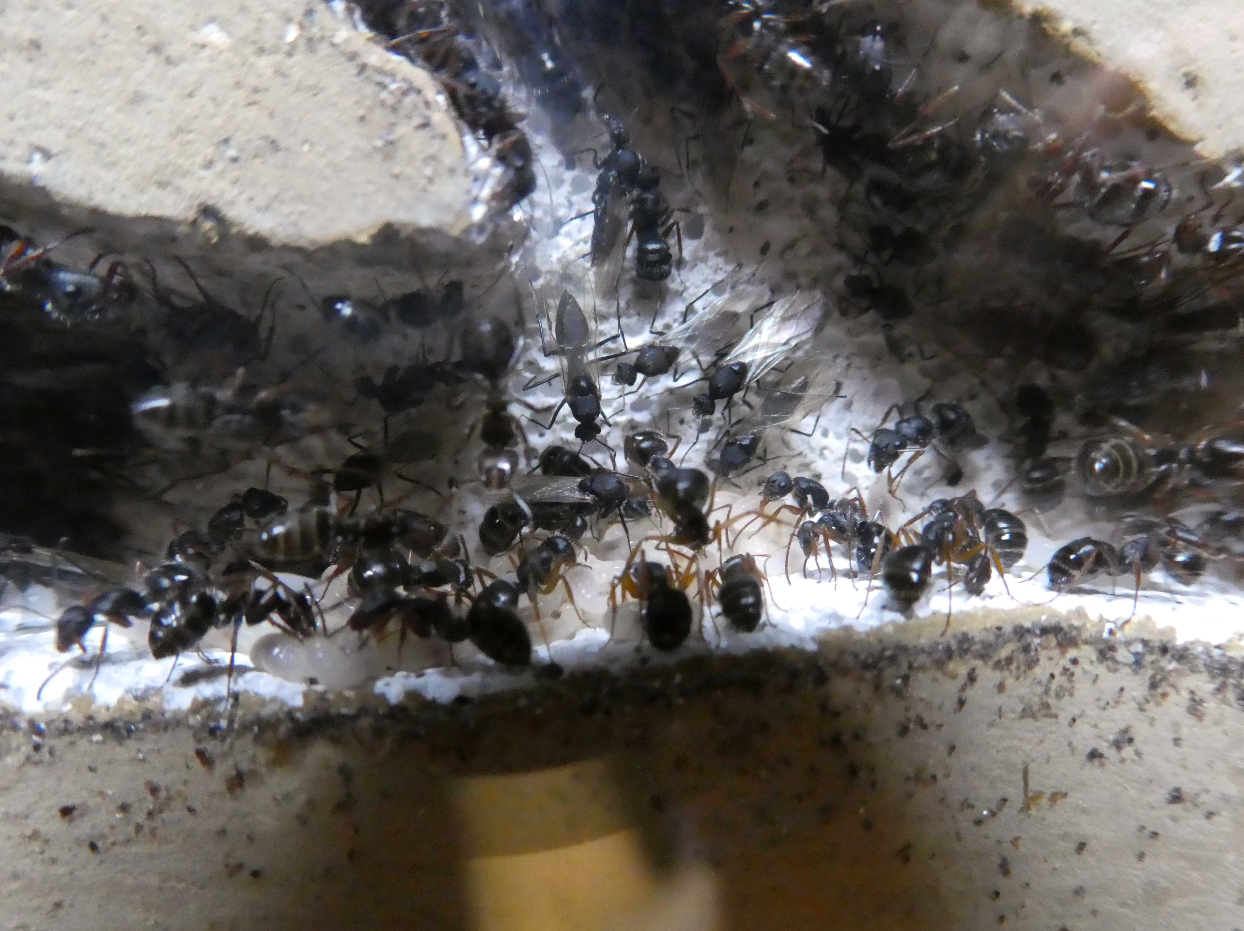 Im Hintergrund ein paar wütende Arbeiterinnen in Angriffshaltung! Sehr temperamentvolle Ameisen.