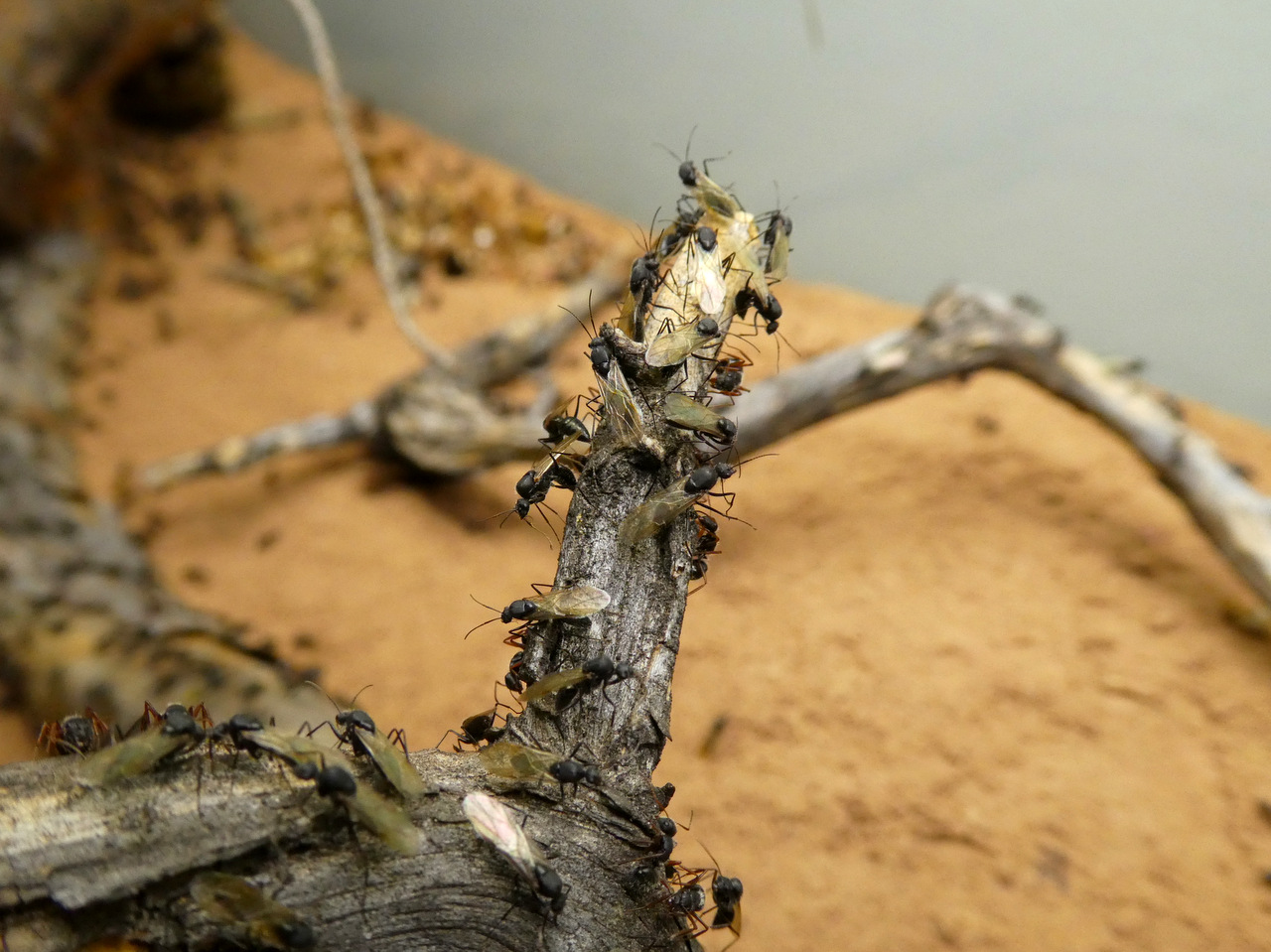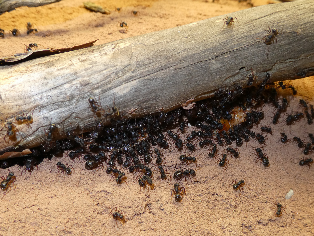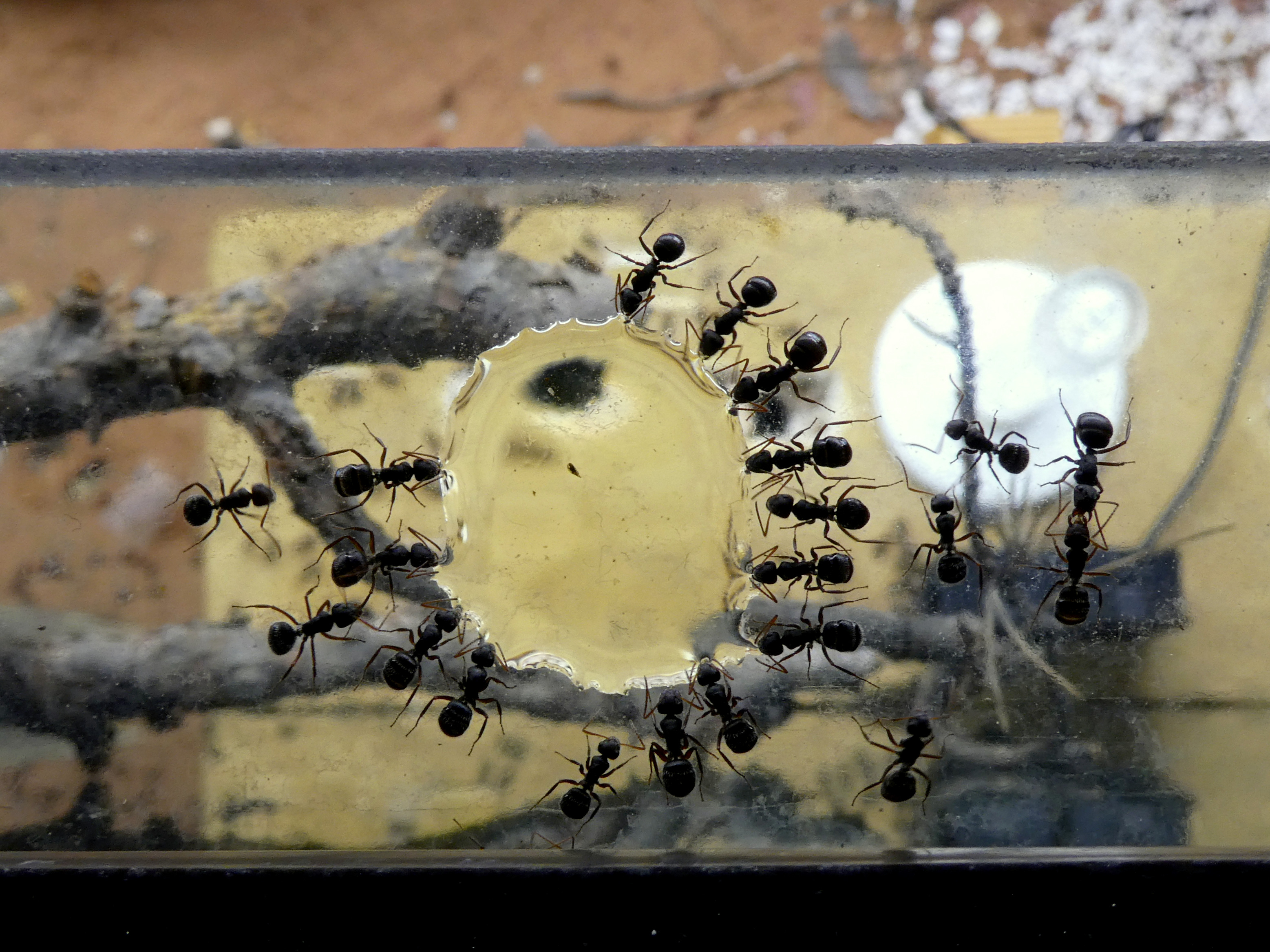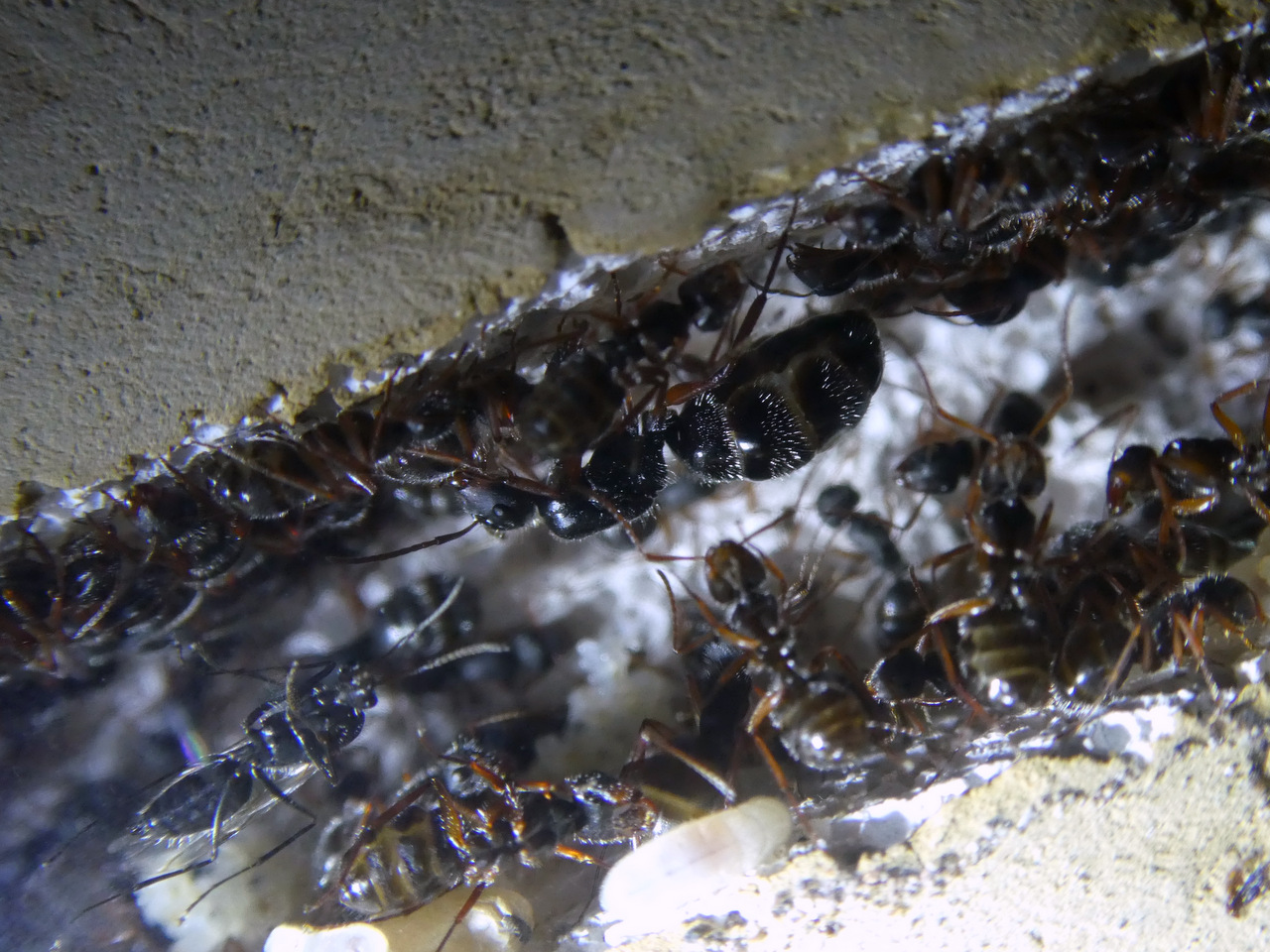 Im Hintergrund ein paar wütende Arbeiterinnen in Angriffshaltung! Sehr temperamentvolle Ameisen.