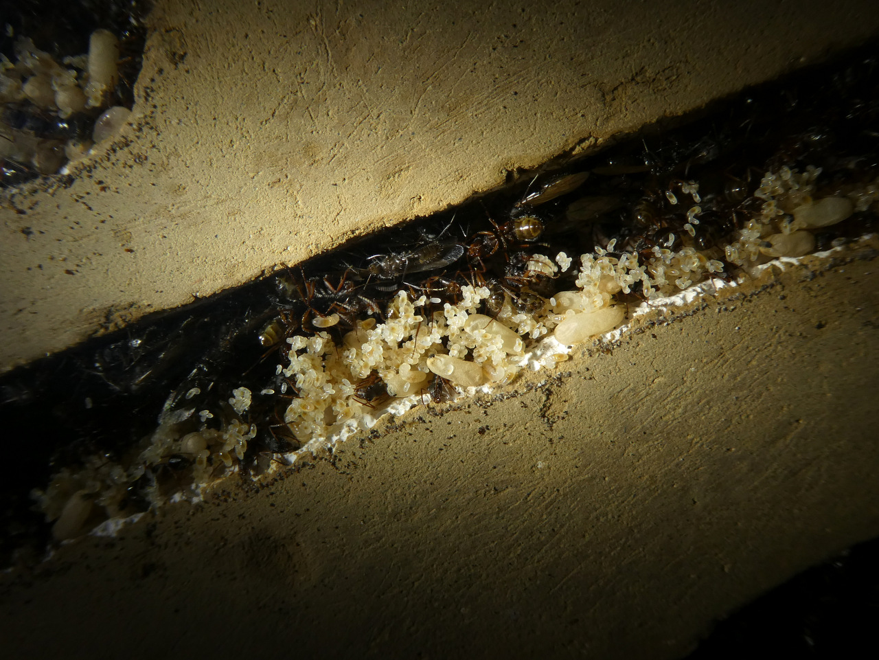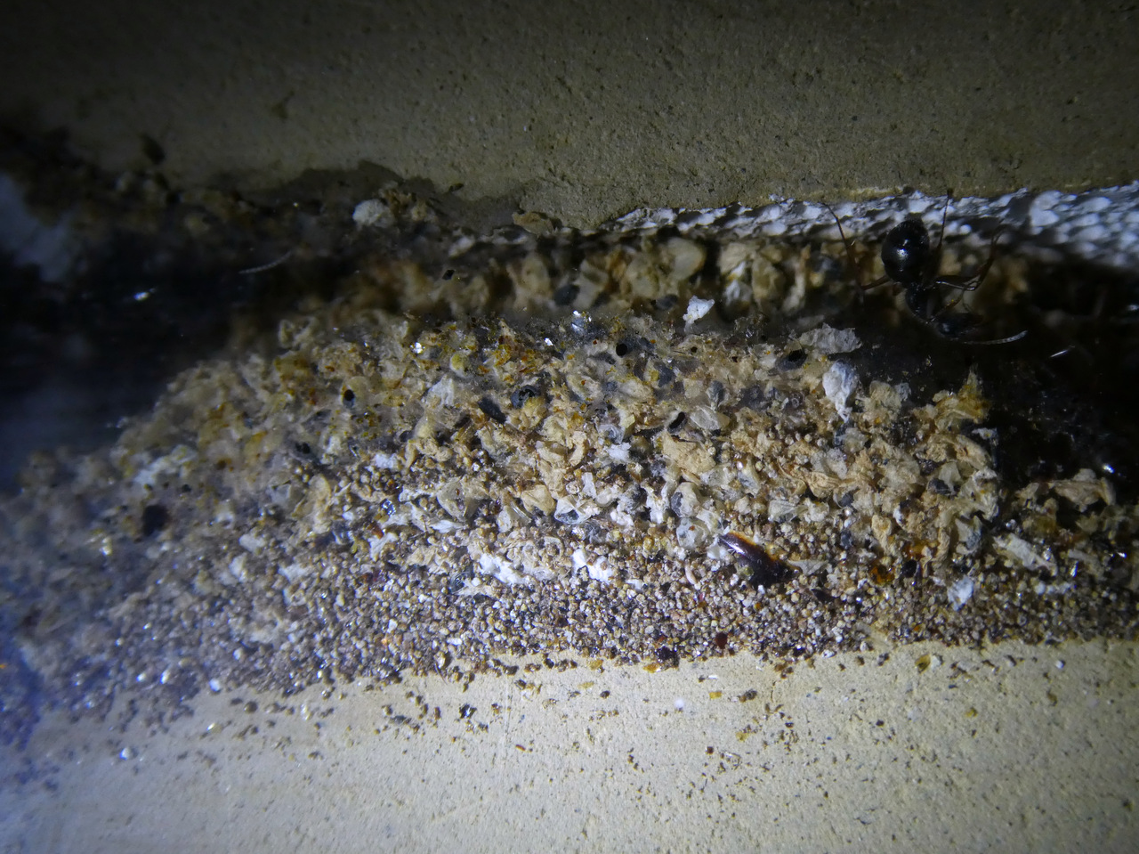 Der Zugang zur letzten Kammer oben rechts wurde mit Puppenhüllen stark verengt, aber was ist das da unten, etwa Ameisenköttel?