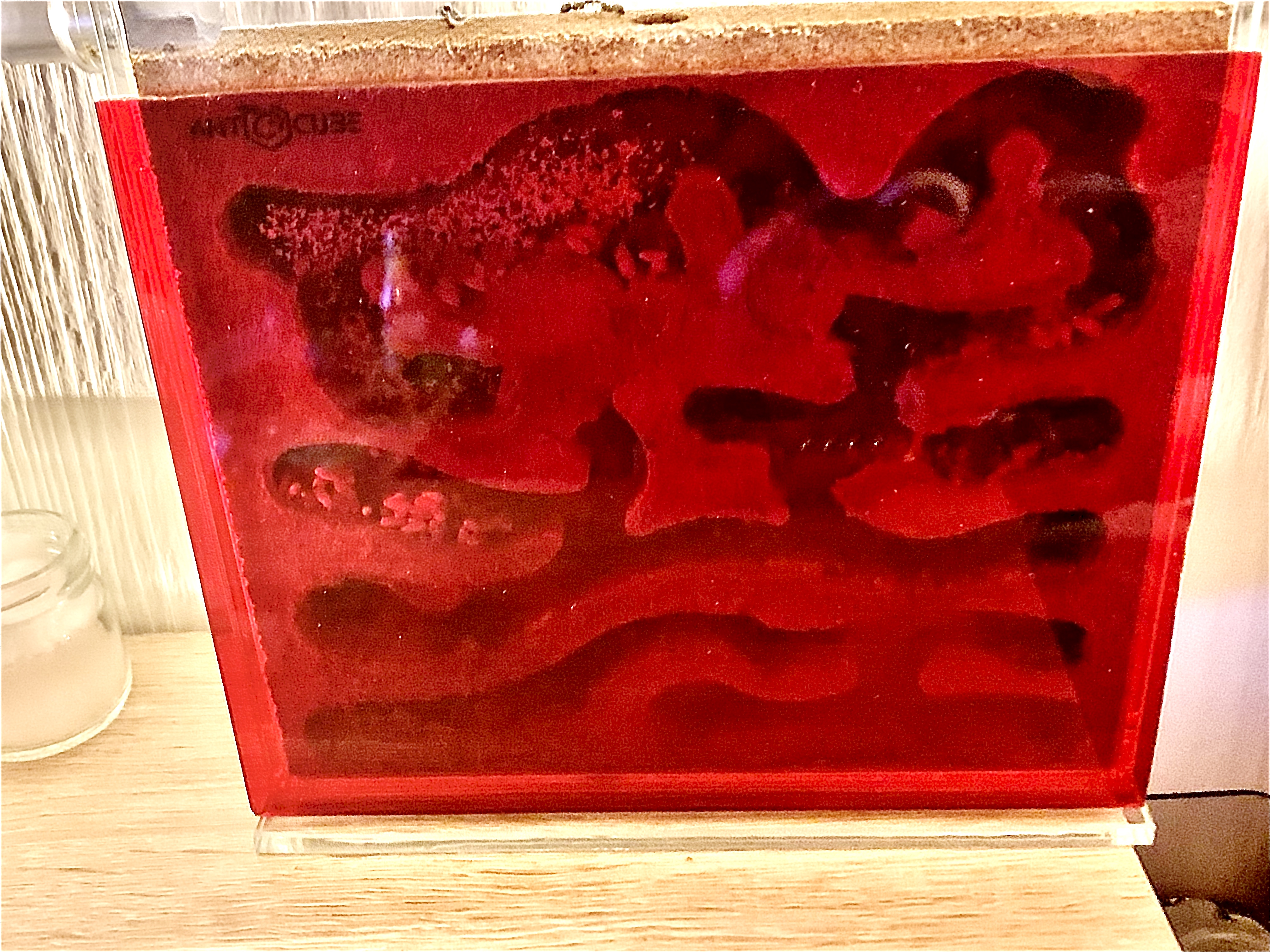 Endlich habe ich heute in einem Baumarkt blutrotes transluszides Plexiglas gefunden! Ich habe das nun zugeschnitten und klemme es dann an das Nest!