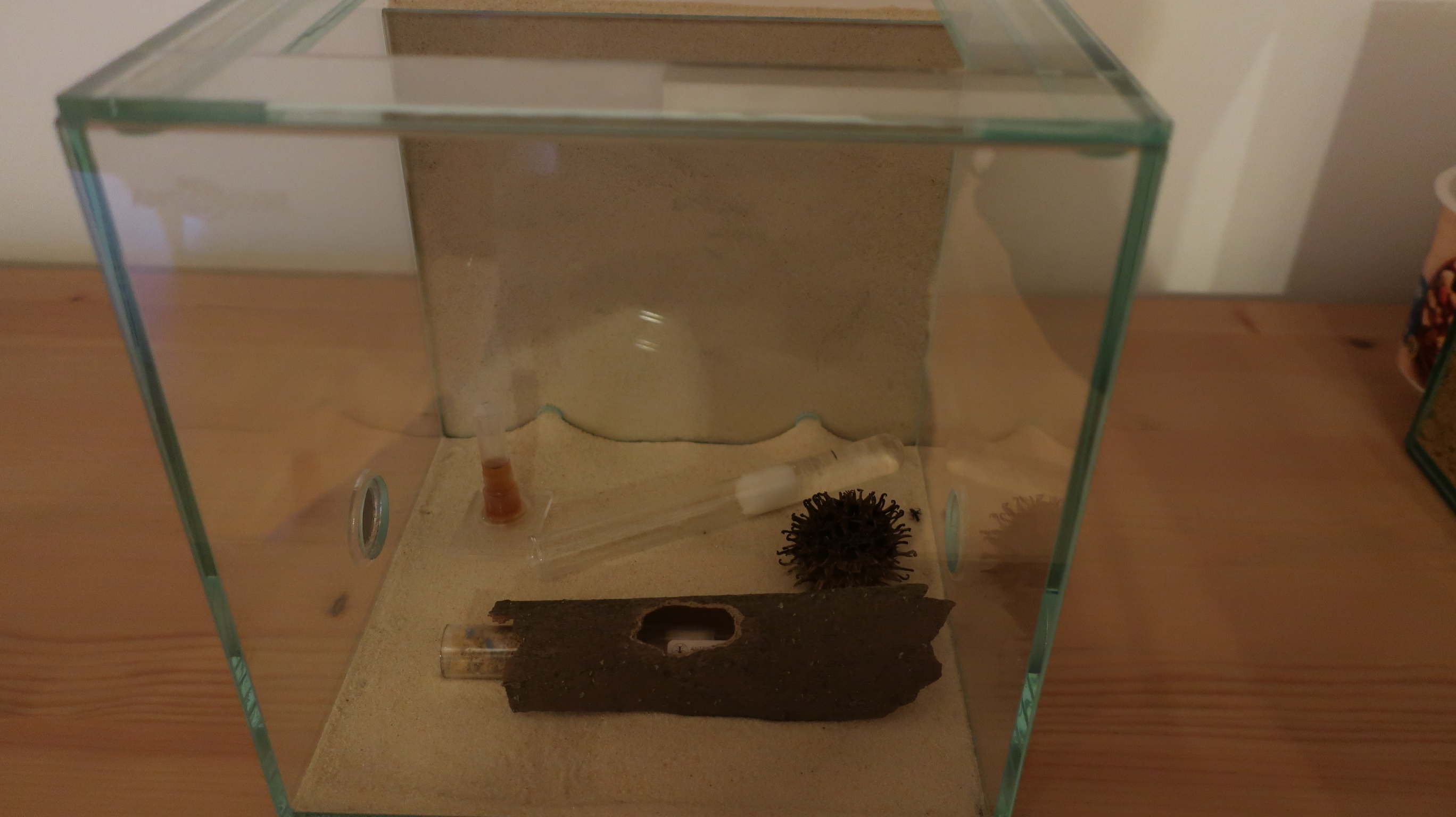 meine Ameisen entwickeln sich prächtig . Wie gern ich das Schreiben würde. Unterm Strich lässt sich sagen, dass sie ihren Eingang wieder geöffnet haben und gelegentlich eine Arbeiterin rauskam. Ein gutes Zeichen, möchte man meinen. Aus logistischen Gründen hatte ich ihnen eine neue Arena gemacht.
