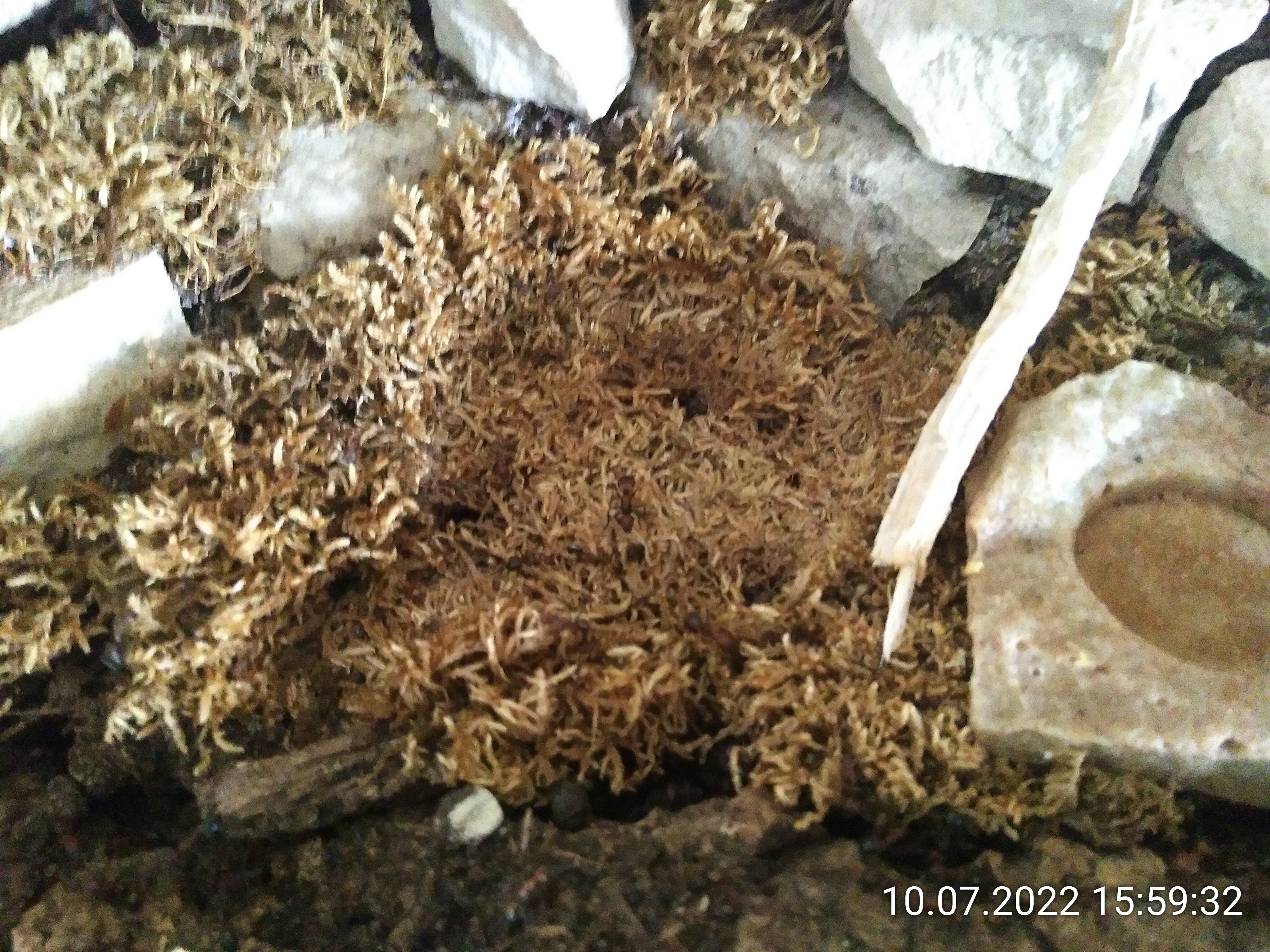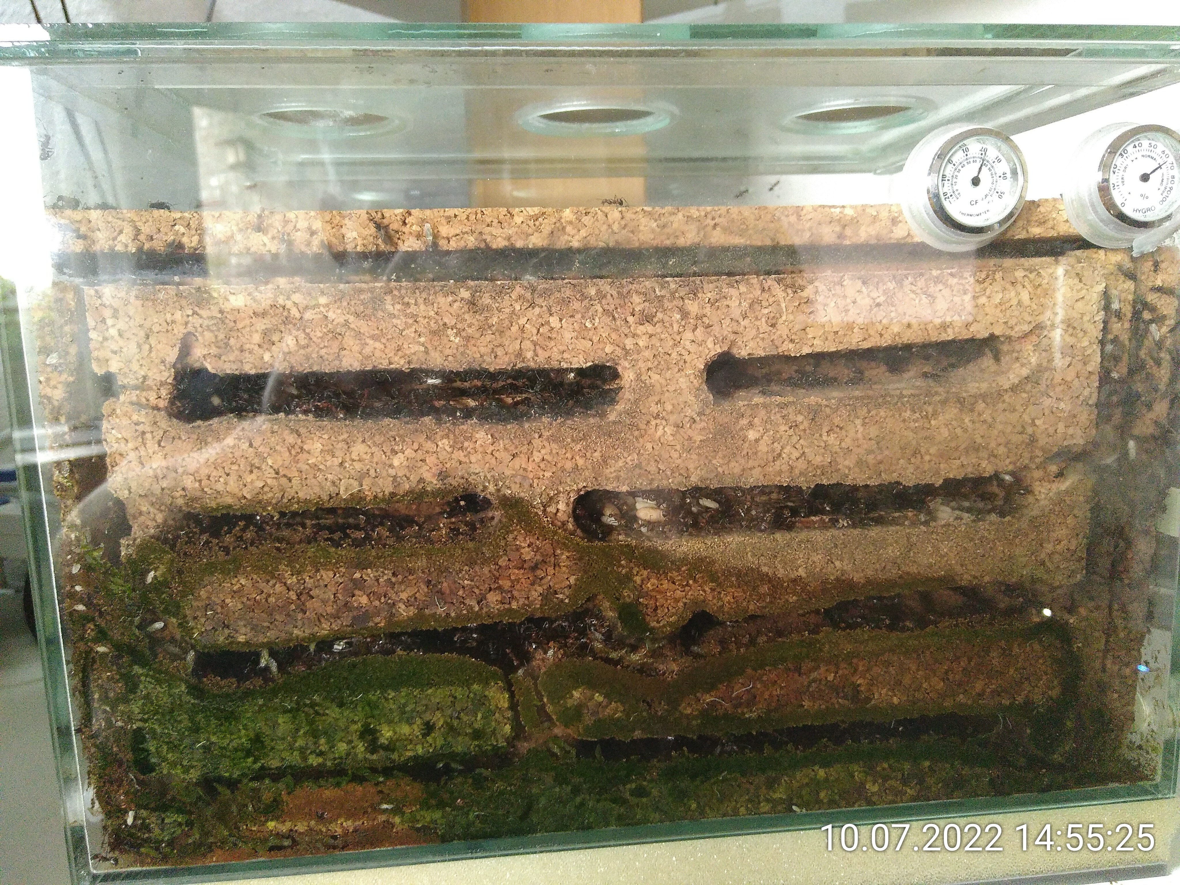 Und weil das Lab heute Nachmittag sehr leer war, habe ich die Chance genutzt. Es war nur eine Ameise im Eingengsbereich und die anderen konnte ich alle mit dem leeren RG "entsorgen". So sieht es nach zwei Wochen dort aus:
