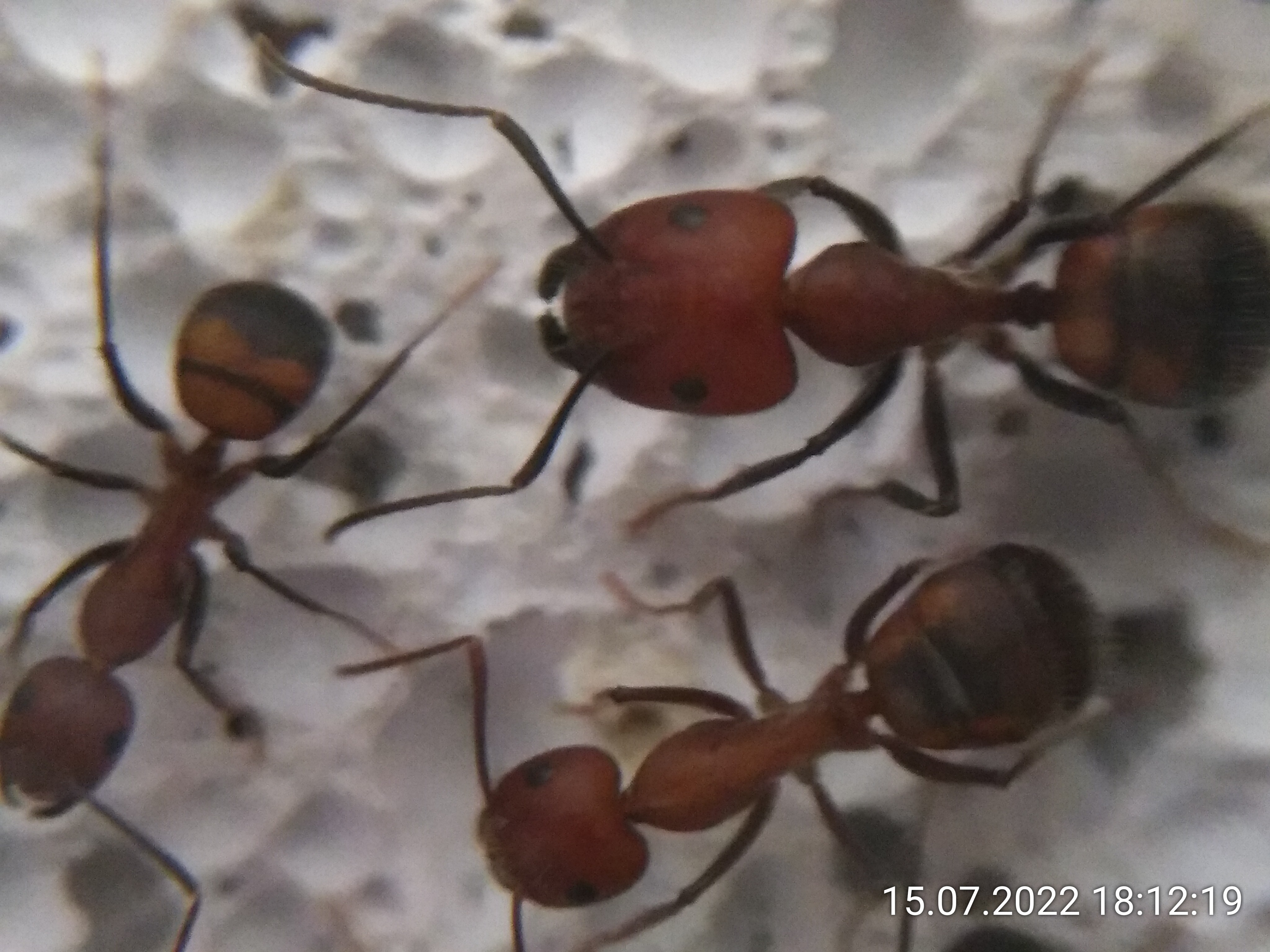 Außerdem war da noch eine Makrolinse. Und die könnte evtl. gute Bilder bringen. Die ersten Versuche finde ich vielversprechend. Es gibt nur ein paar Probleme damit. Zum einen muss ich wirklich sehr nah an die Ameisen ran. Fast so nah, dass sie auf's Handy klettern können. Und sie dürfen sich nicht bewegen. Und vor allem: Ich darf mich nicht bewegen! Aber so ruhige Hände habe ich nicht. Außerdem mache ich ständig mit dem Handy Schatten auf den Bereich, den ich fotografieren will. Und dann ist da auch noch die Klammer oben am Handy, die es größer und damit schwerer macht, an schwer zugänglichen Stellen (also eigentlich überall :) ) zu fotografieren. Kein gutes Setup für Schnappschüsse.