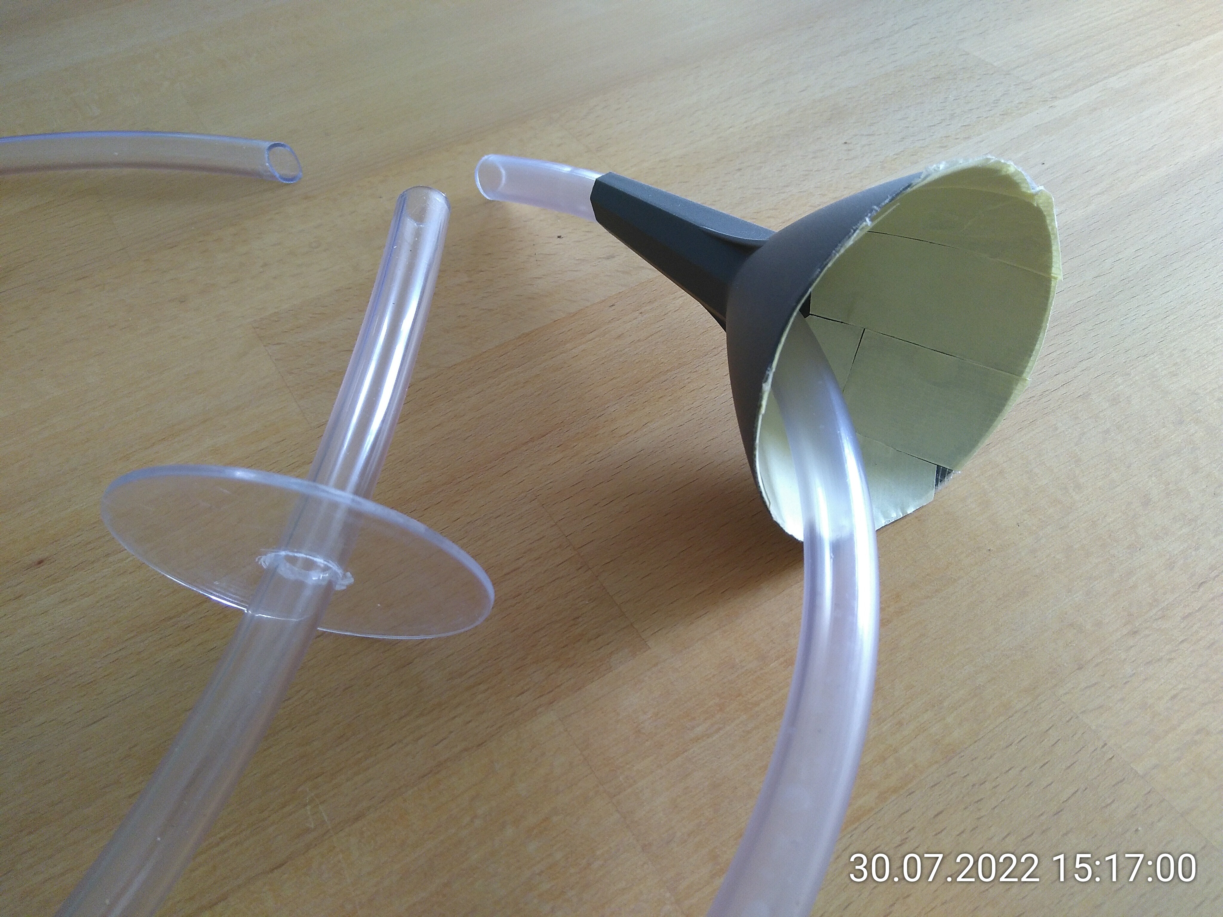 Das ist eine Plexiglas- (oder Plastik-) Scheibe, an die ich mich erinnert habe. Ich weiß nicht mehr, woher sie kommt, aber ich habe sie damals extra nicht weggeschmissen, weil ich dachte, dass ich sie mal brauchen könnte. Ich musste nur ein Loch hineinbohren. Der Schlauch passt perfekt. Ich werde jetzt mal versuchen, die Scheibe mit Talkum-Wasser-Gemisch einzustreichen. Das habe ich noch nie gemacht. Aber wegen der senkrechten Fläche habe ich Bedenken, Öl einzusetzen. Wenn das nicht funktioniert, kommt wieder das Doppelklebeband zum Einsatz.