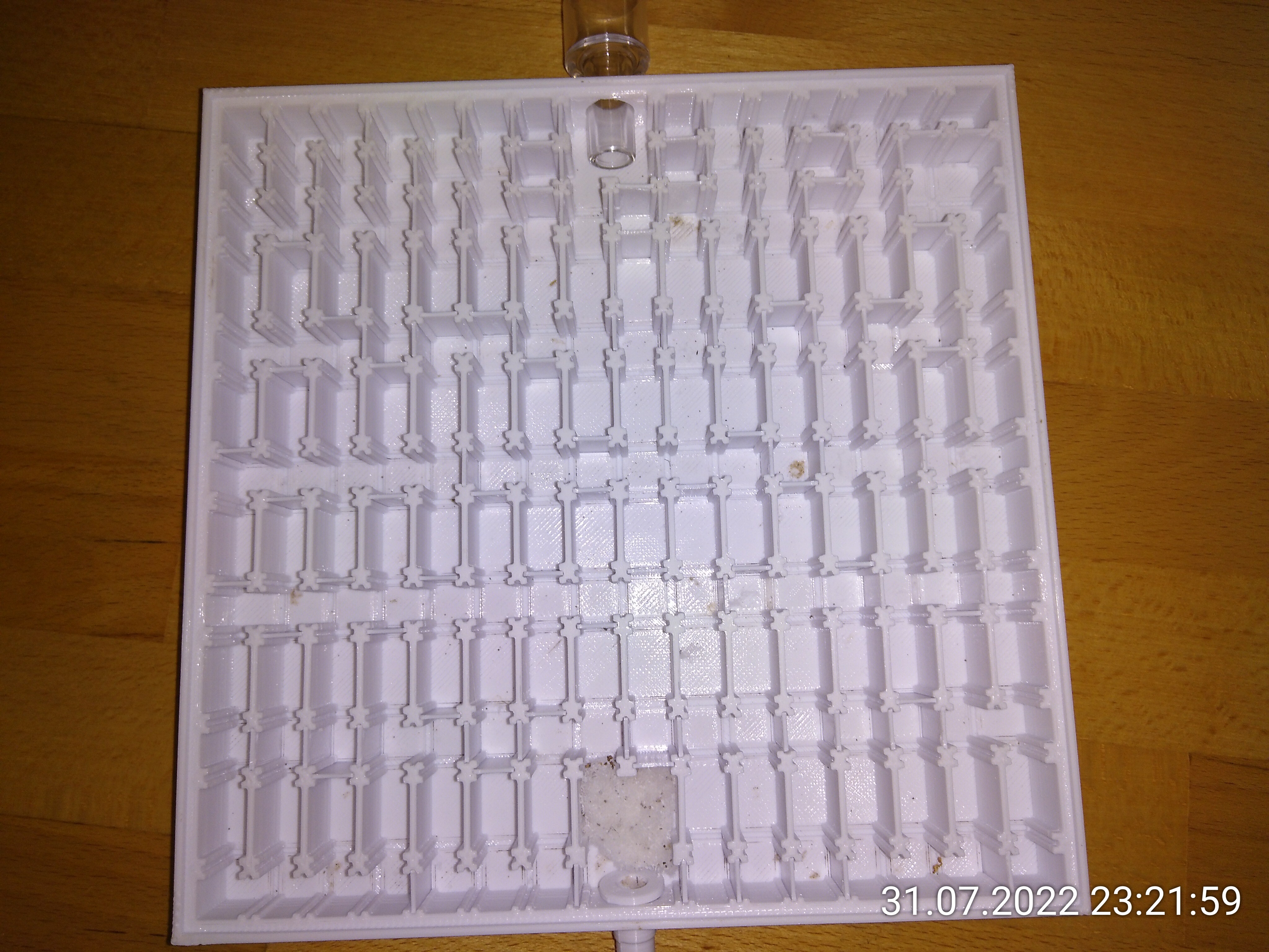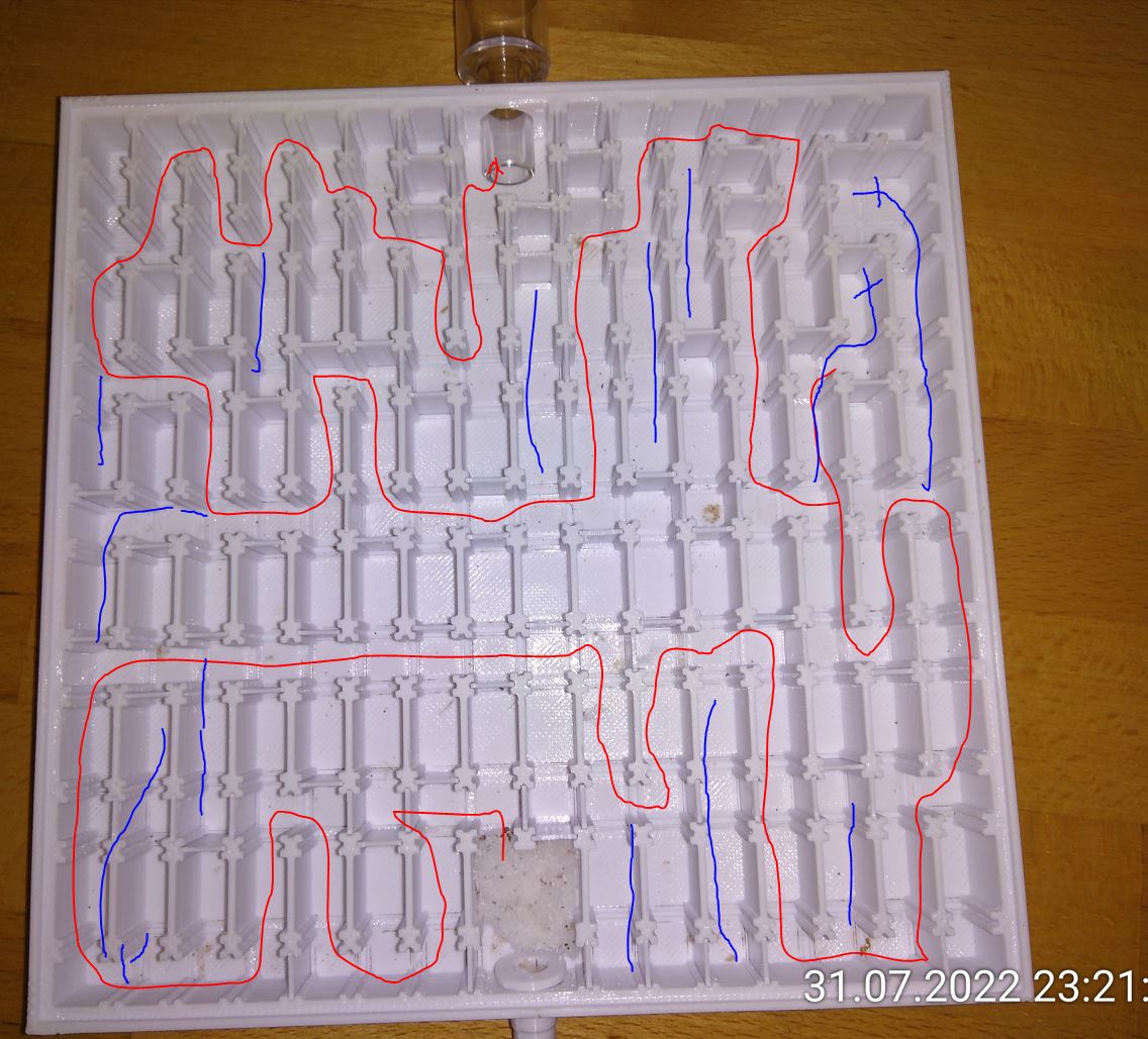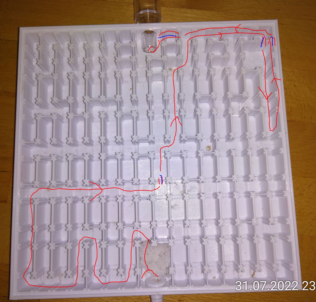 Die erste kann es gar nicht abwarten und klettert aus dem Schlauch über das noch leicht geöffnete Glas (Ich muss von innen beim Anschließen gegendrücken) ins Lab und startet gleich bei 10 %. Aber erst als Verstärkung kommt, geht sie weiter. Nummer 2 kürzt bei 30 % auf 60 % ab, läuft dann aber wieder Richtung Eingang. Sie klettert wieder über eine Wand, sucht die Glaskante ab und dreht wieder um. Dann nimmt sie wieder eine Abkürzung, klettert auch über die nächste Wand und ist am ZIel. Das war gemogelt! Und zwar ziemlich dreist. Man könnte es aber auch zielstrebig nennen. Wie auch immer... 5 Minuten