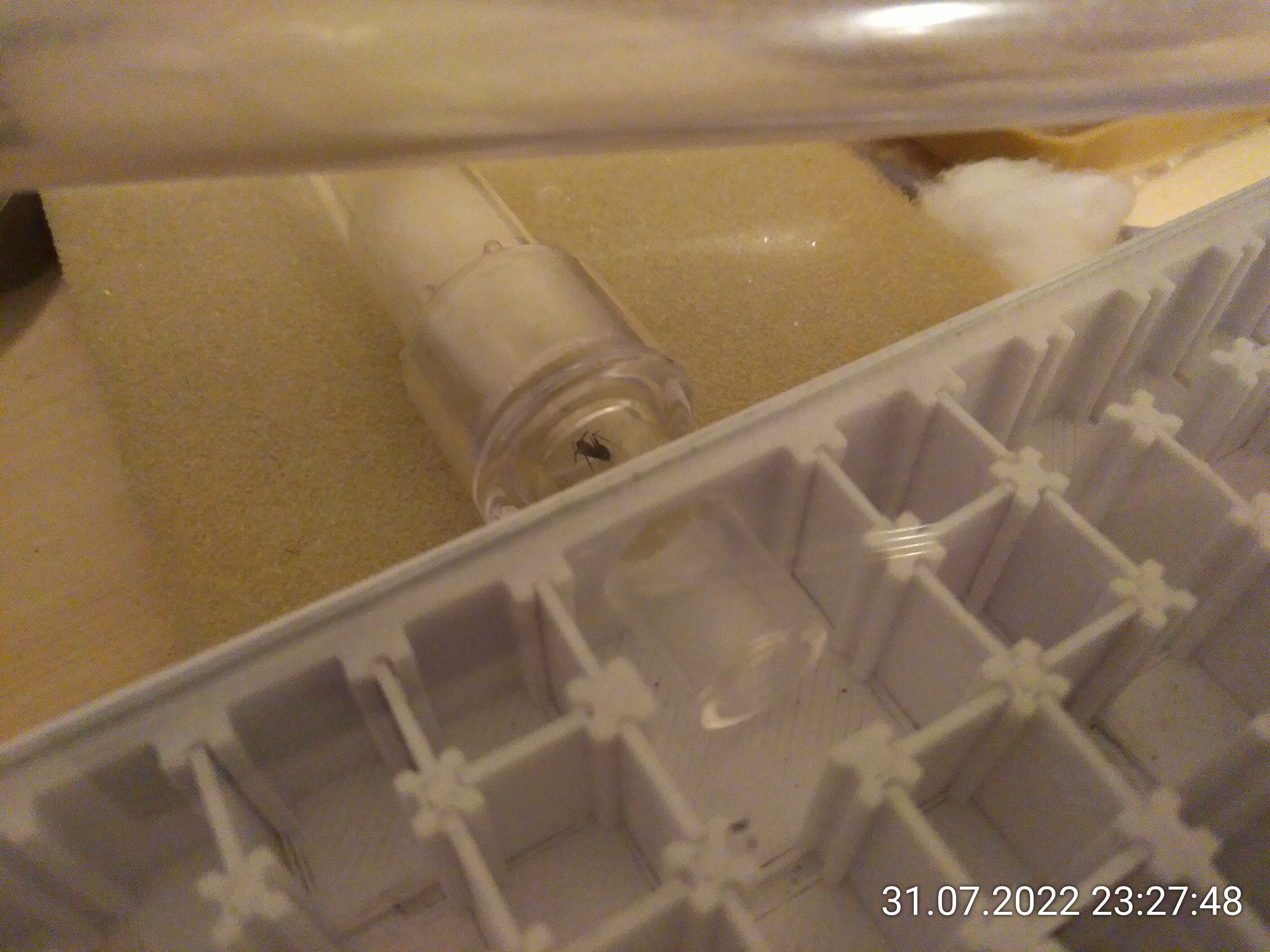 Da ich im Homeoffice war, konnte ich das nicht beobachten und habe sogar vergessen, ein Foto zu machen. Nach gut einer Stunde habe ich wieder nachgeschaut. In der Verpackung hat sich nichts mehr bewegt. Alles Lebende hatte es verlassen... Dachte ich, bis ich eben das Foto der "leeren" Verpackung gemacht habe.