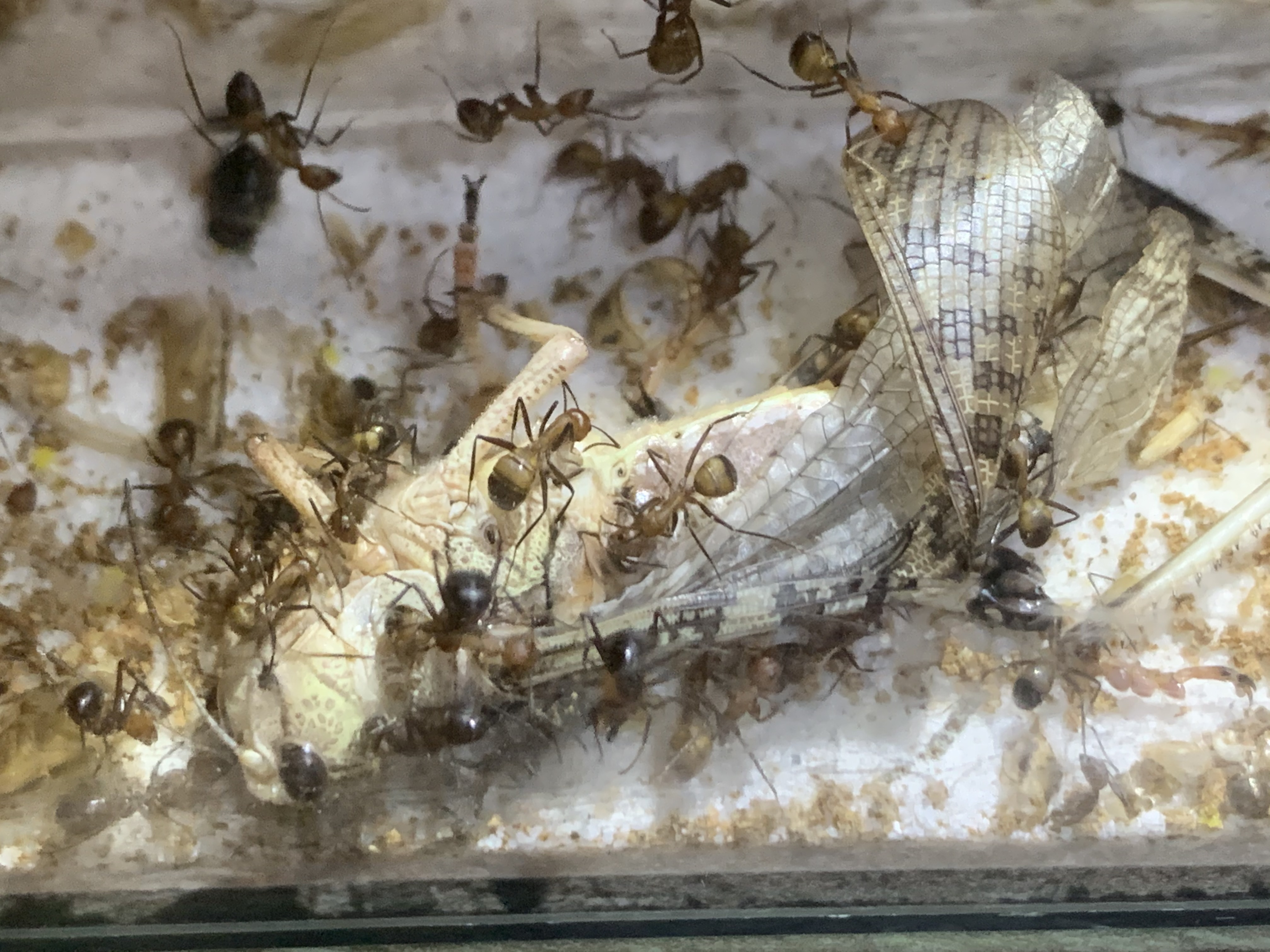 Habe meinen Camponotus nicobarensis vorhin die gröĂte Heuschrecke die ich auf die schnelle kriegte lebend hineingeworfen, es ist das erste Mal wo sie eine Heuschrecke kriegen, knapp eine halbe Stunde spĂ€ter sind sie bereits dabei diese Heuschrecke zu zerlegen!