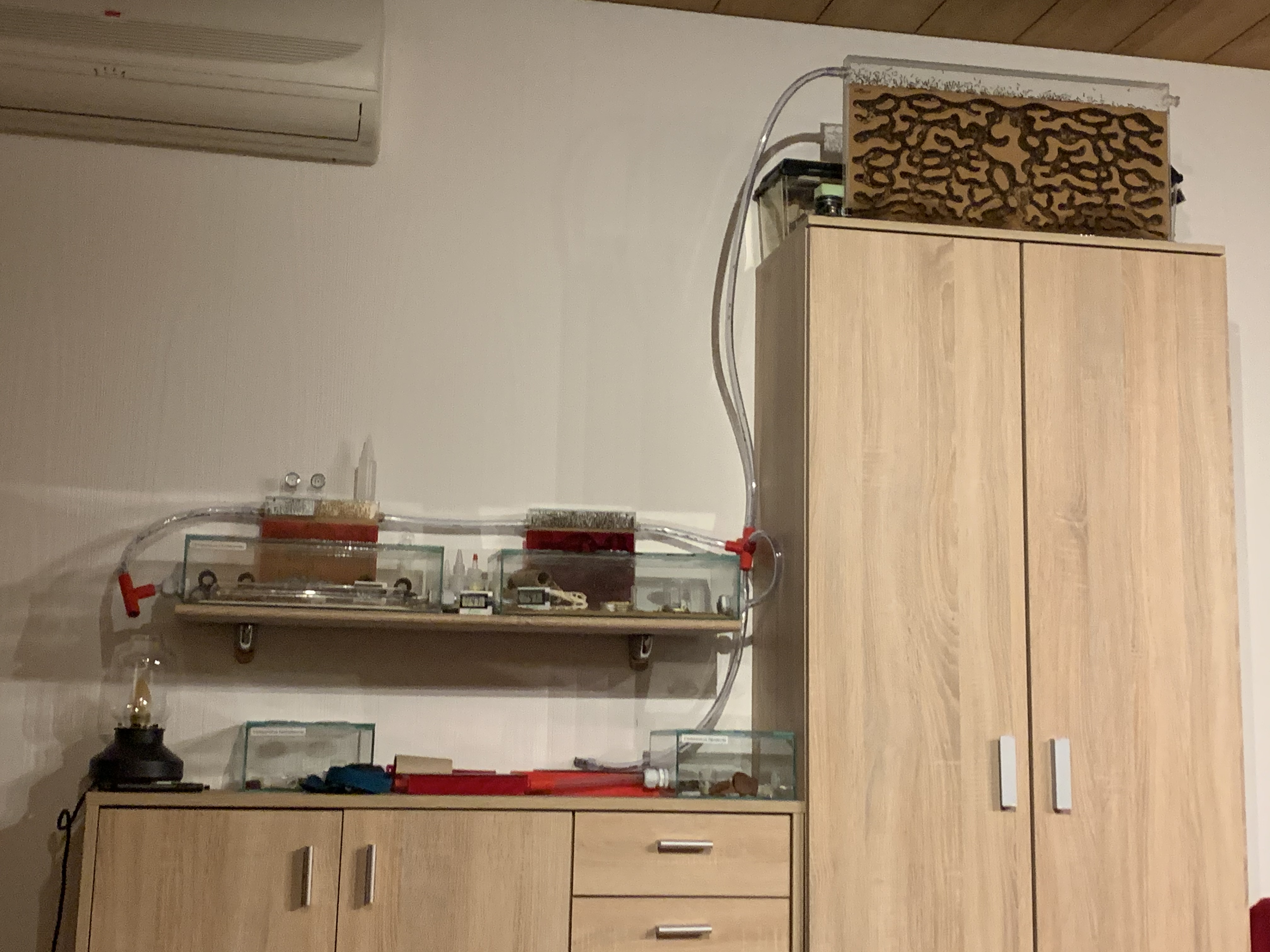 Und nun: im Schrank unter dem Plattenbau waren zwei Tablare fĂŒr mein Ameisenhobby, da hatte ich in Kisten, GlĂ€ser, Honig, Pinzetten, Pipetten, Futter fĂŒr die Futtertiere (Heimchen, Heuschrecken), WasserbehĂ€lter, Kronkorken, ein Kleines GrĂŒnderformicarium, Antstore-Zubehör, Invertzucker... etc etc usw.